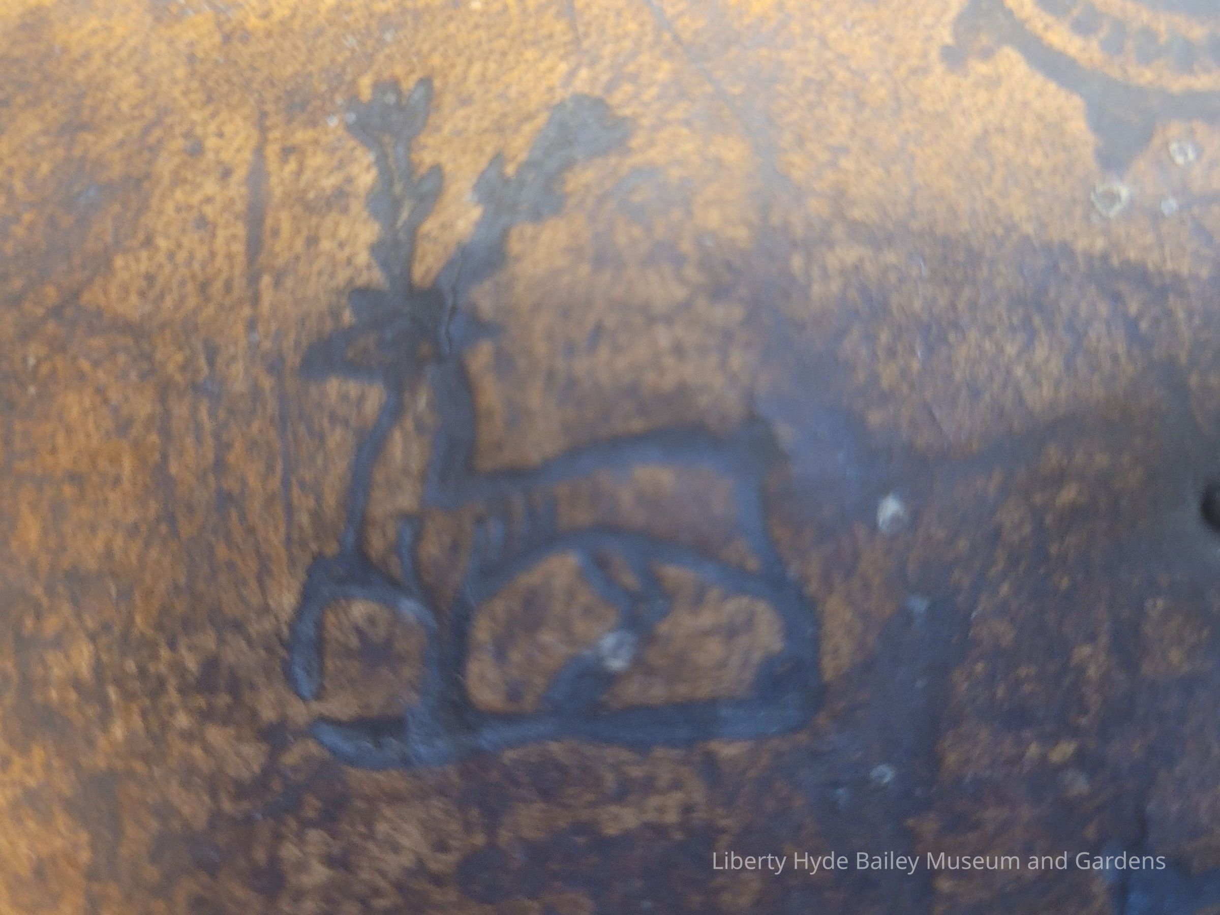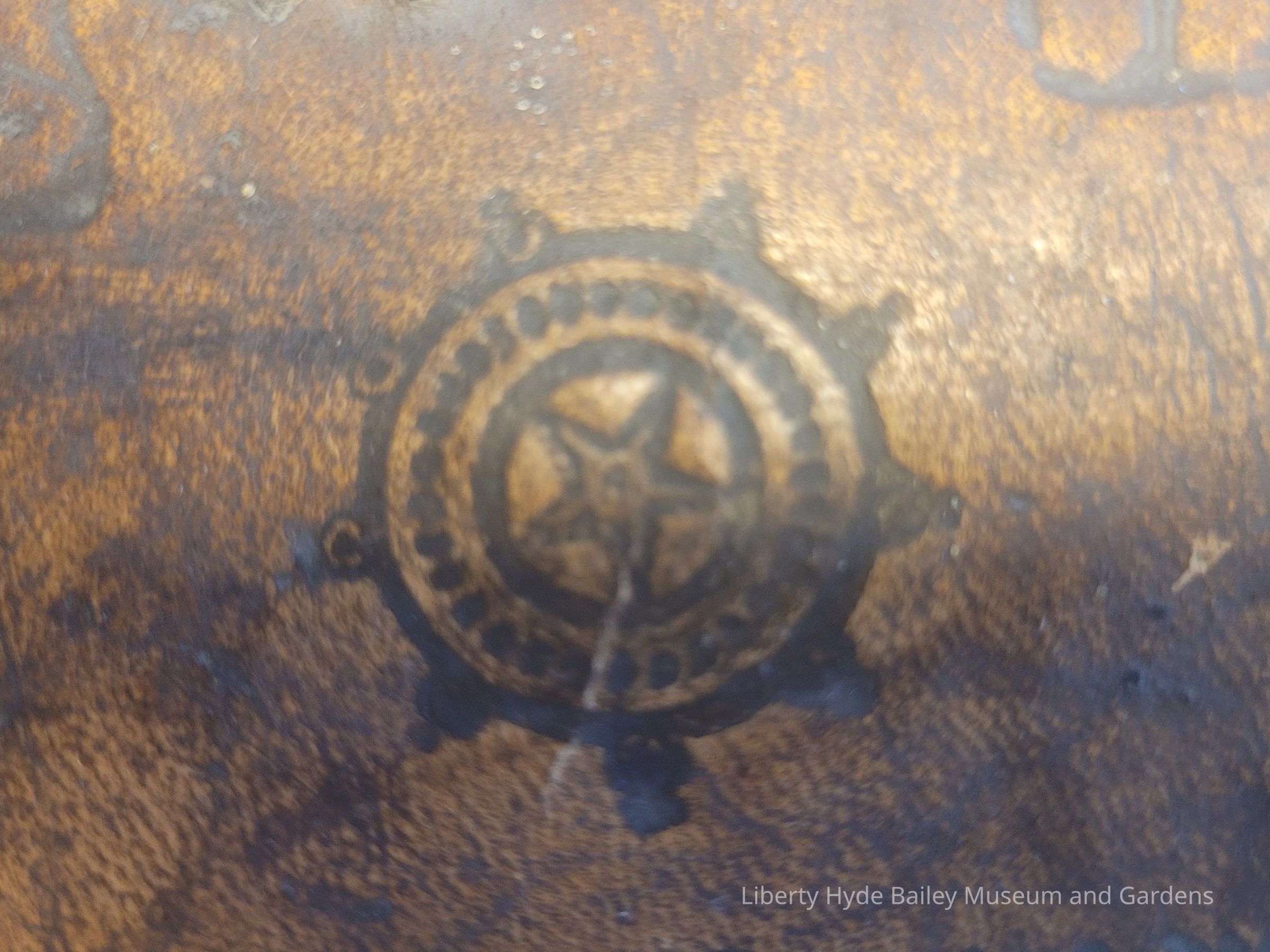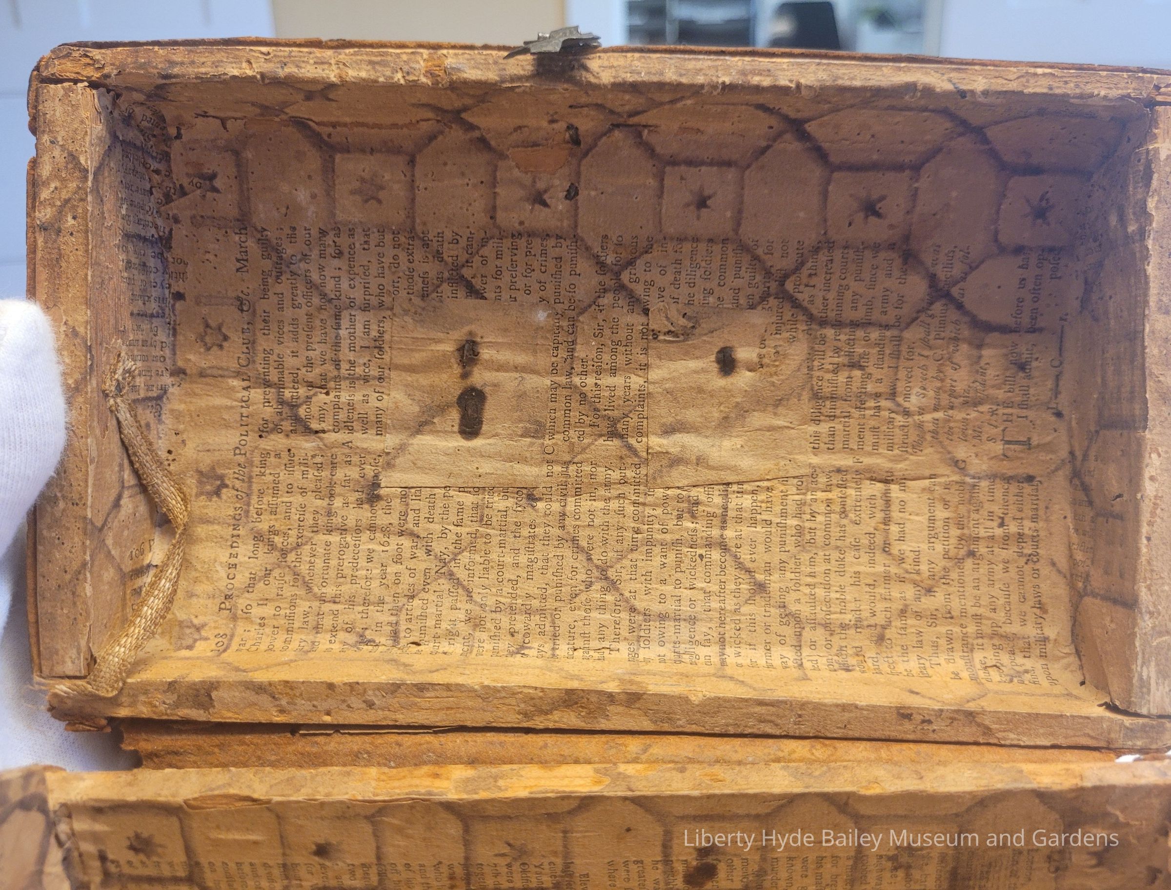 Small wooden trunk with embossed leather covering, the interior lined with newspaper. Metal handle and lock. Past documentation indicates that it was made by Jeshurun/Jesurun (Jesse) Walker (1748-1813), Liberty Hyde Bailey's great-grandfather who came to the U.S. from England at eleven and fought in the American Revolution. However, birth records indicate Jesse Walker's place of birth to be Massachusetts.