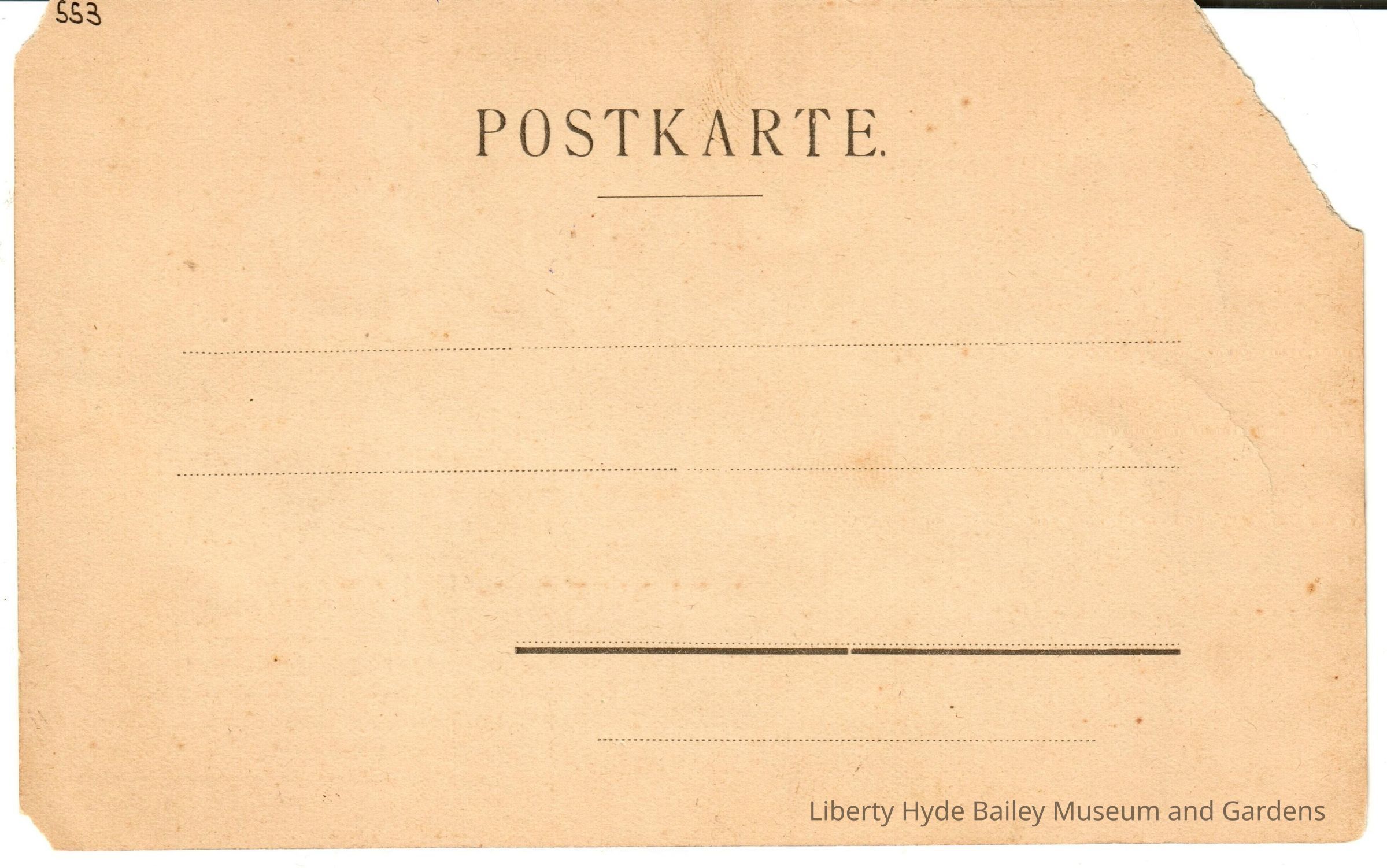 Blank postcard with a map of Europe annotated in Liberty Hyde Bailey's hand, indicating the English translation of the countries in his travels.
