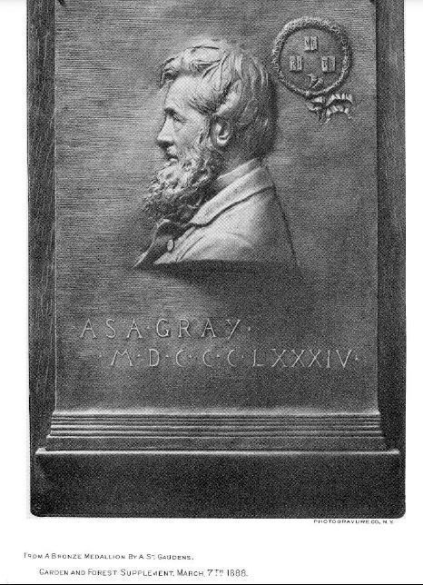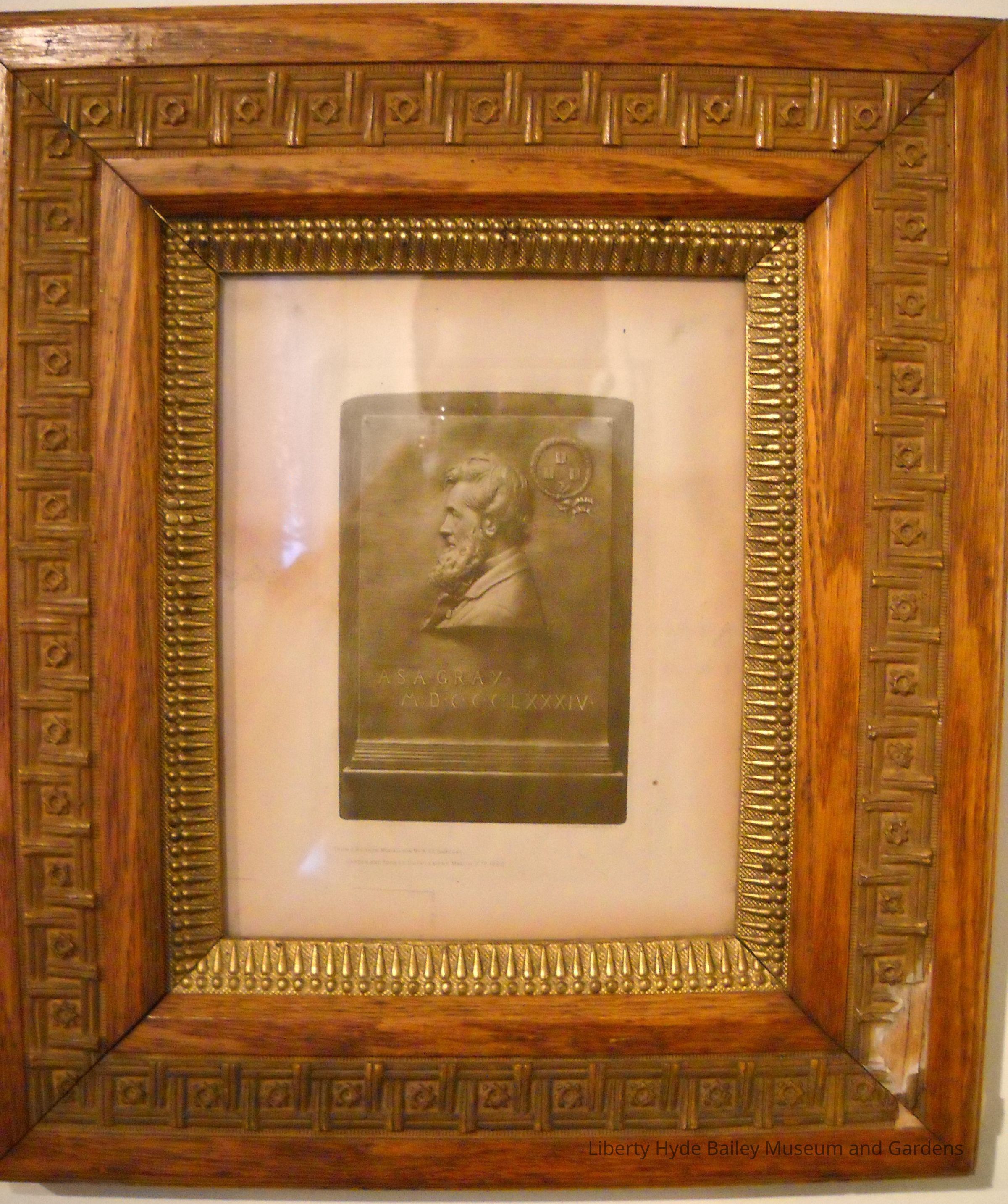 Print of Asa Gray, American Botanist. Inscribed: From a bronze medallion by A. St. Gaudens, Garden and Forest Supplement, March 7, 1888." Ornate oak frame with brass insert surrounding image.Context