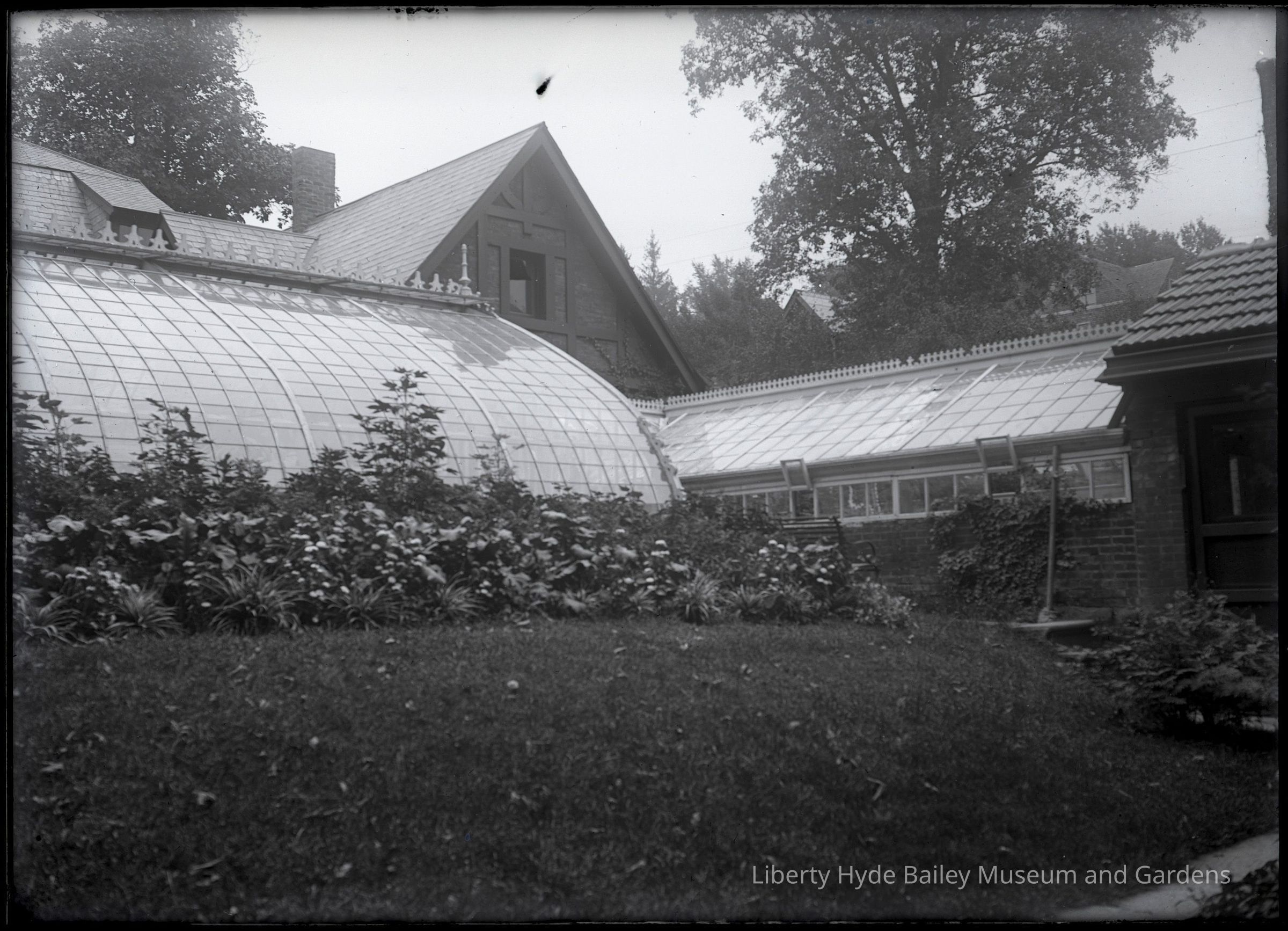Sage Place greenhouses and Carriage House. The Sage greenhouse that appears in the photo's center, to the left, was later torn down by Bailey.Photograph Details