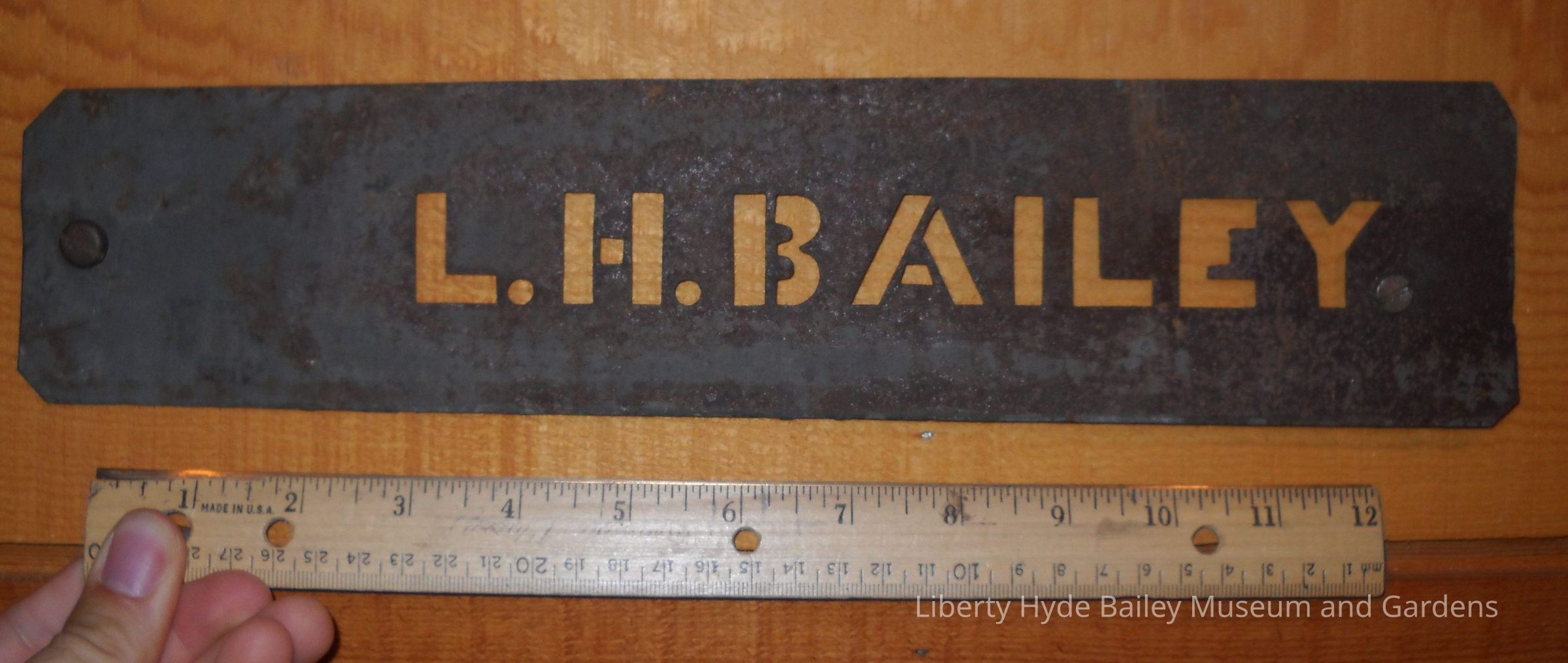 Metal Stencil, reading "L.H. Bailey" in one inch letters.