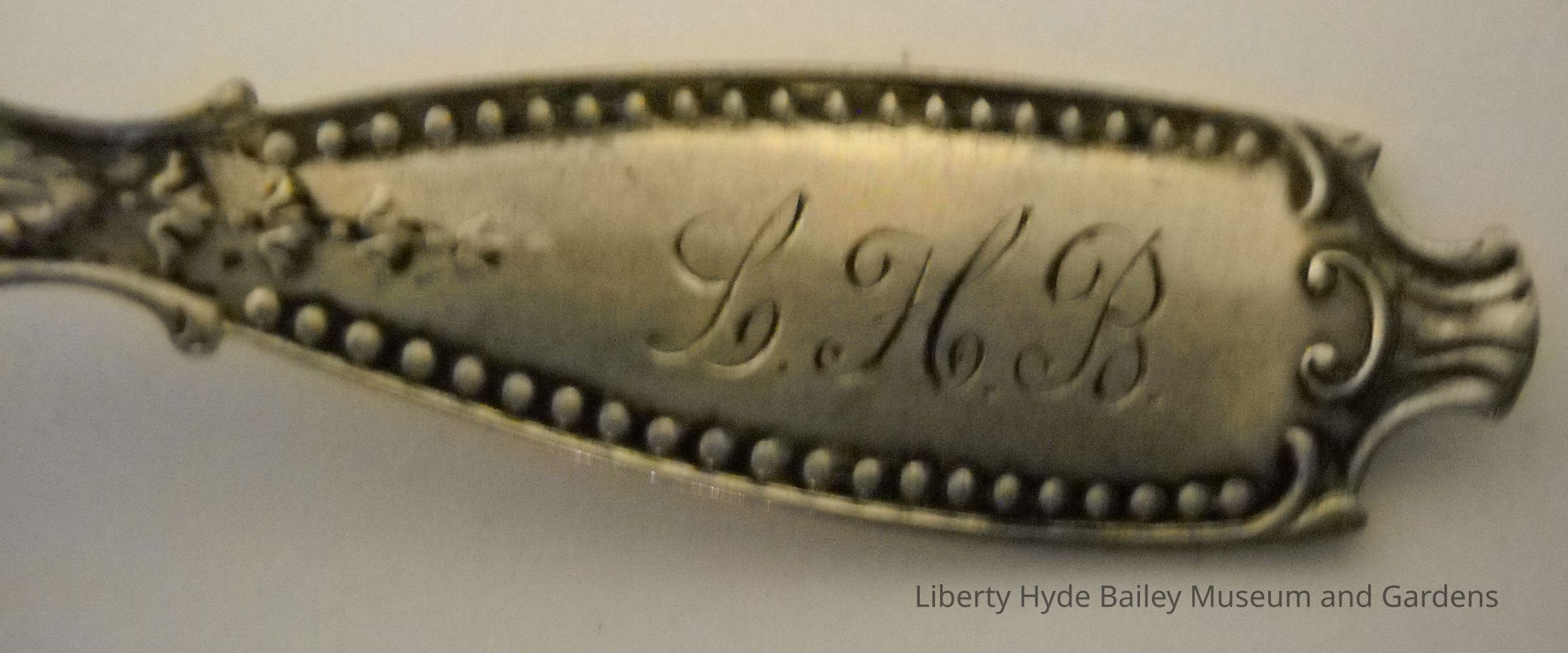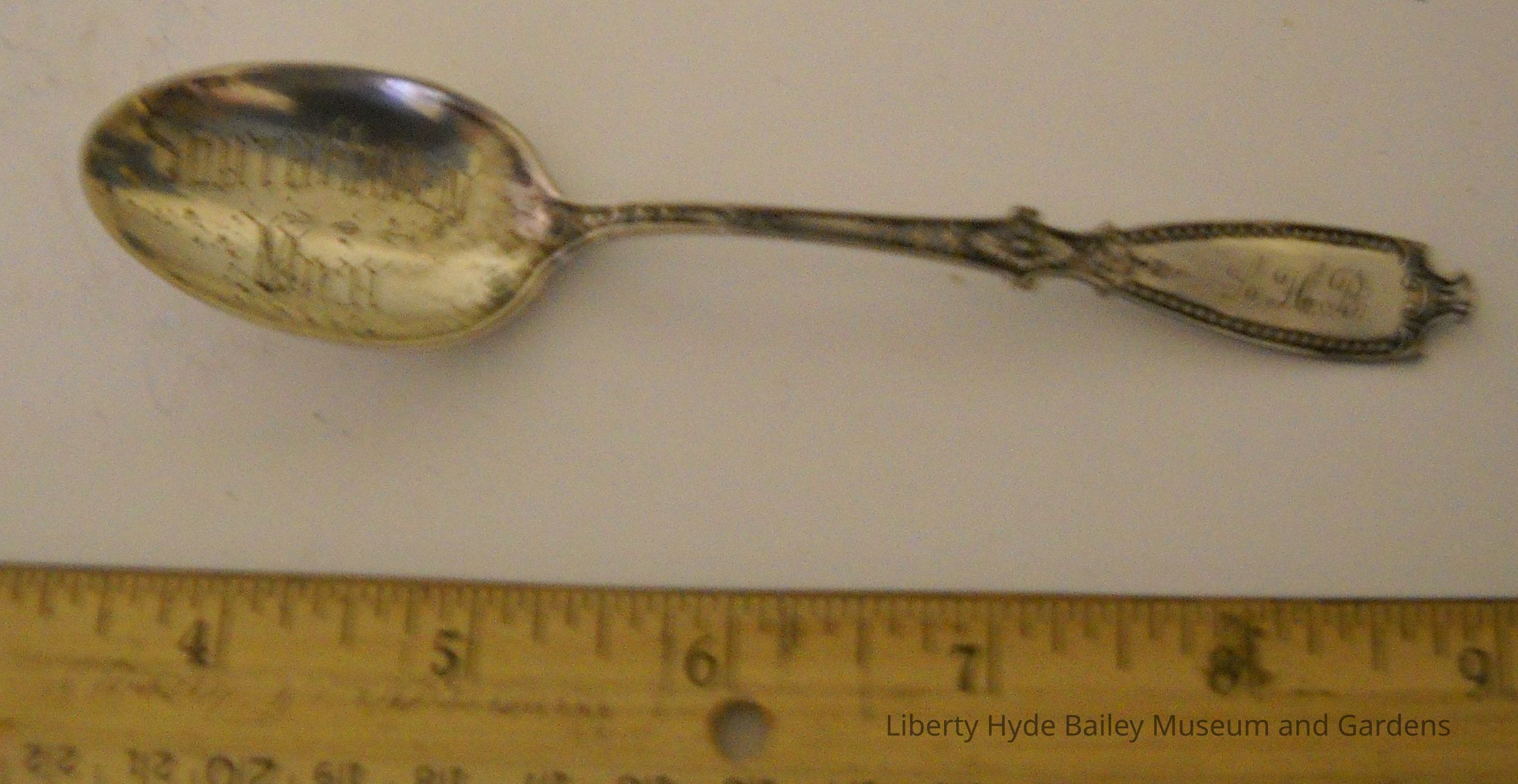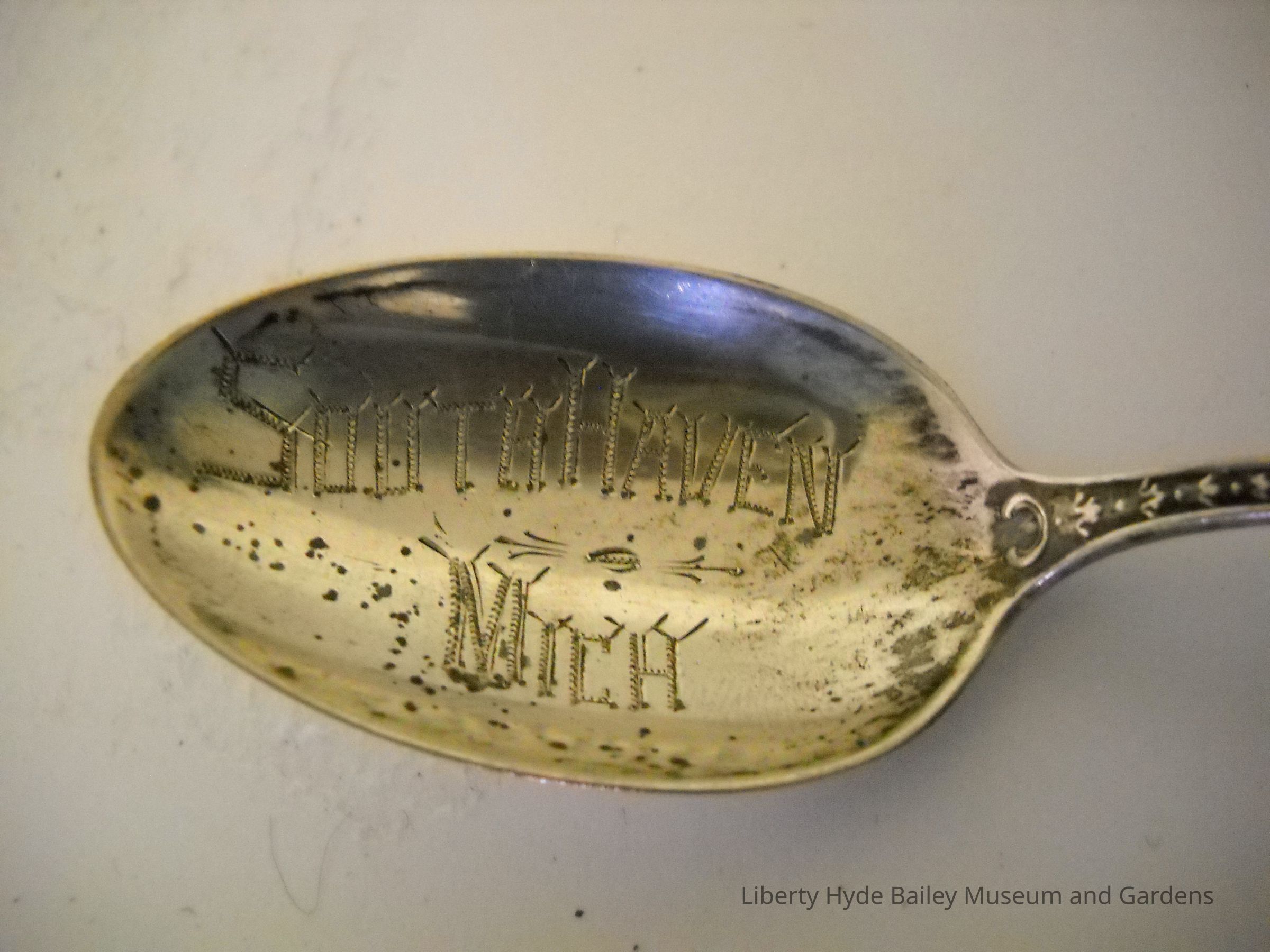 Sterling silver, 5.5 inches long, engraved "LHB" on front side of handle, "1900" on rear, "South Haven Michigan" in bowl. Handle decorated with floral pattern. Gift or commemorative.