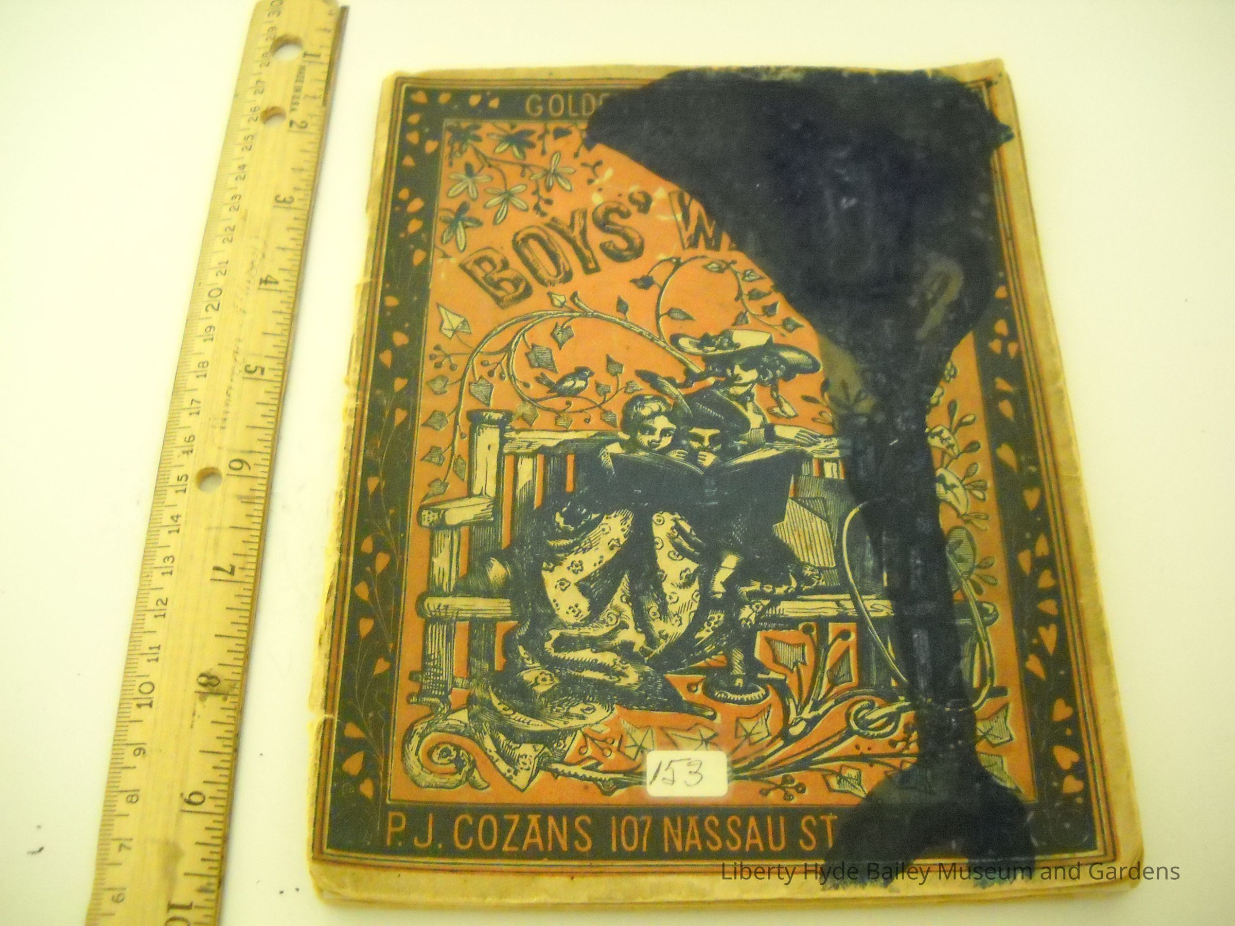 The children's book belonging to Liberty Hyde Bailey as a youth contains eight full-page hand-finished lithograph illustrations. The cover is stained with ink.Collection