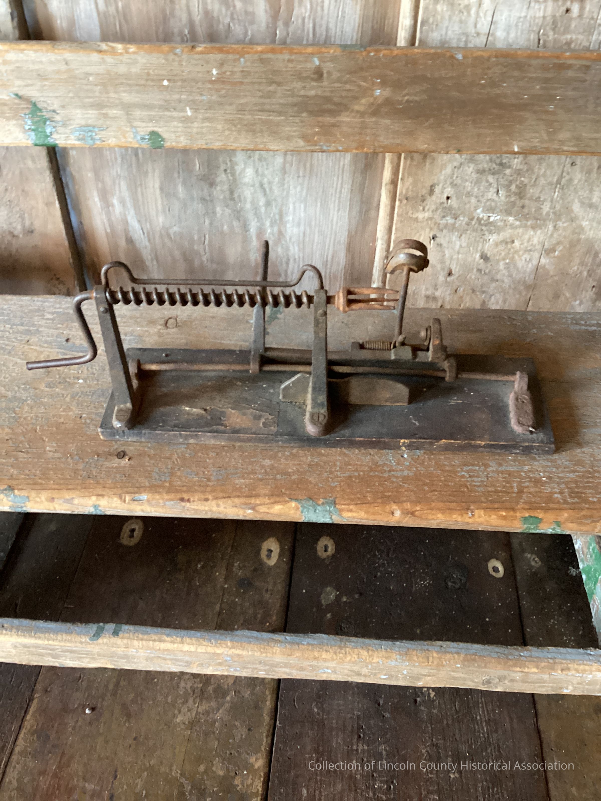 Iron apple parer with its counter clamp. With two cogged wheels with a crank for revolving the apple affixed to a three-pronged bit.Made/Created