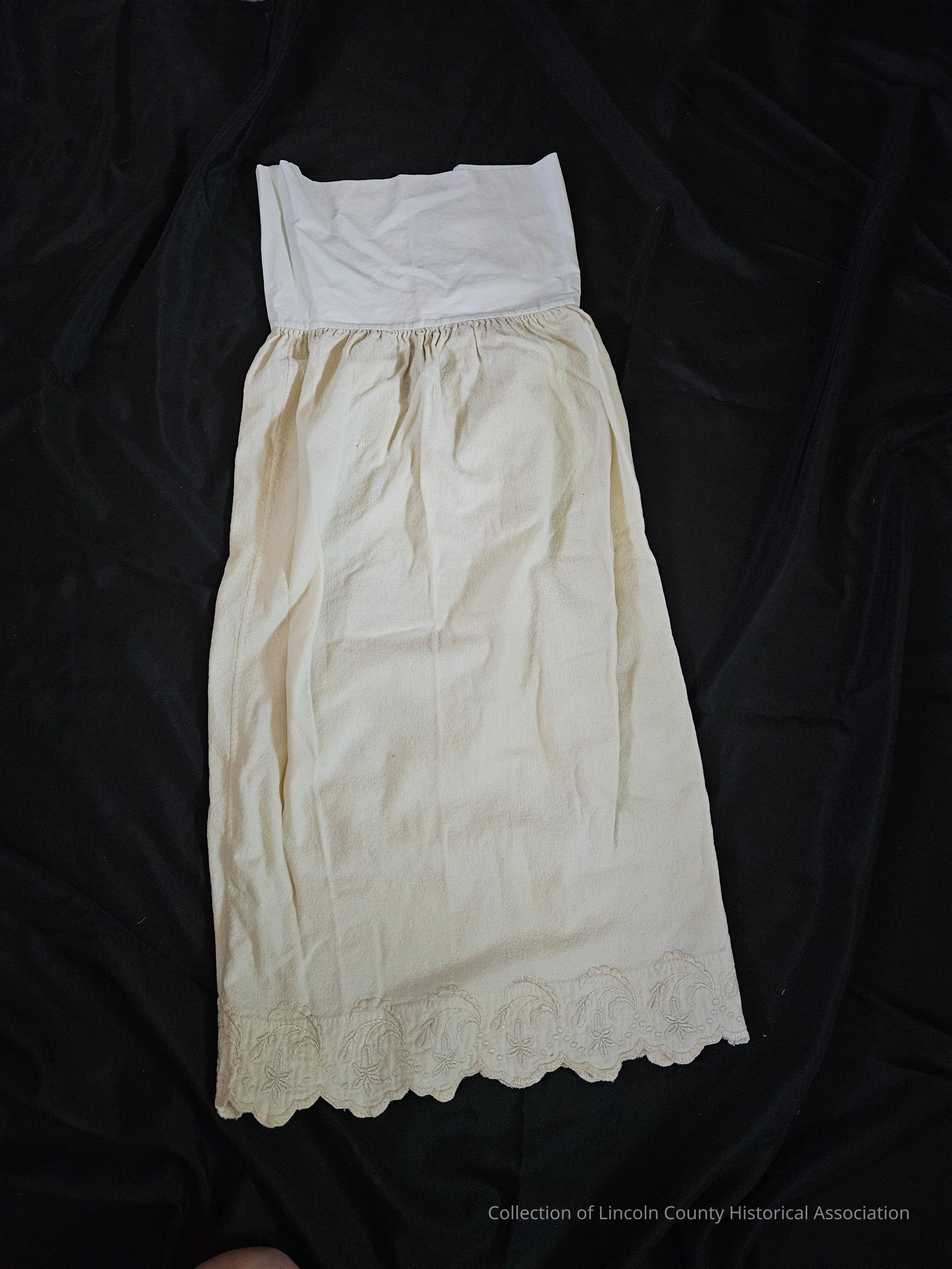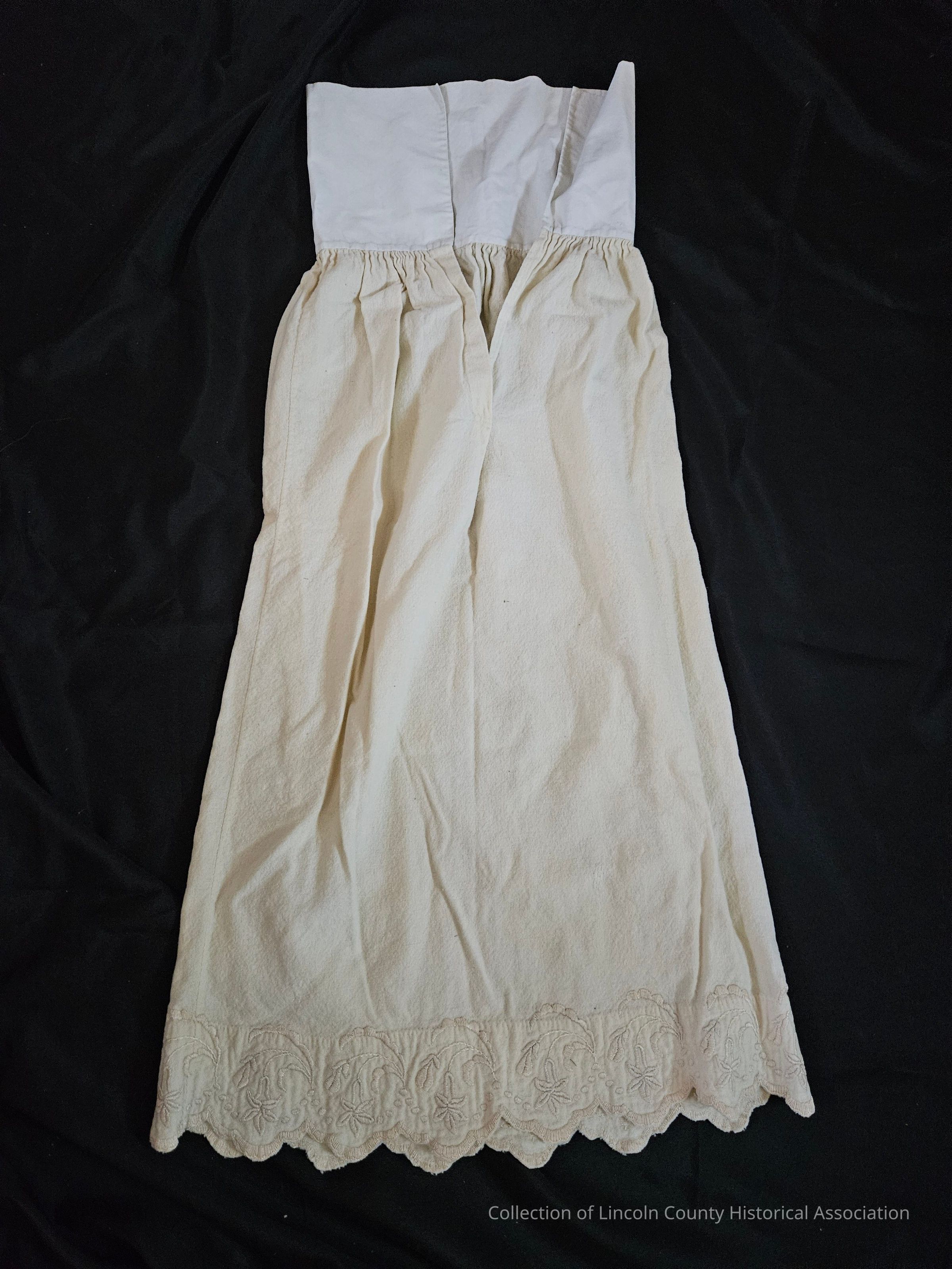 White wool child's petticoat. Hand embroidered floral design at hemline. Scalloped edges. White cotton top.Clothing/Dress/Costume Details