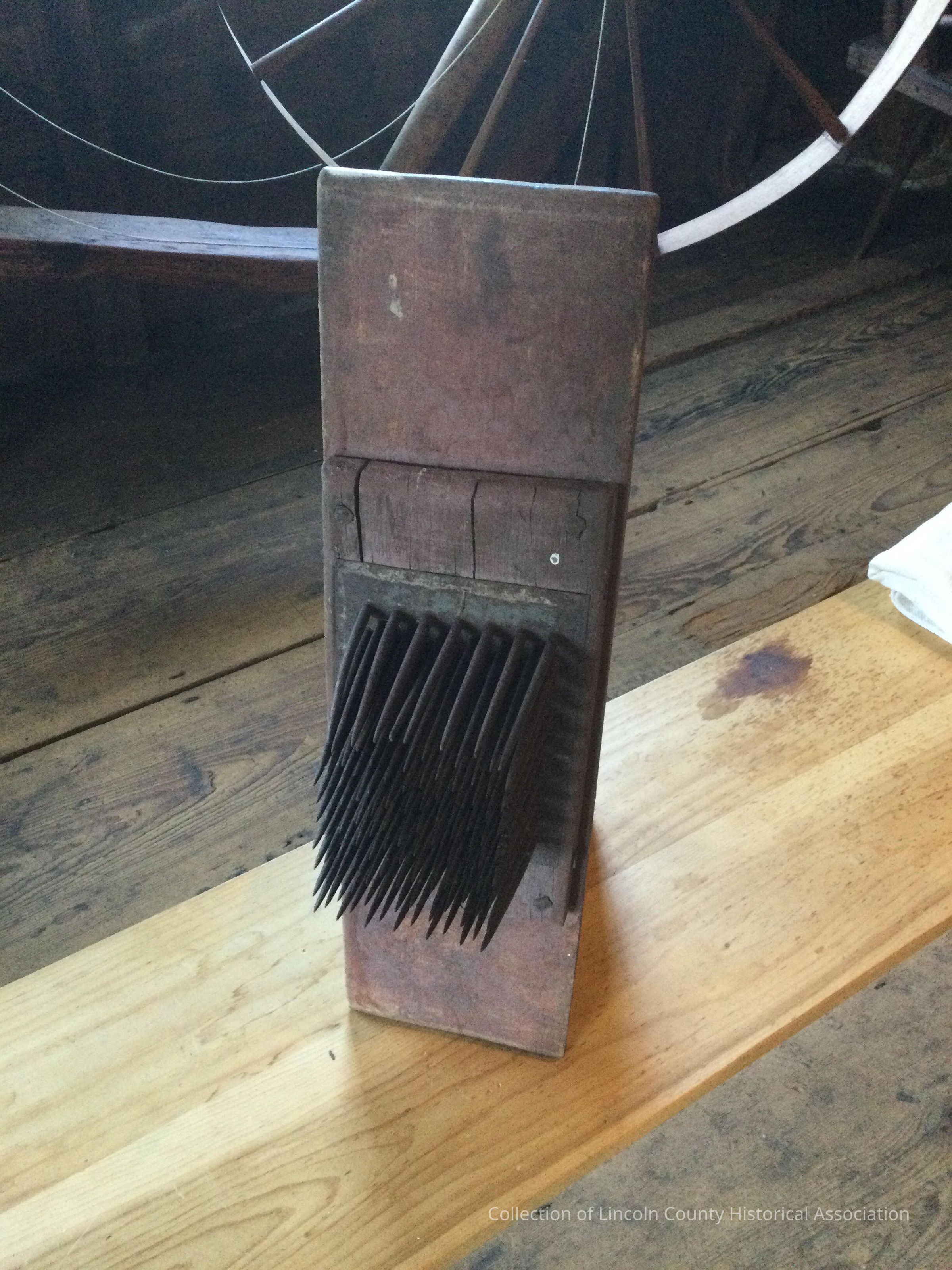 Hetchel. Flat wooden board with inset iron spikes in a rectangular grouping set onto a secondary board. Larger board painted red. Spikes are very coarse.Made/Created