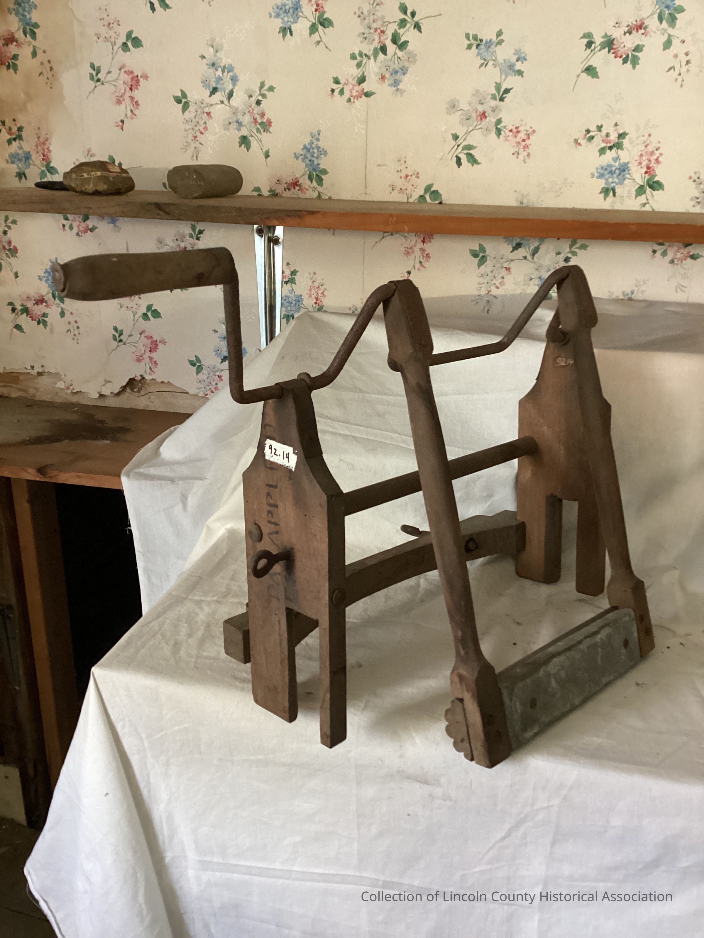 Wood frame washing device with a wrought iron crank and with a heavy rectangular lead weight on dasher arm. This apparatus would be attached to a wash tub.Made/Created