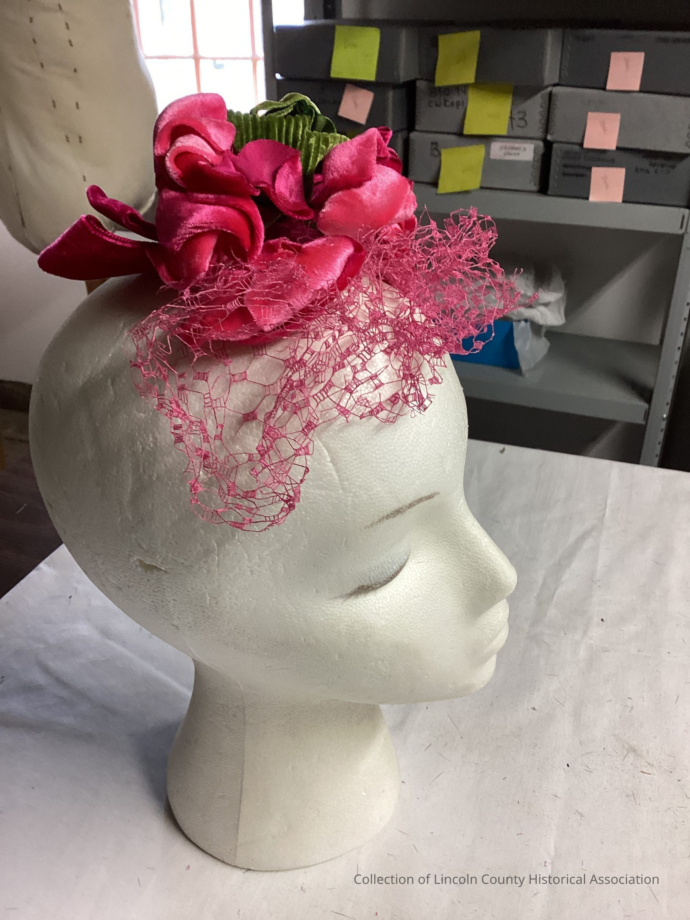 Pink women's hat. Pink mesh with velvet shaped into flower on top.Clothing/Dress/Costume Details