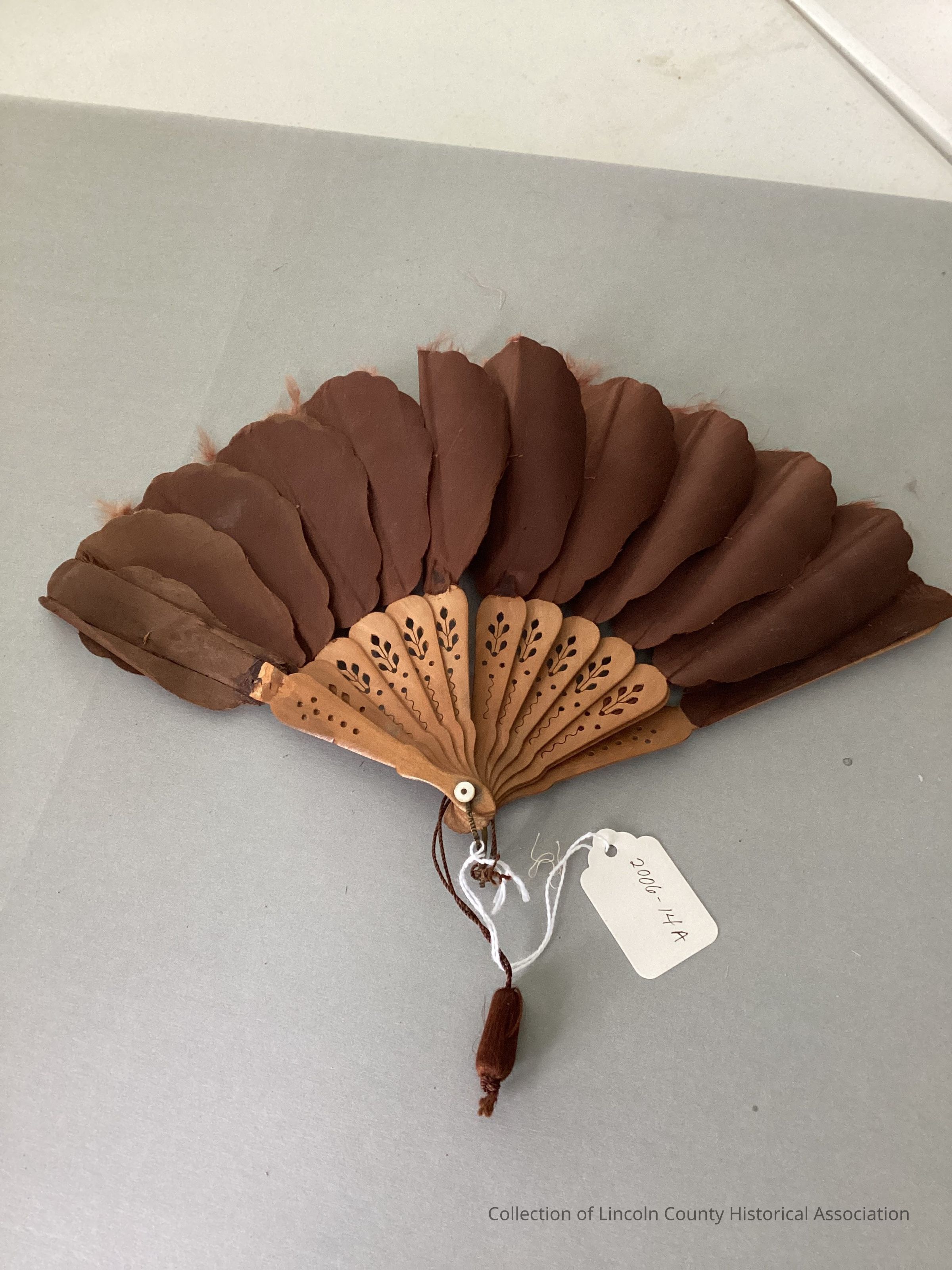Fan of natural wood sticks with incised floral motifs. Brown silk and feathers at the top of the sticks. Brown ribbon tassel attached to rivet.