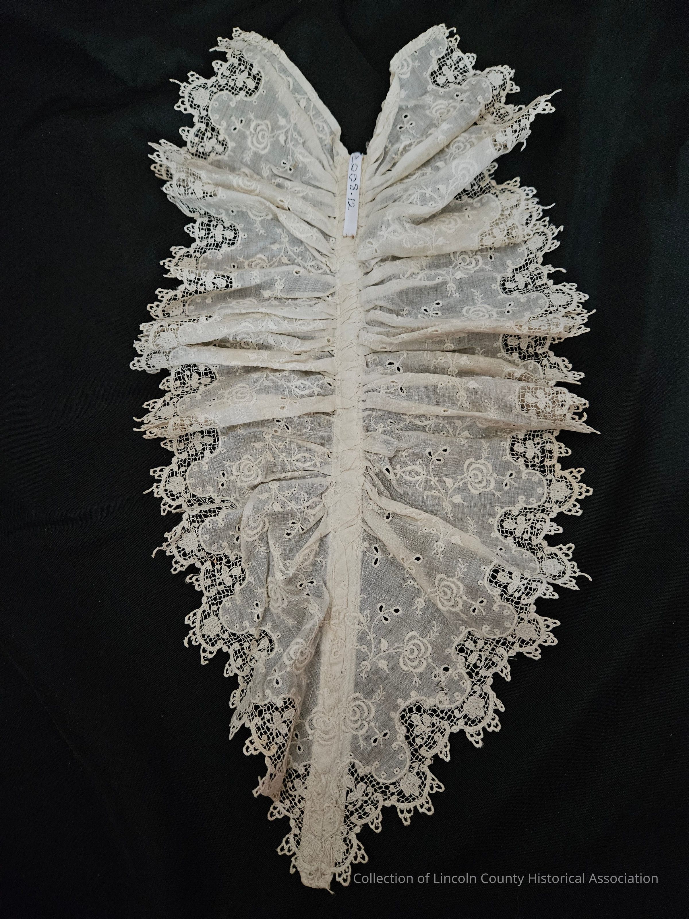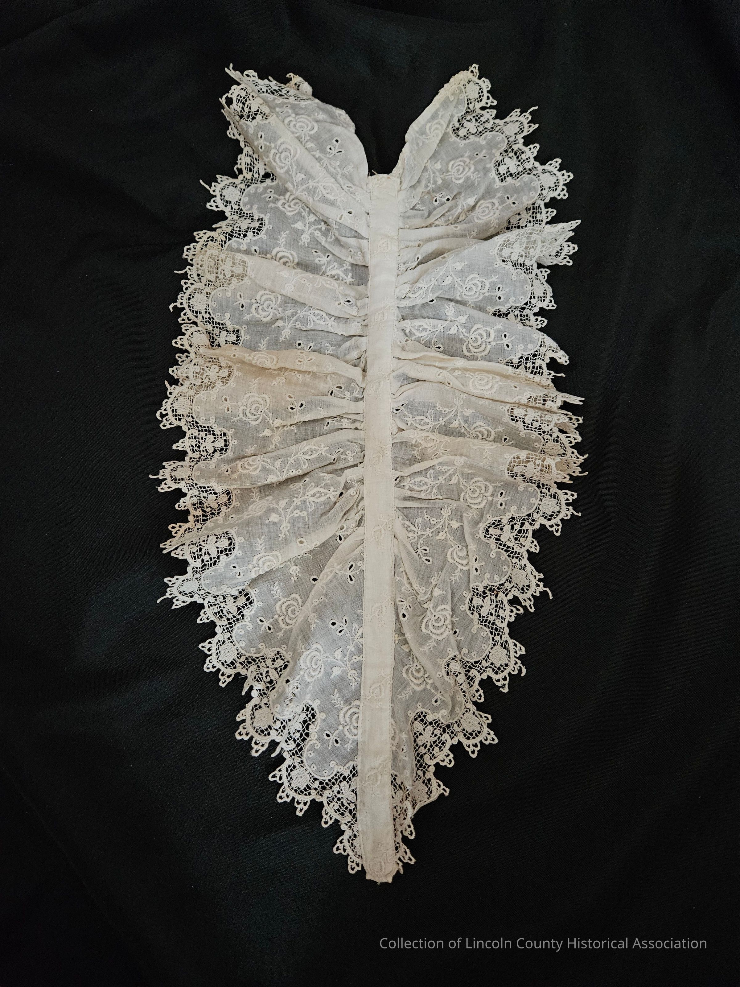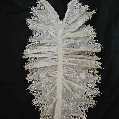 White cotton double ruffled neck piece/jabot. Floral embroidered design. Scalloped edges.Clothing/Dress/Costume Details