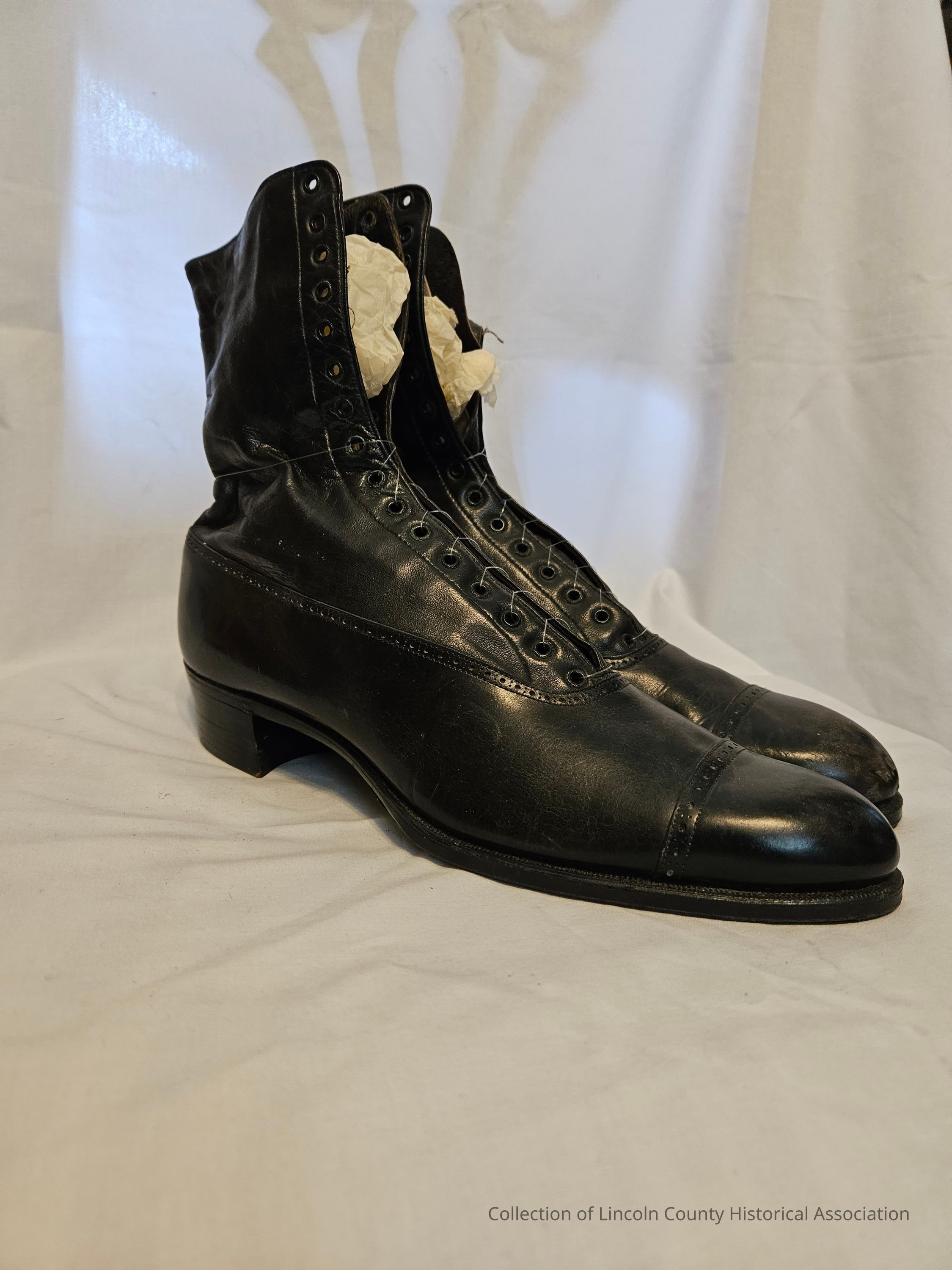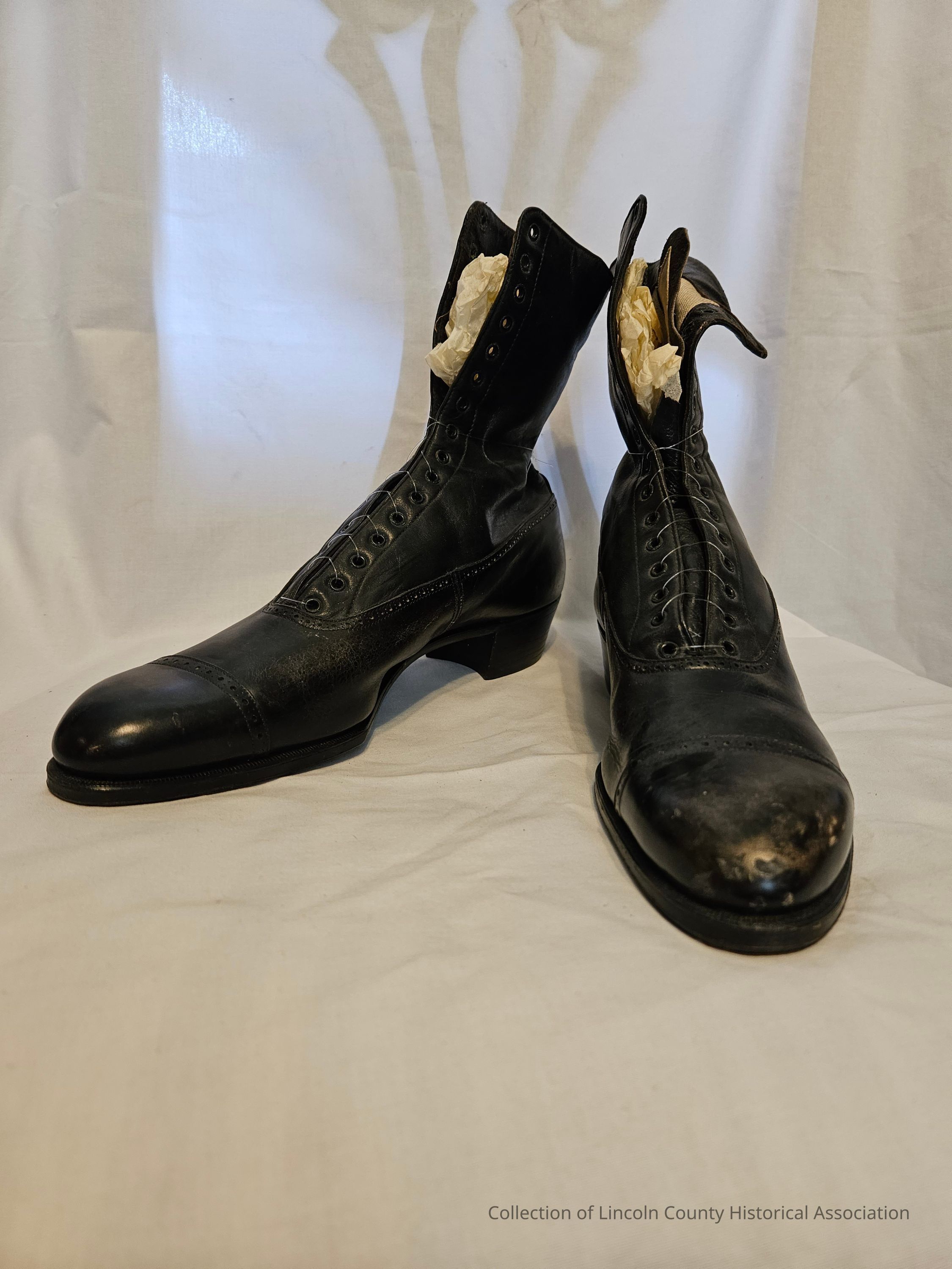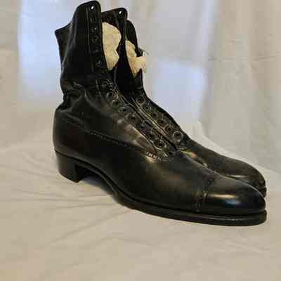 Pair of black leather women's walking boots. Metal eyelets for lacing. Pointed toe. Punch work outlines. 3cm straight heel.