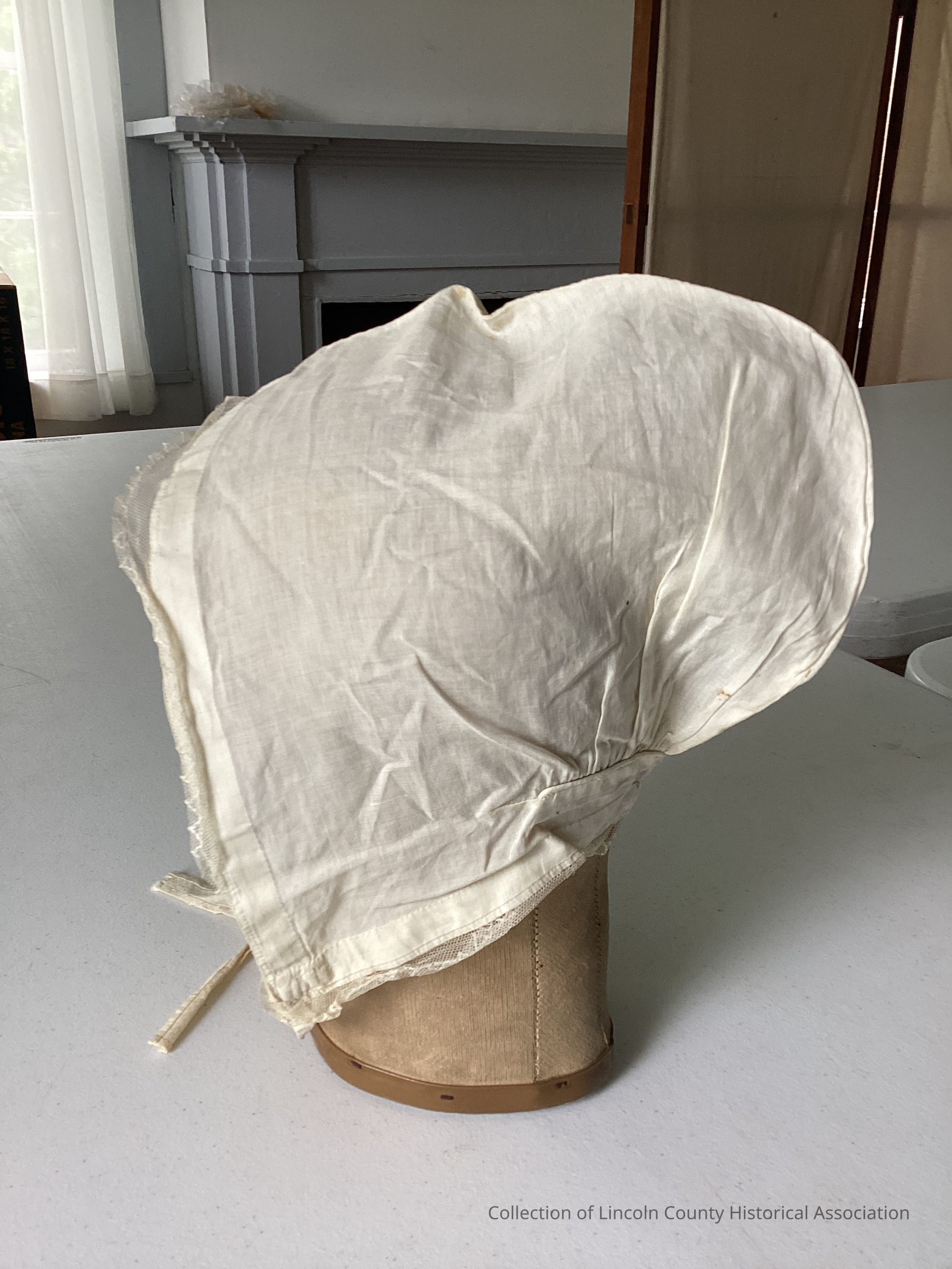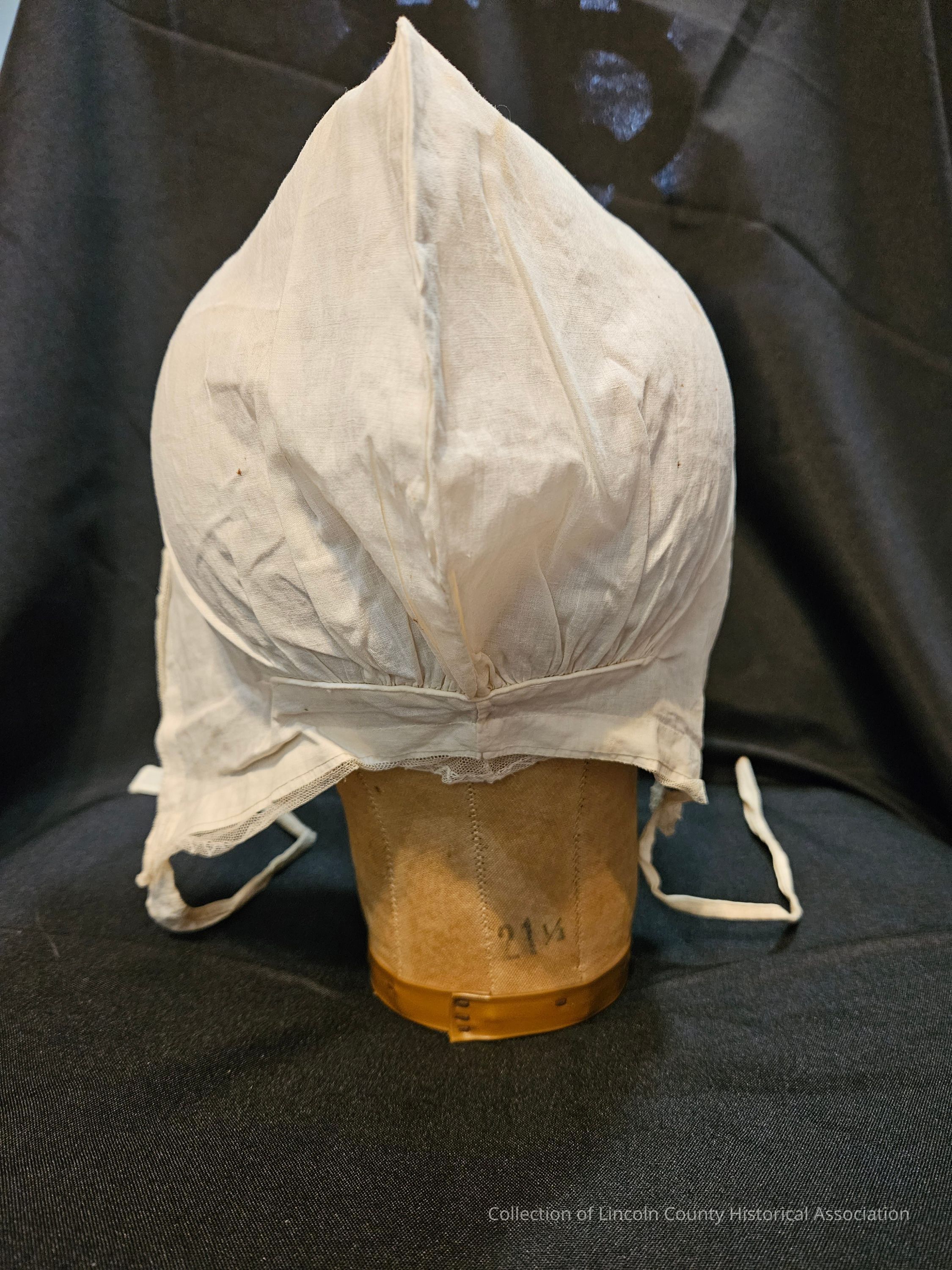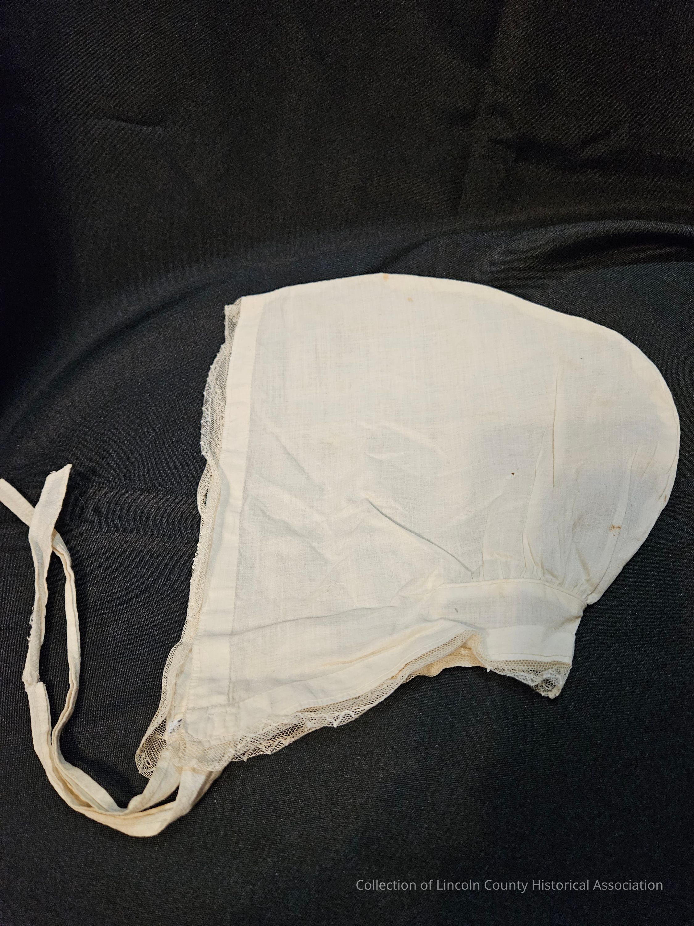 Plain cotton cap with lace edging. Gathered piping at the base of the neck. Two patterned cotton ties.Clothing/Dress/Costume Details