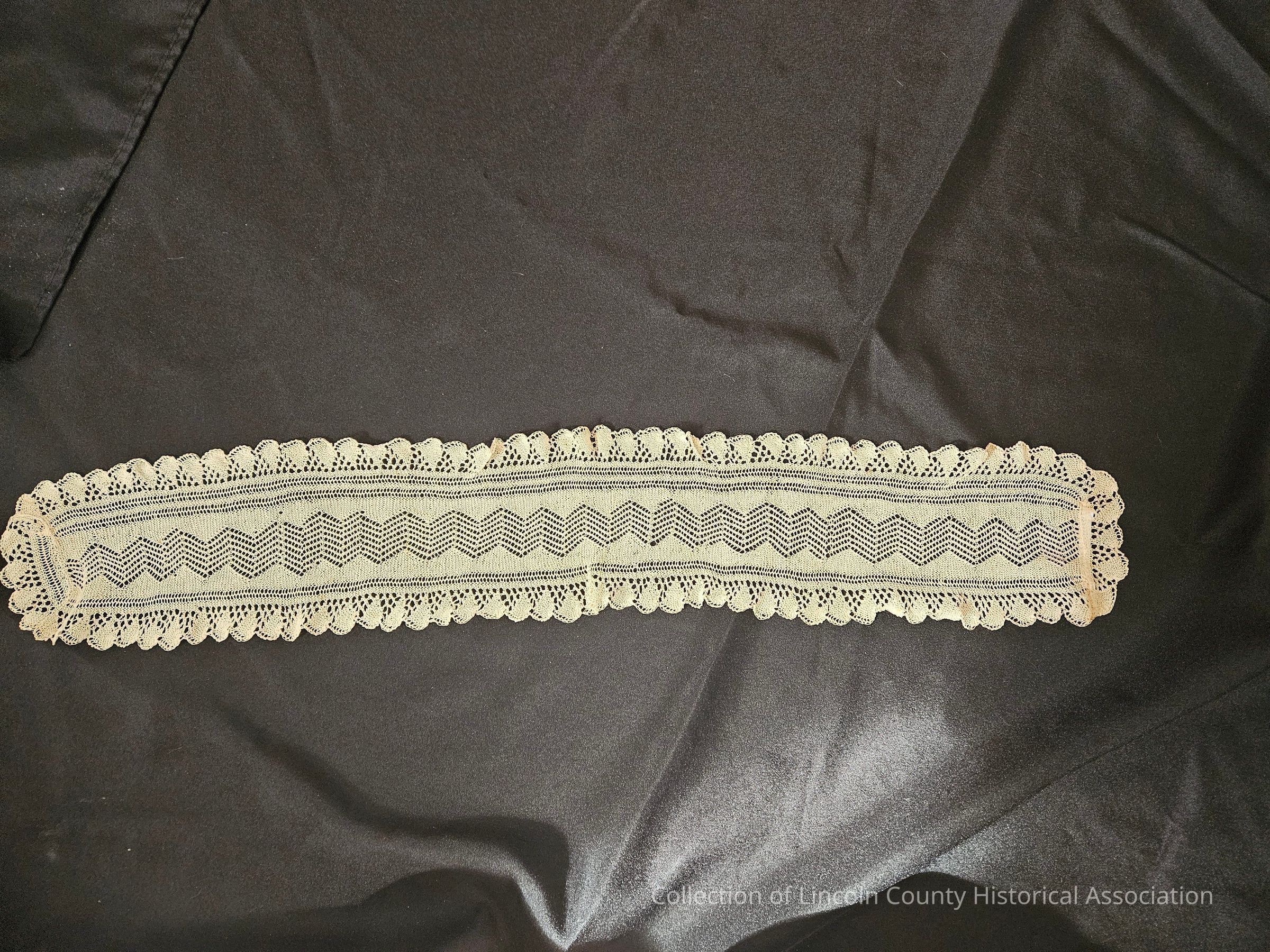 White crocheted small scarf with zig zag pattern in the center. Scalloped edges.Clothing/Dress/Costume Details