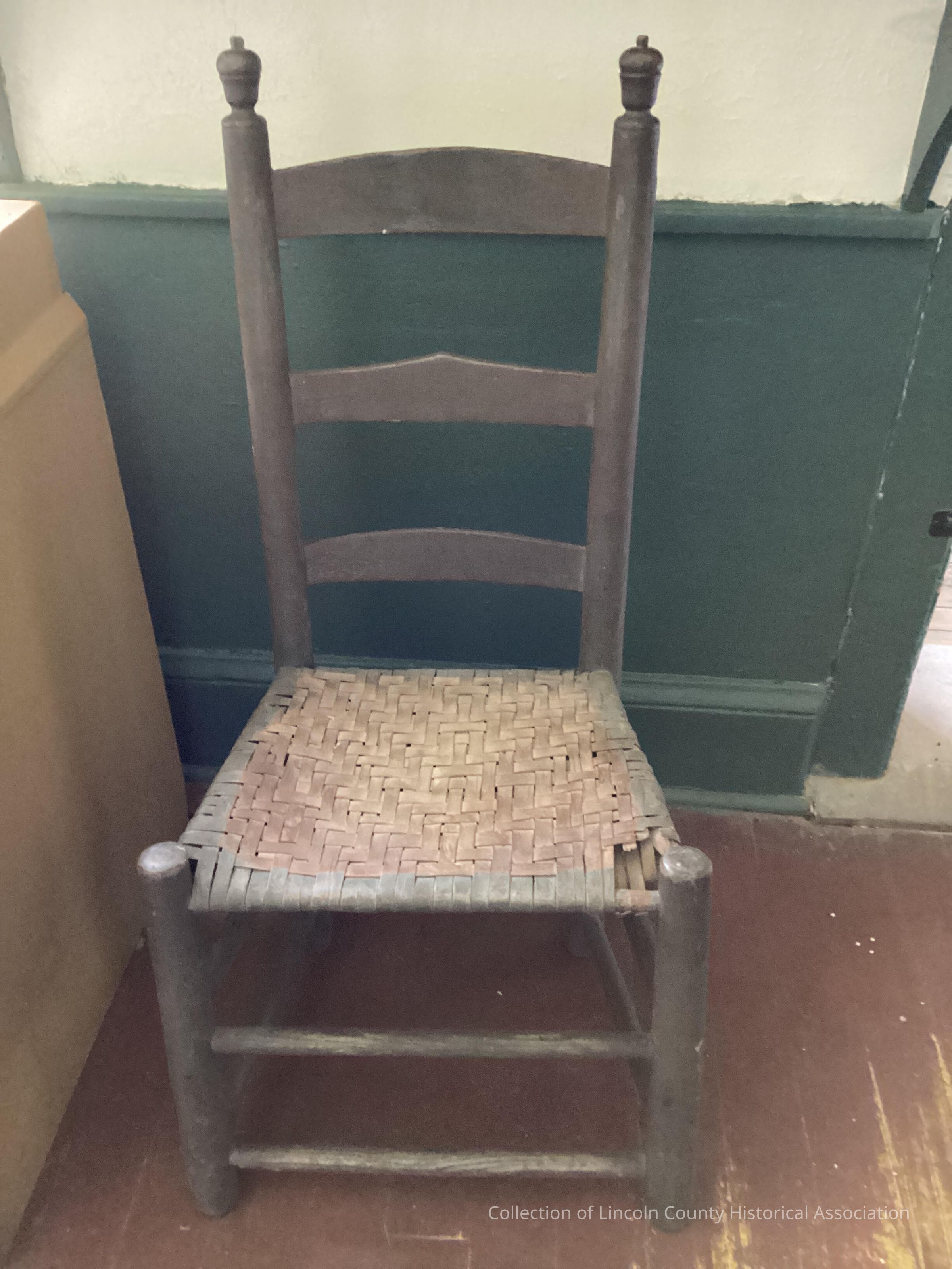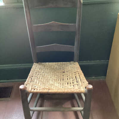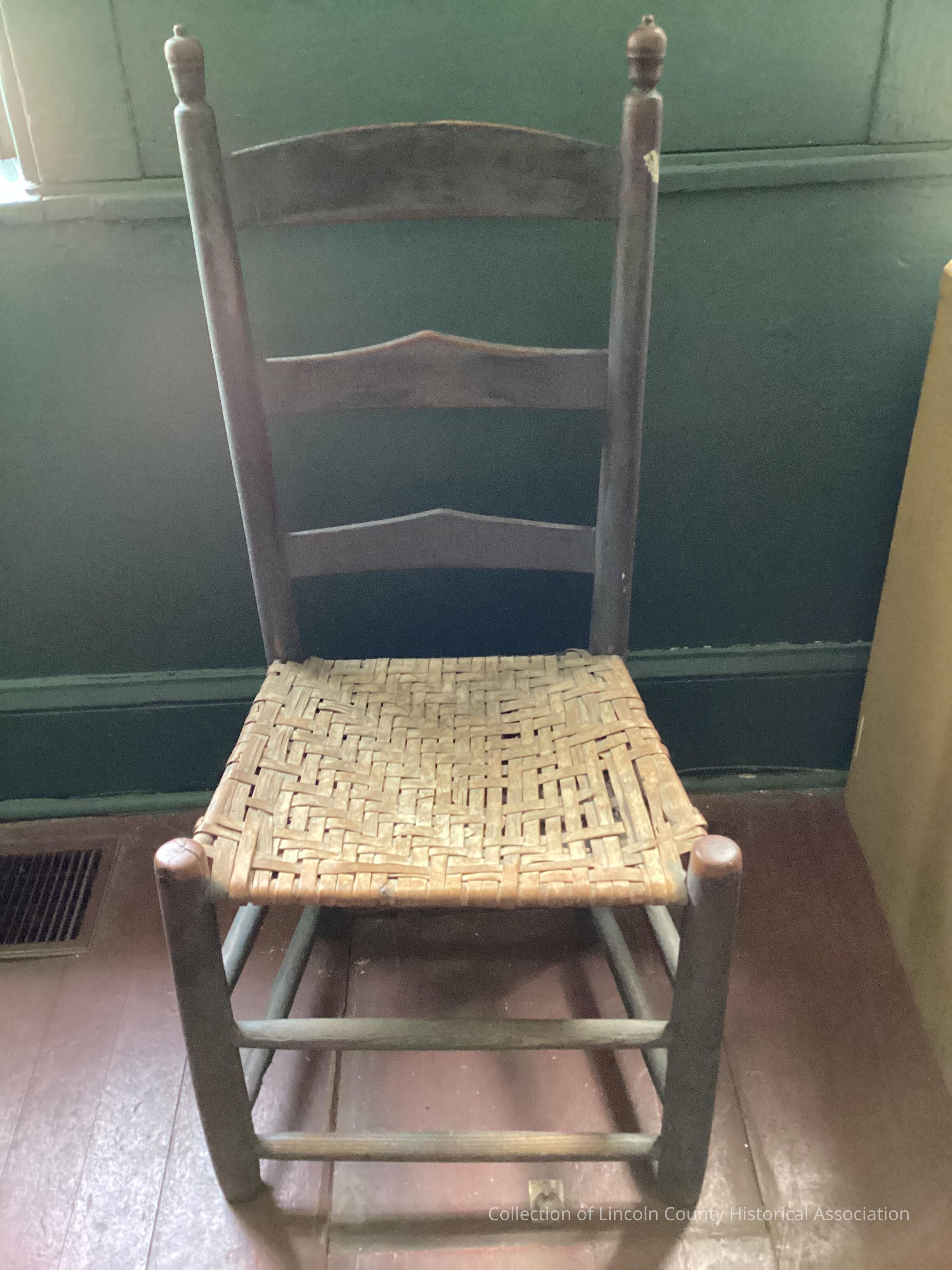 Pair of ladderback chairs each with three splats. Top splat is rounded across top whereas center splat is peaked as a shallow pyramid. Stiles end in acorns. Both have hardwood splint seats. Both painted (stained) with gray-blue paint over red undercoat but now appear rather black. The bottom splat of one chair is also peaked as a shallow pyramid.Made/Created