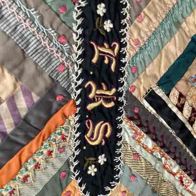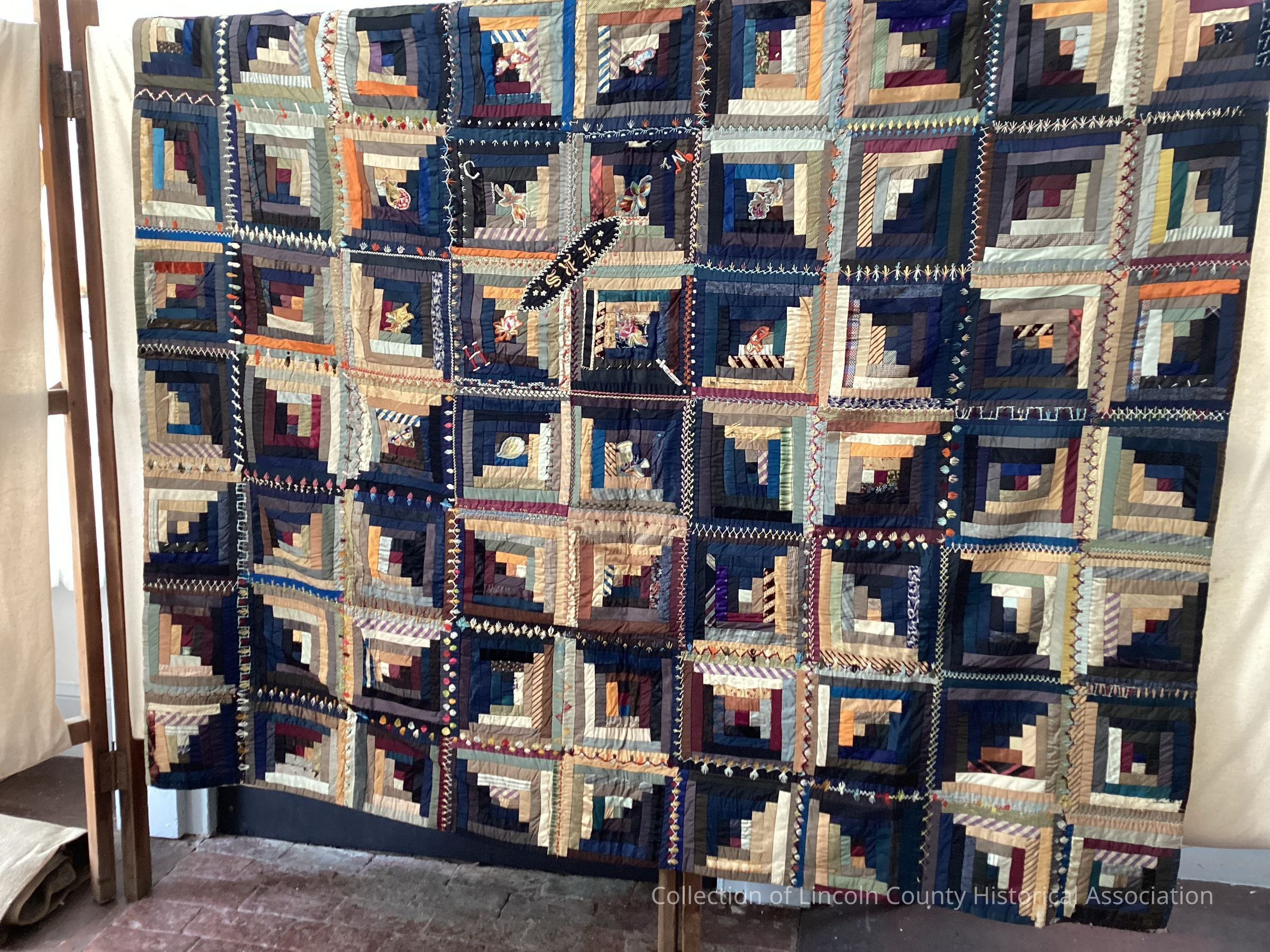 Beautiful silk “Log Cabin” bed quilt. Hand embroidery with initials F. R.S. In the center of quilt. Feather stitching embroidered throughout quilt. Pattern has a geometric stripe of black silks with lighter colored log cabin squares. The backing is a silk fabric known as “hatter’s plush.” Used by haberdashers in hat making. There was a hat making business in Wiscasset, ME. Perhaps this is where Eliza purchased this fabric.Made/Created