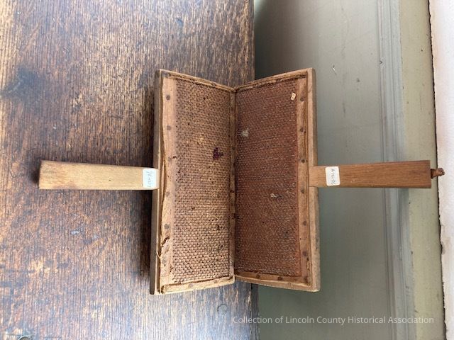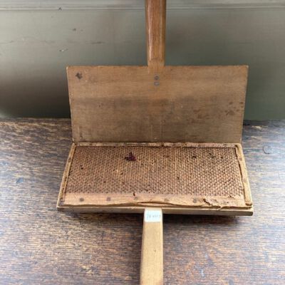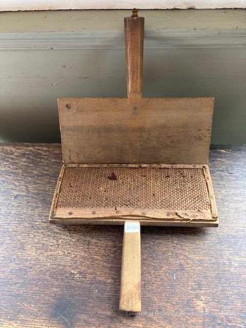 Pair of carding paddles. Wood panels with inset wire bristles and with wooden handles.