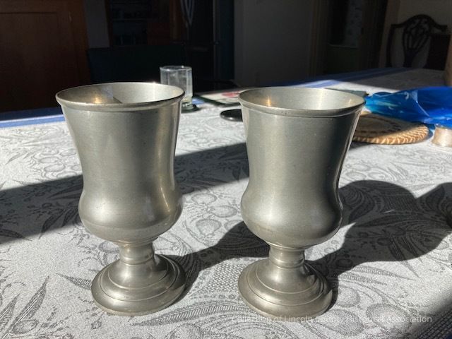 Pair of Britannia Ware stemmed goblets. Thick stems on a stepped, round base. Base and stems are hollow.Made/Created
