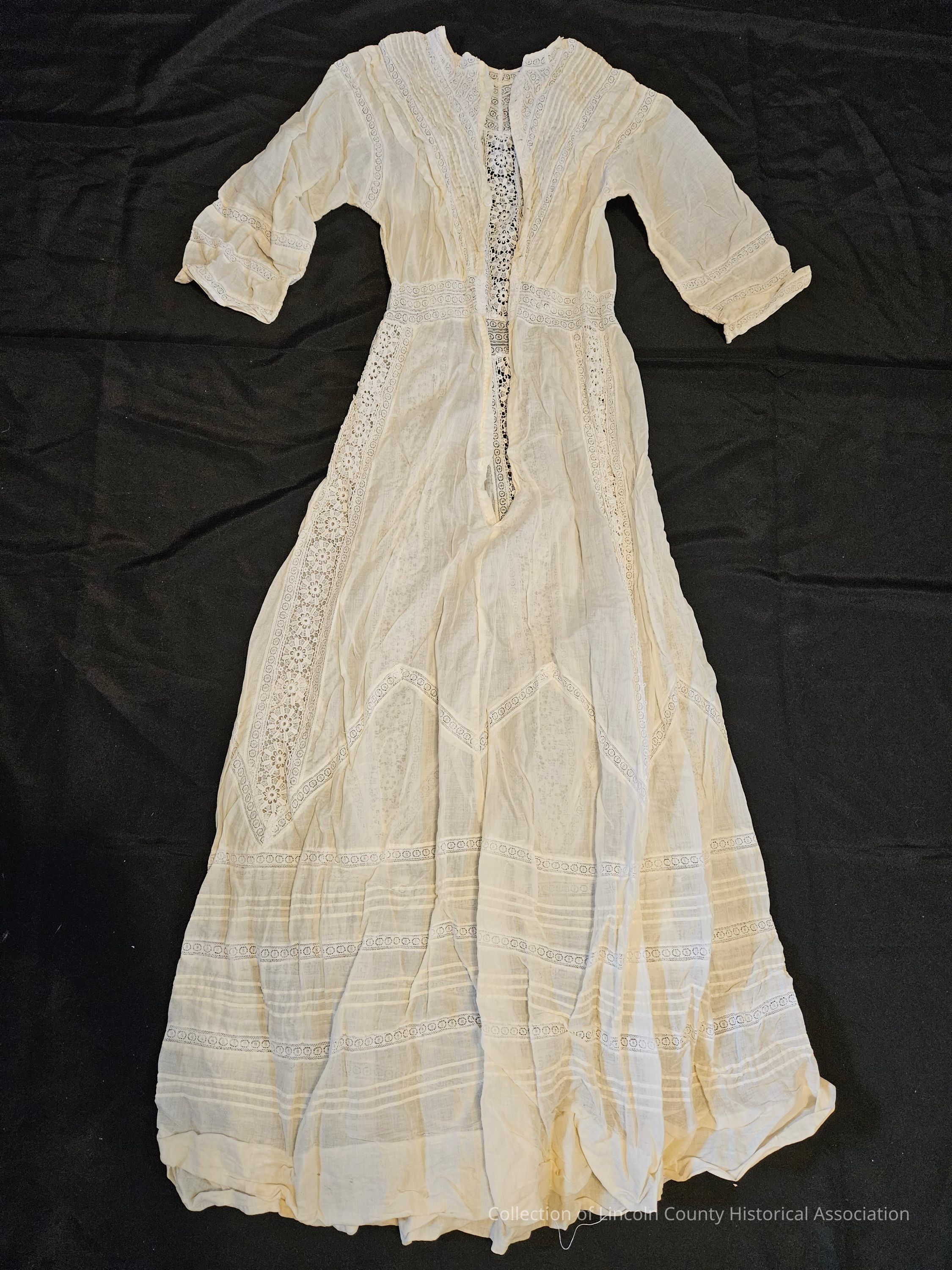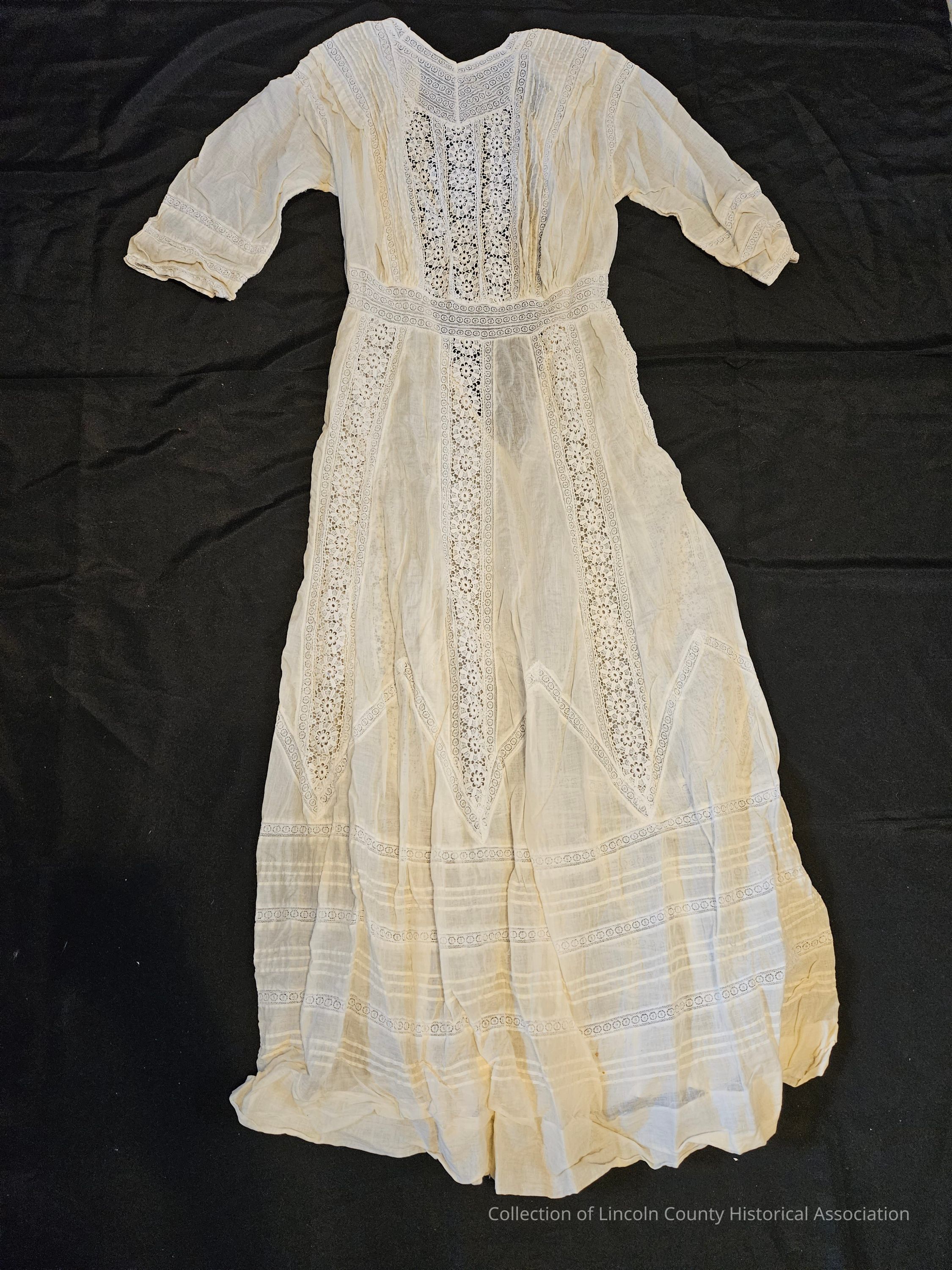 Yellow sheer cotton overdress. Three floral lace inserts down front of chest and skirt. "V" shaped lace insert at bottom of skirt. Alternating pleats and lace inserts at bottom of dress. Three lace inserts at ends of each sleeve. Pleats at neckline and around shoulders. Button closure in back. Machine made.Clothing/Dress/Costume Details