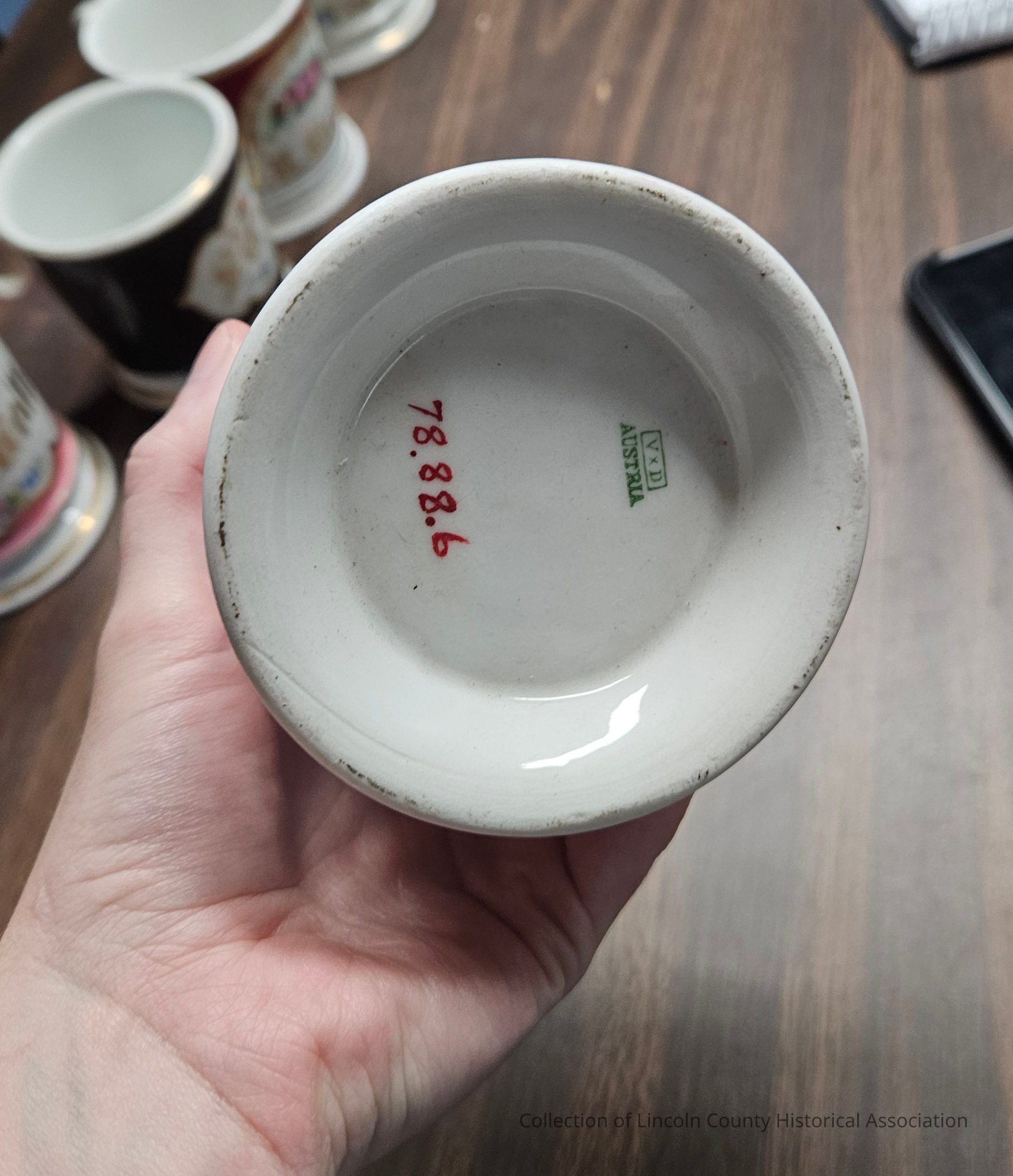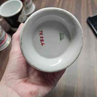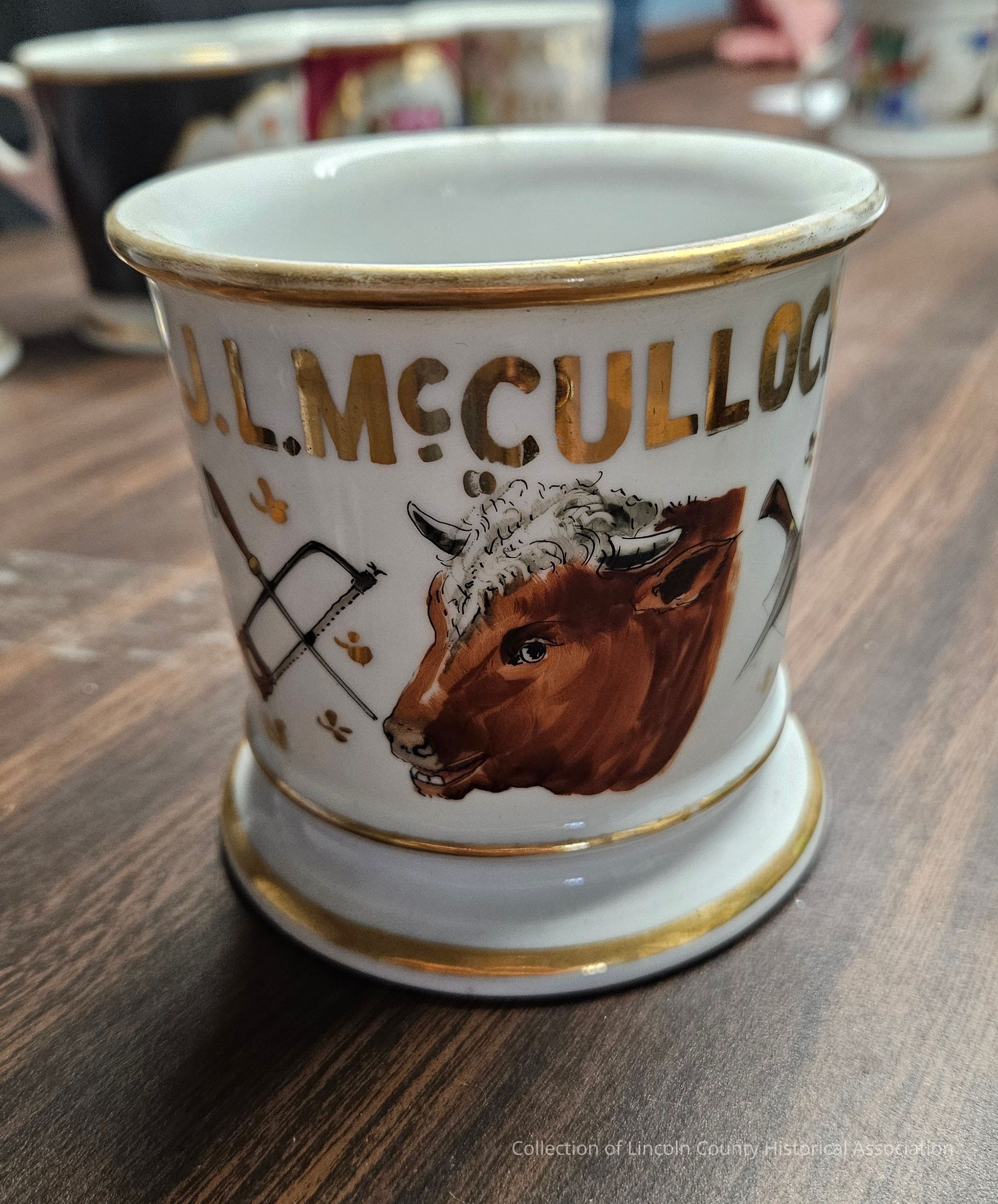White shaving mug with gold lettering. Image of brown bull in center surrounded by gold tools. Gold lettering around top of mug reads "J.M. McCulloch." White handle.