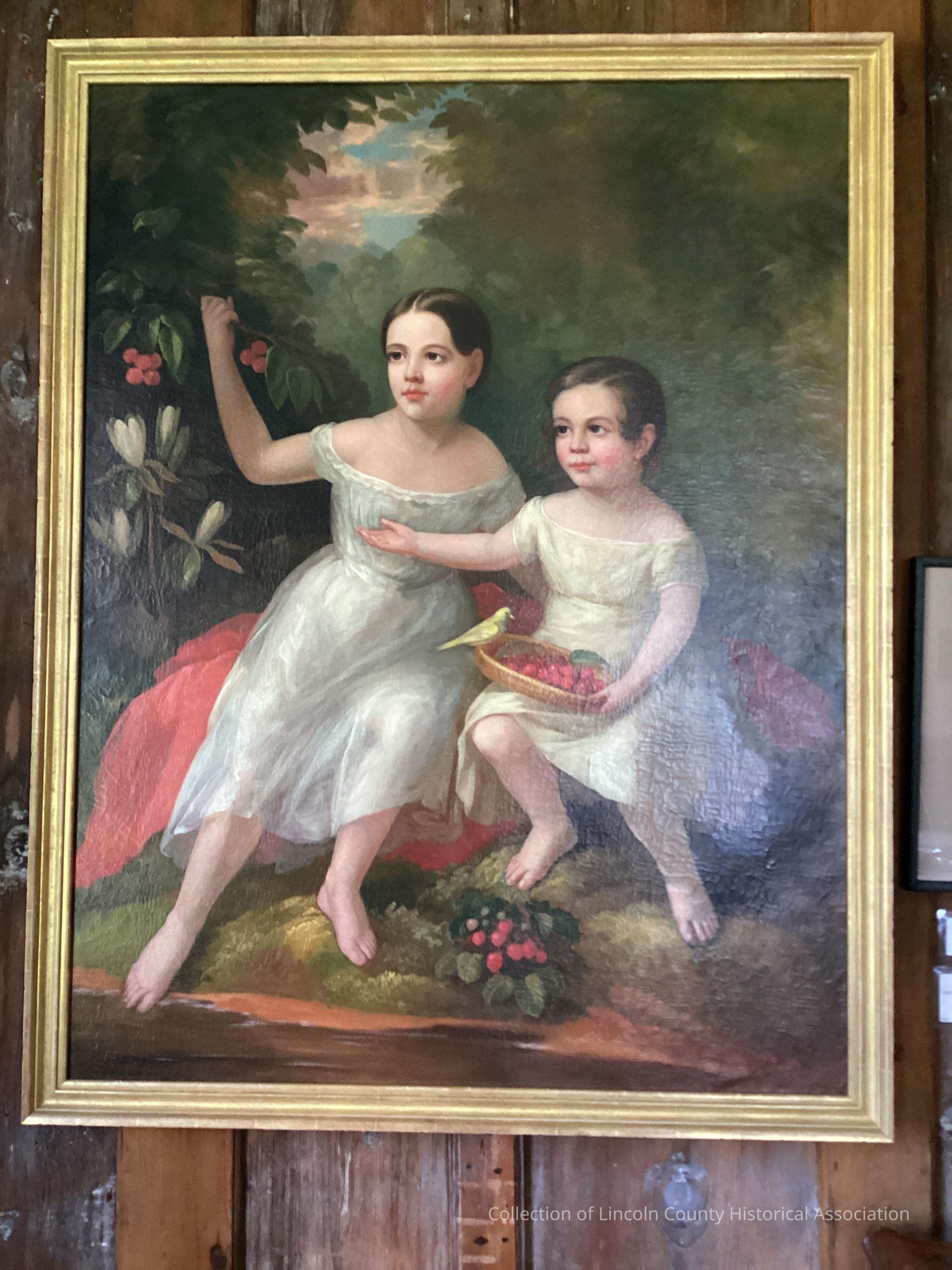 Portrait depicts two seated children (Alice and Harrie Hooper) in a landscape. They are holding a bowl of cherries