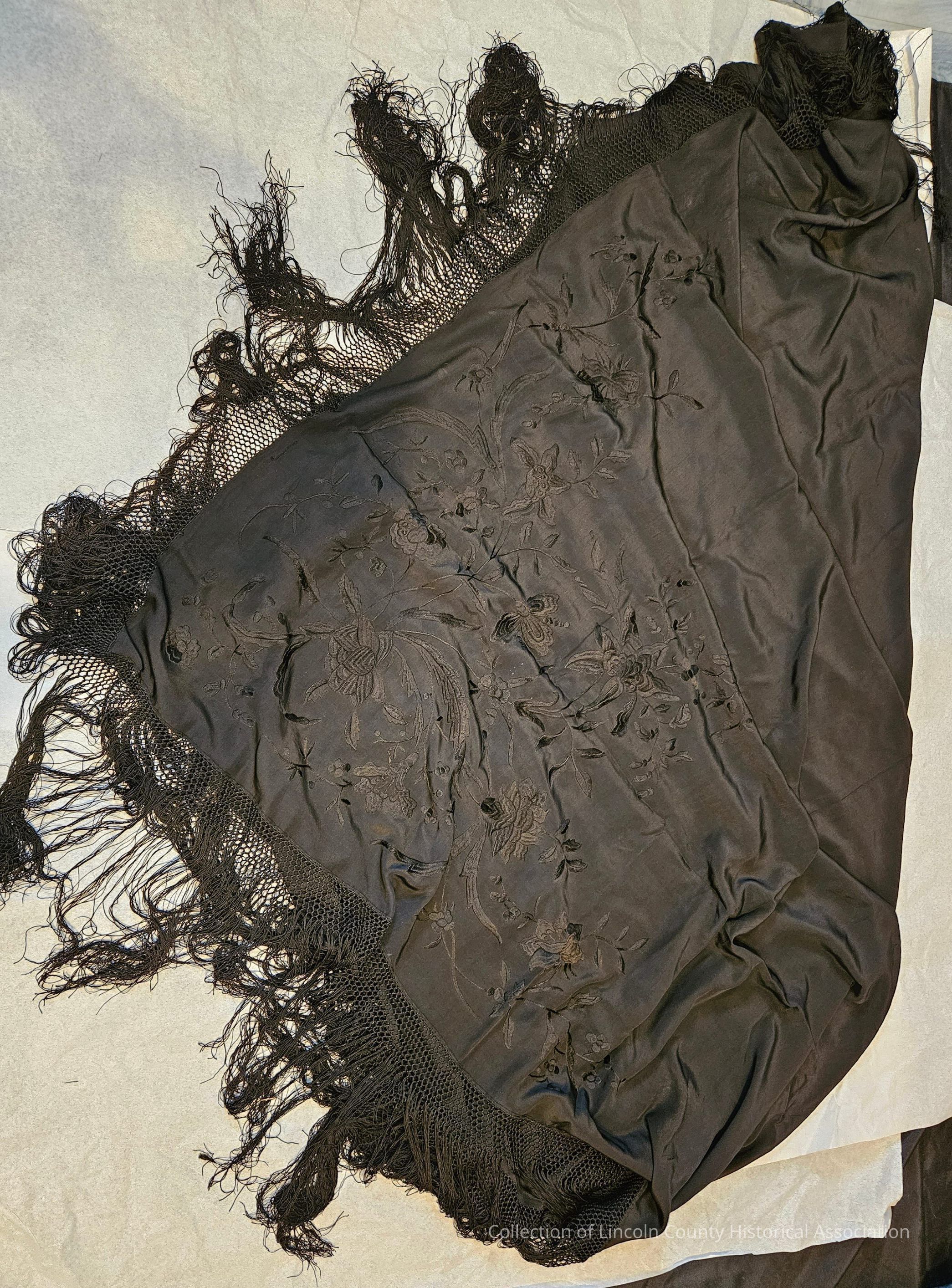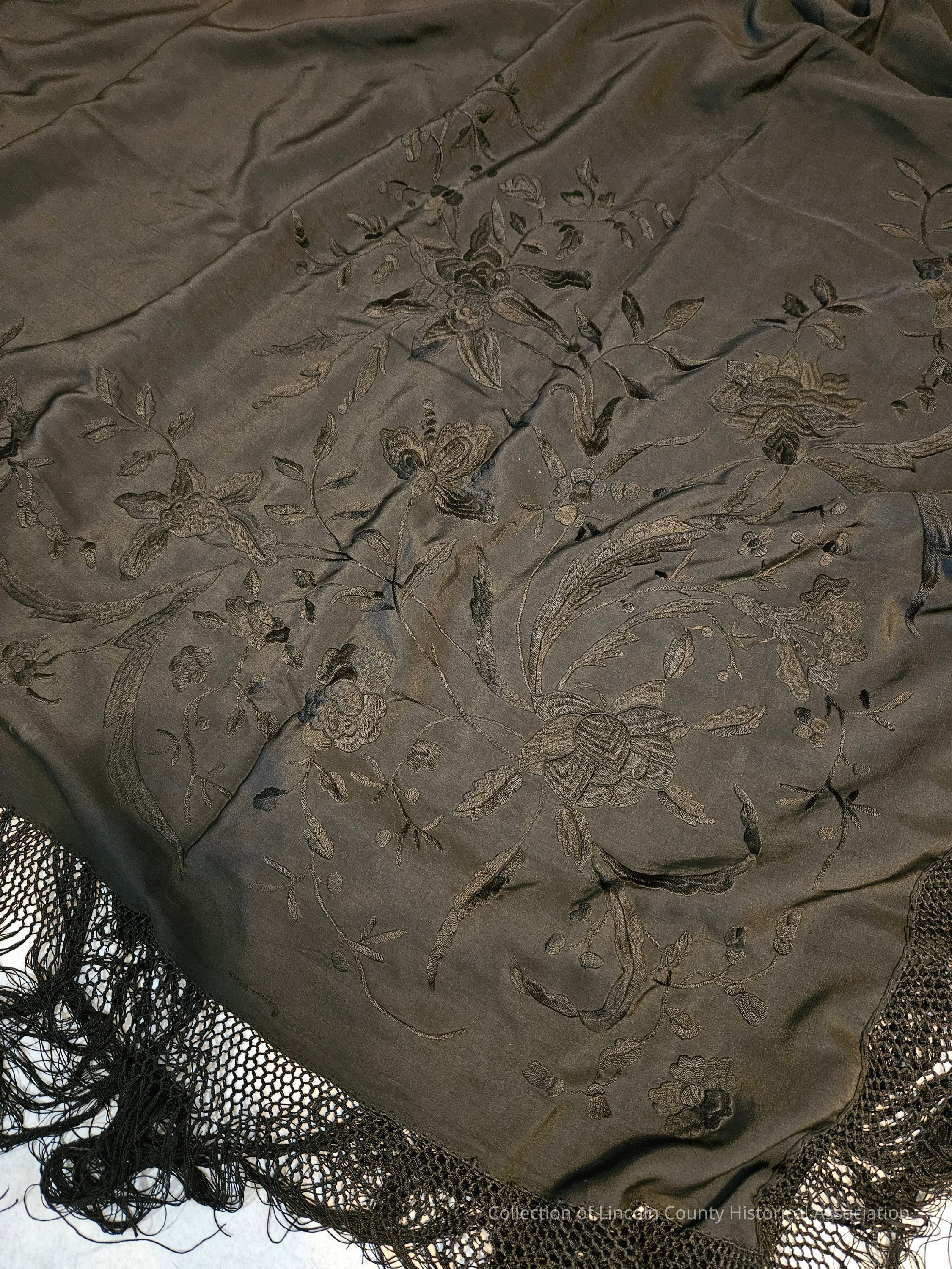 Black silk shawl with embroidered floral designs in two corners. Fringe around all sides. Rectangular in shape.Clothing/Dress/Costume Details
