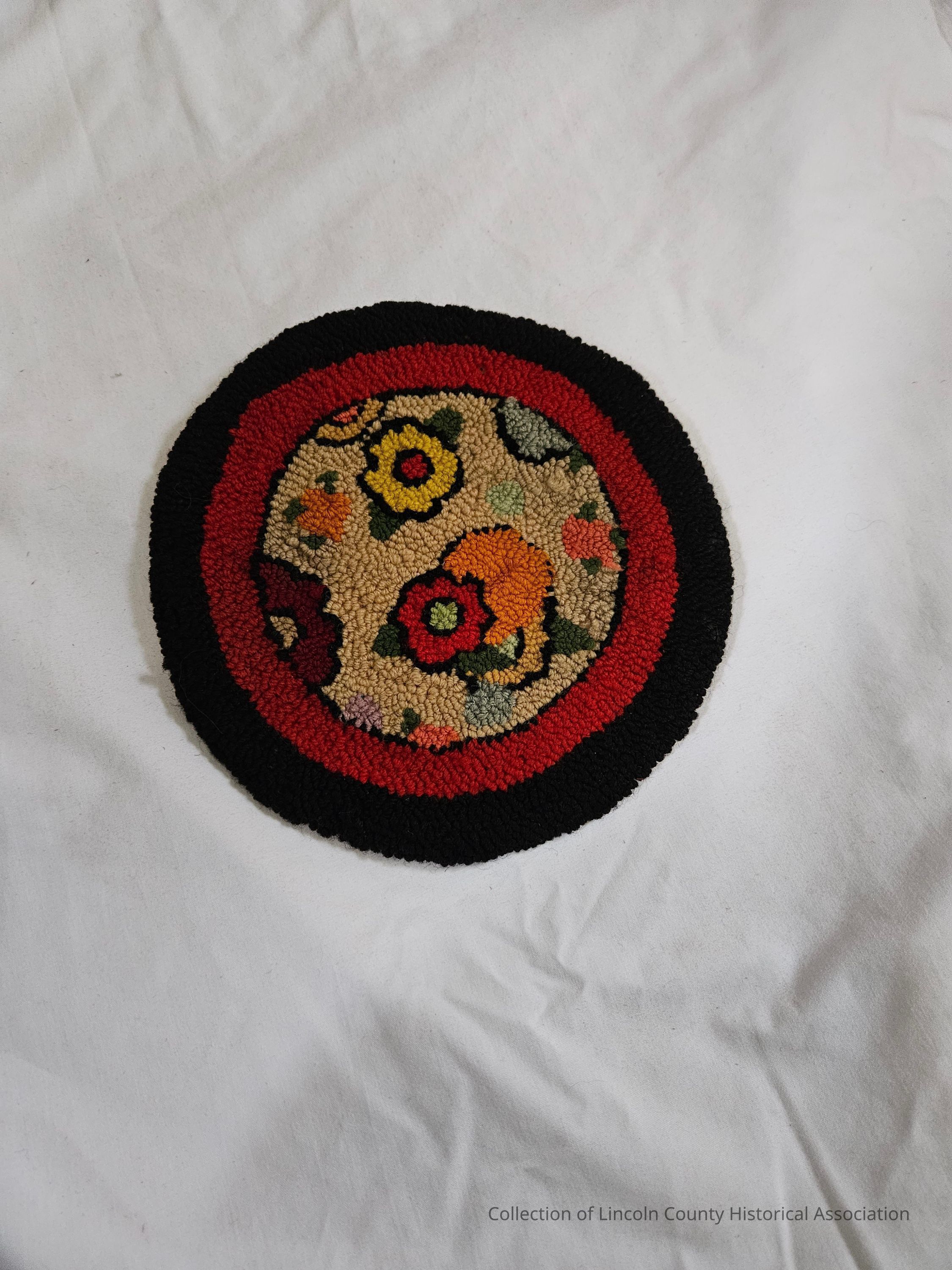 Small decorative hooked rug/mat. Slightly oval. Two outside ovals are red and black. Center oval is floral on a beige background.Made/Created