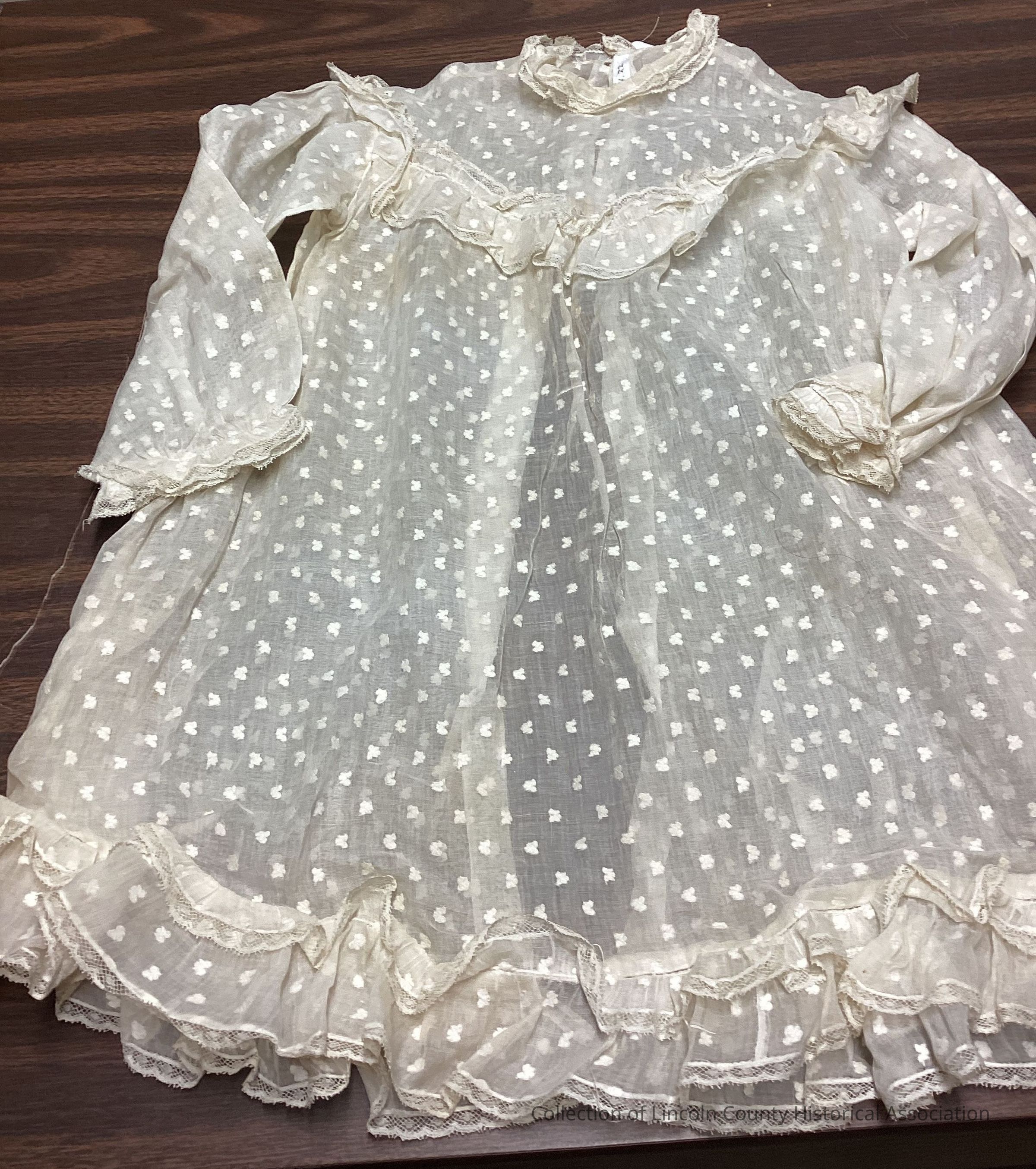 Child's thin white organdy dress. White dotted design. Ruffled cuff, collar, hemline, and chest. Lace trim on collar, cuffs, and hem. Open in back.Clothing/Dress/Costume Details
