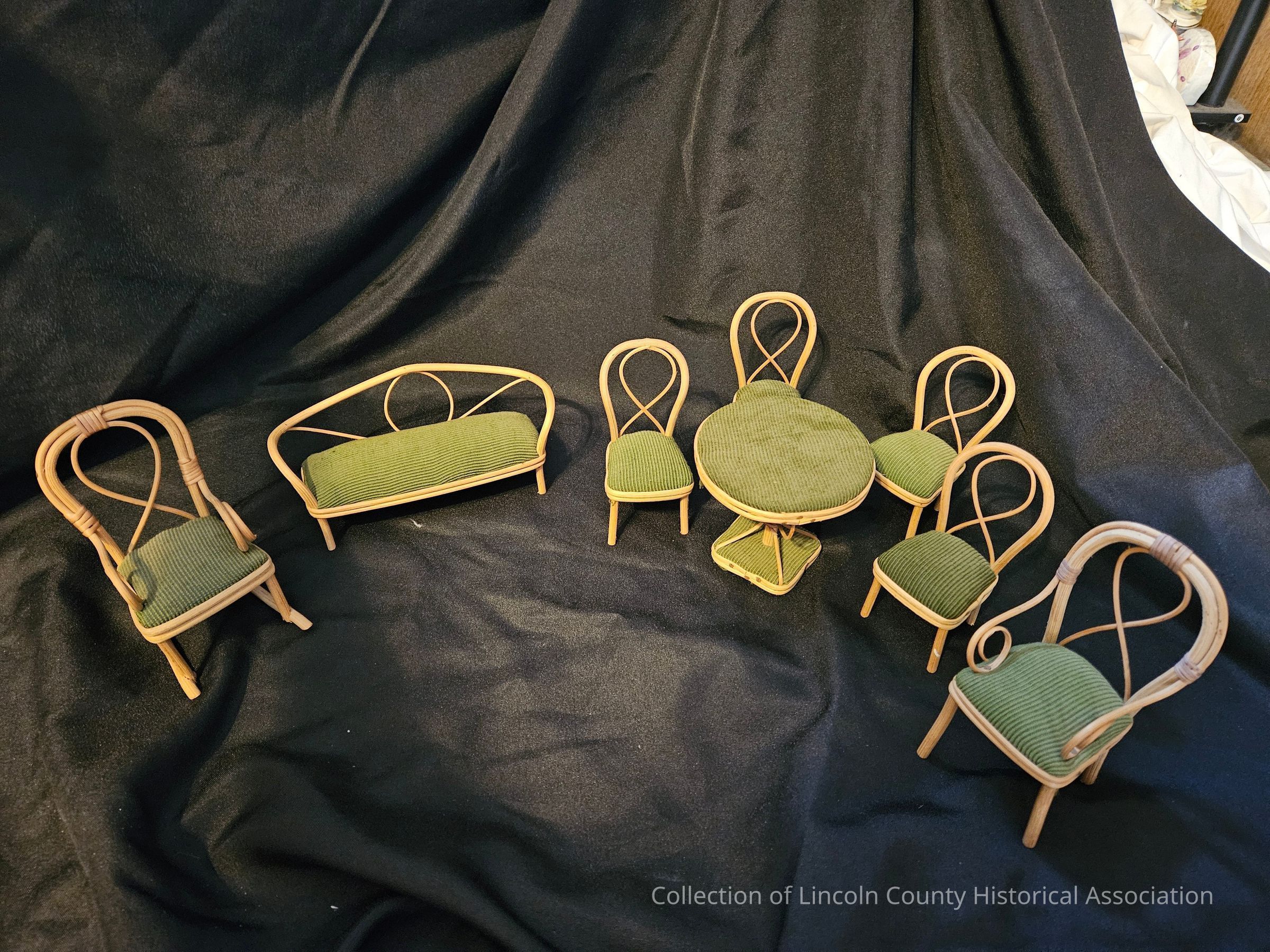Set of bent wood doll furniture. Green fabric lining chairs and table. Set includes one table and four matching chairs. One larger chair and one rocking chair. Also one sofa.