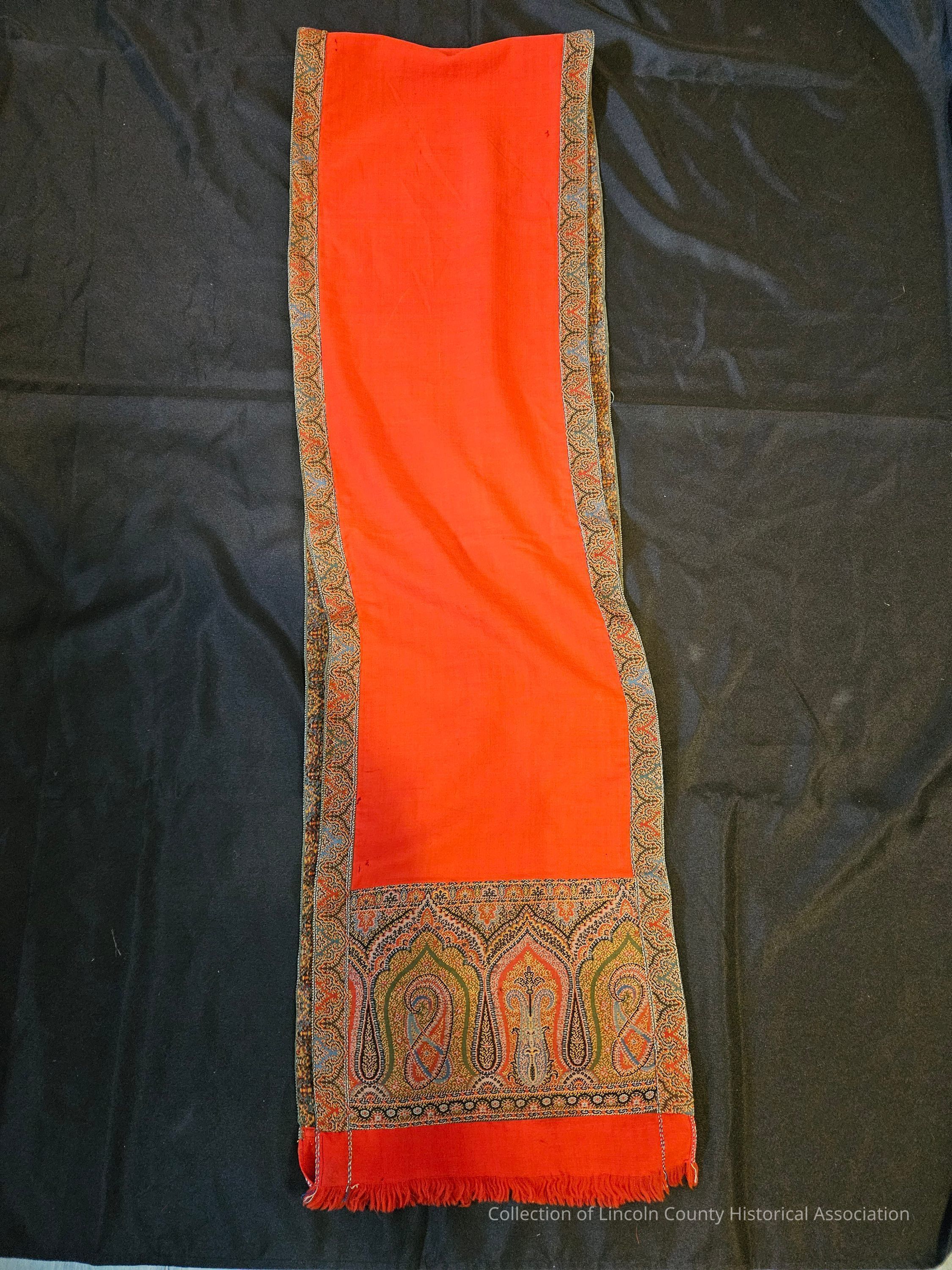 Red twill rectangular wool shawl. Long and thin. Inch and a quarter wide border, larger border at each end. Fringe at the end.