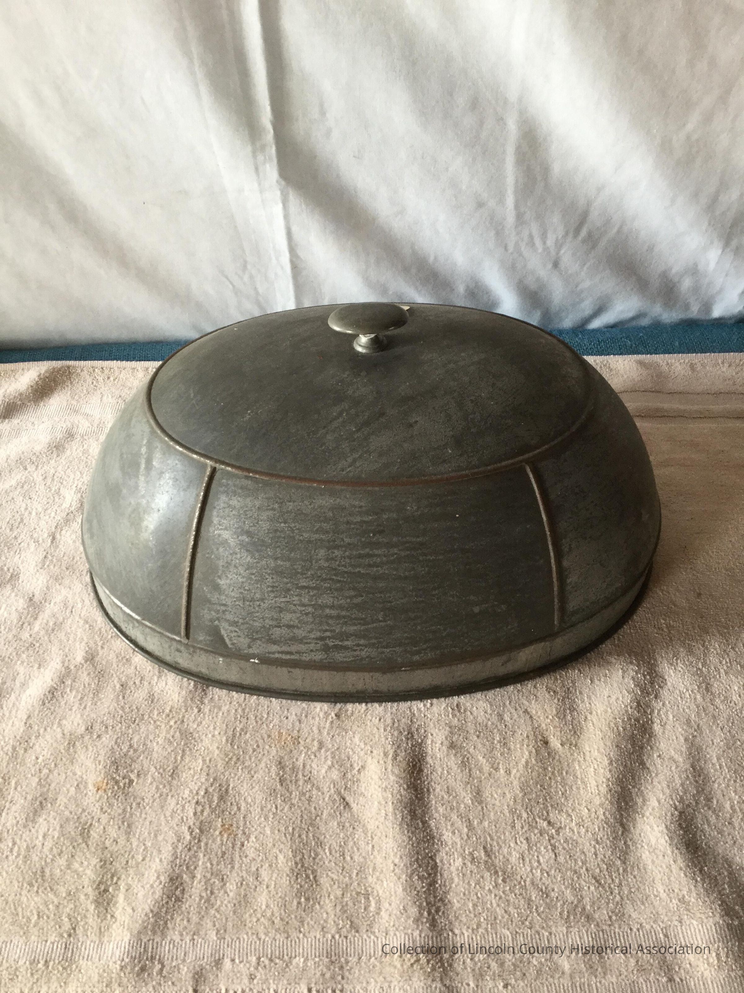 Oval, domed tin food cover with a metal knob at the topMade/Created