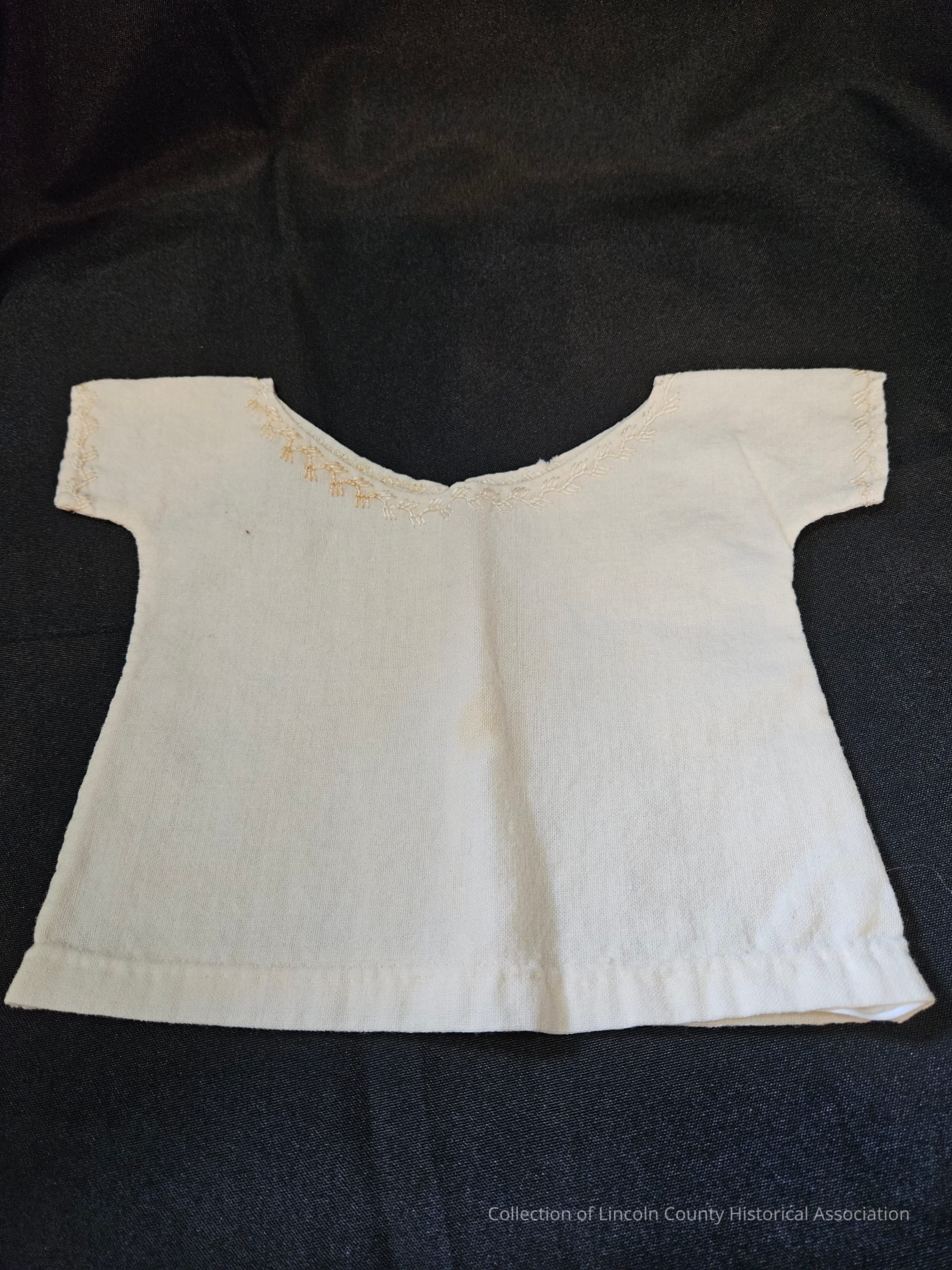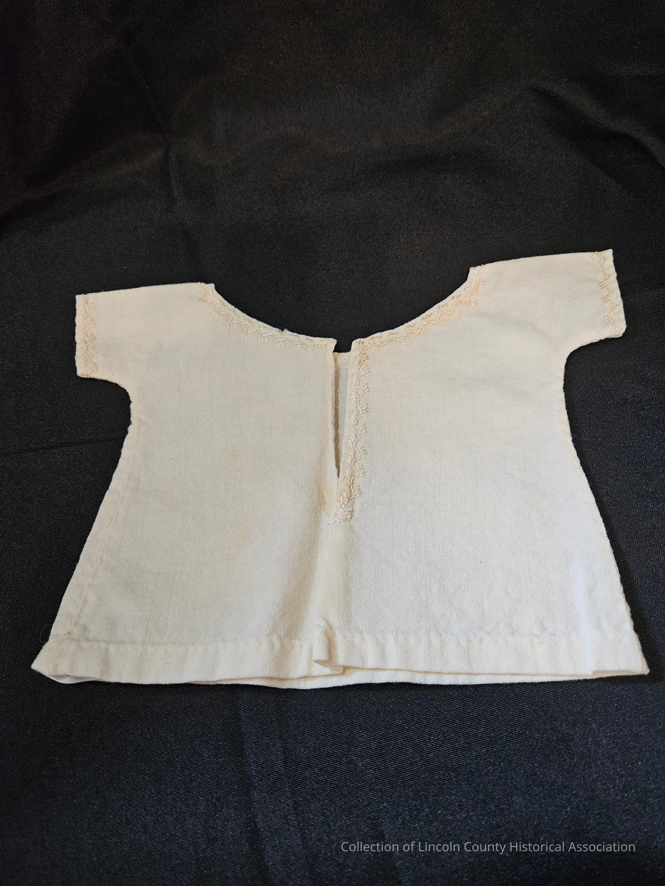 Wool infant shirt. Embroidered around neck and arms. "V" shaped opening on the back of shirt, embroidered on one side of opening.Clothing/Dress/Costume Details