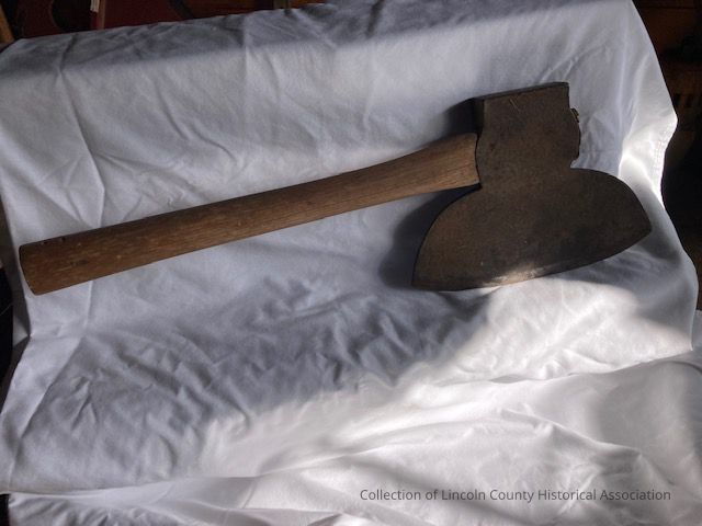 Full size hewing axe with a hickory handle. Blade is iron but with a steel tip. Its handle is nicely offset for a two-handed grip (in this case for a right handed person). In other words the handle has been deliberately bent.