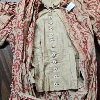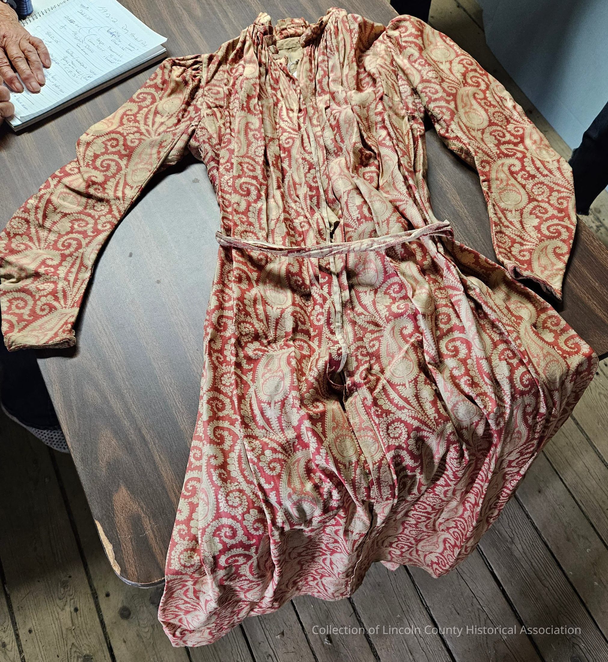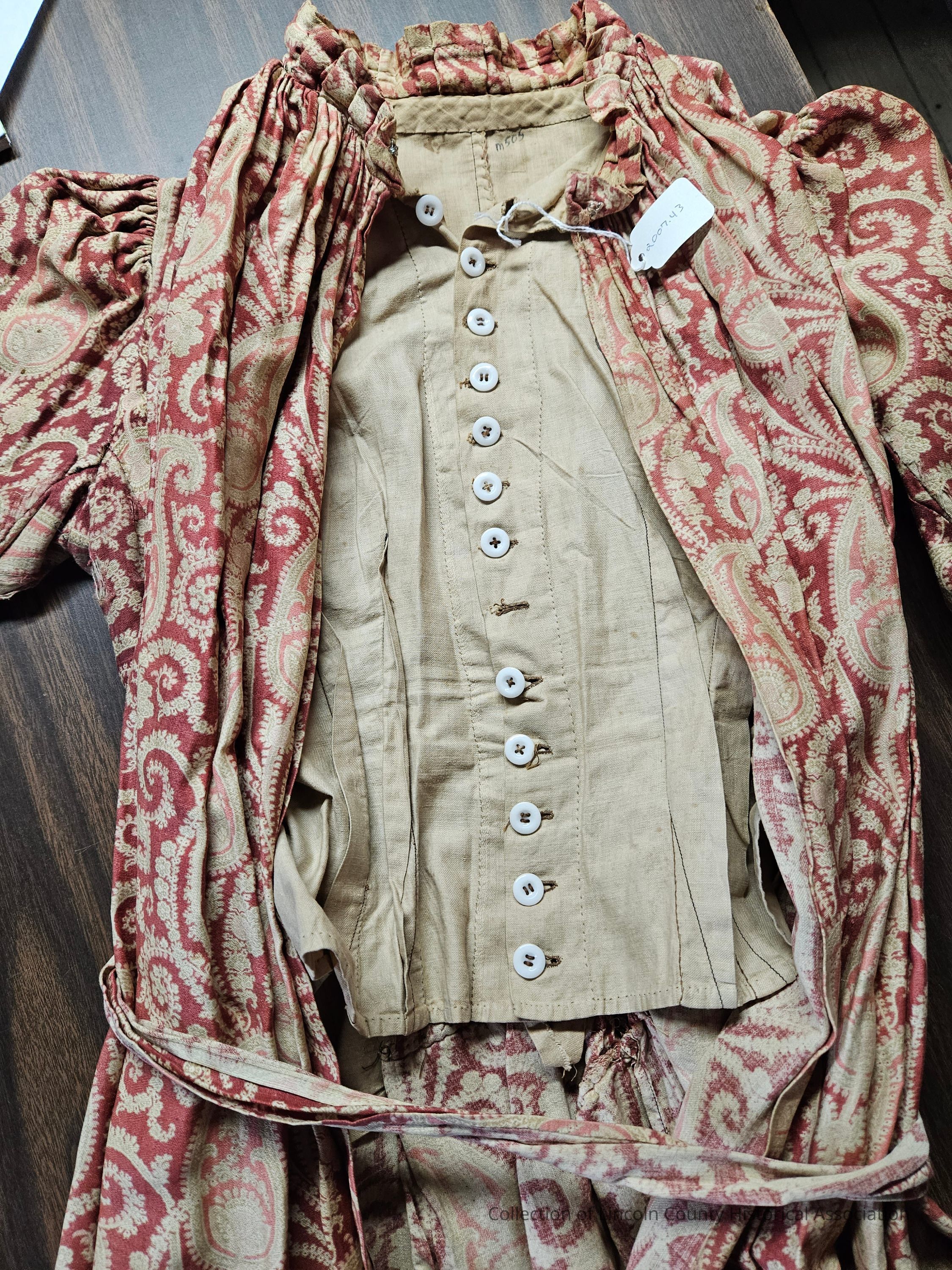 Red and white cotton paisley wrap dress. Ruffled collar, mutton sleeves. Interior vest with buttons. Tie around waist.Clothing/Dress/Costume Details