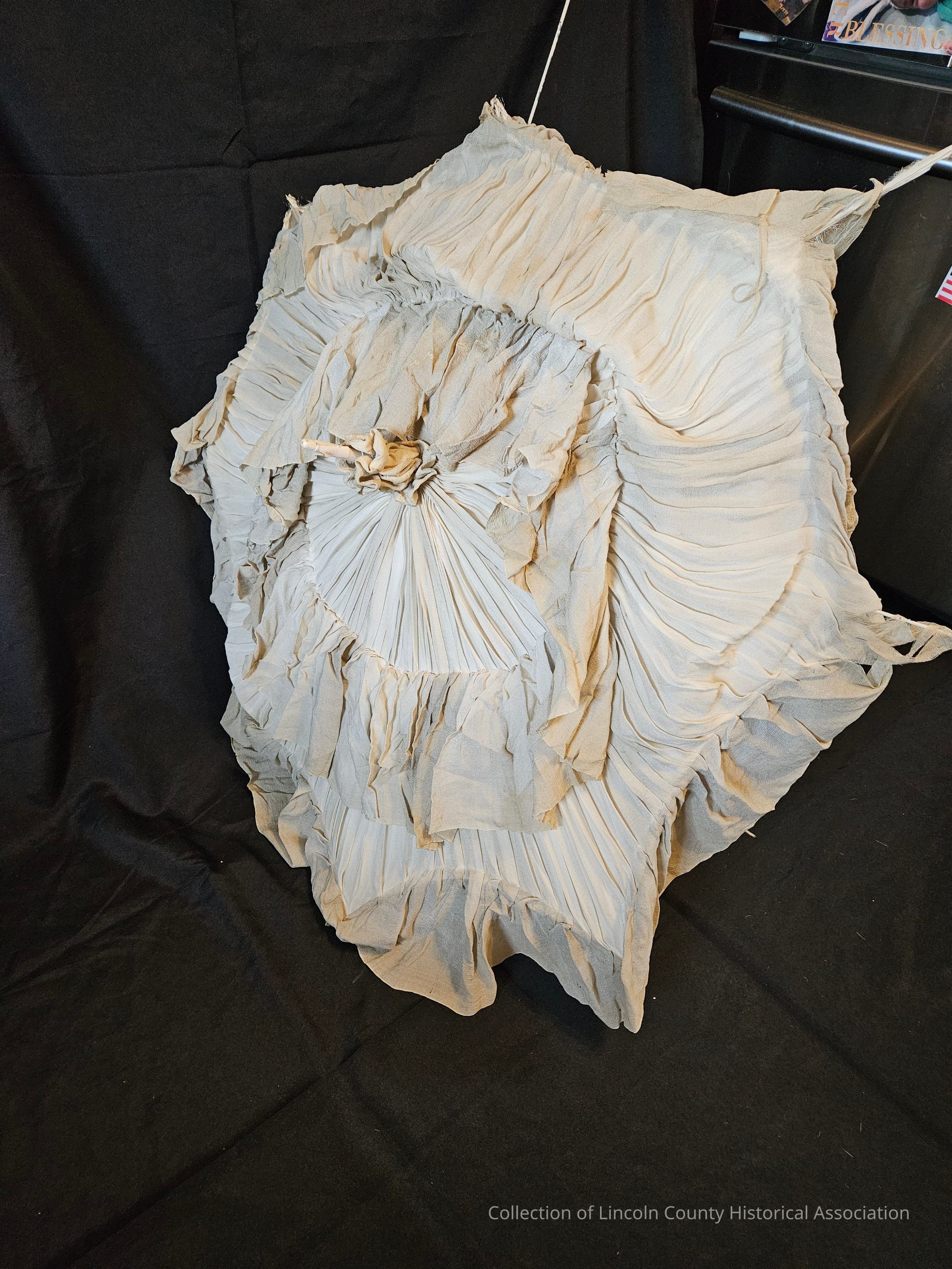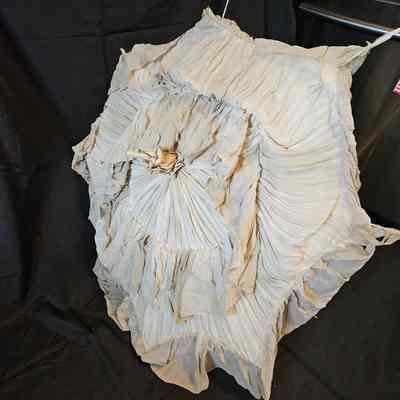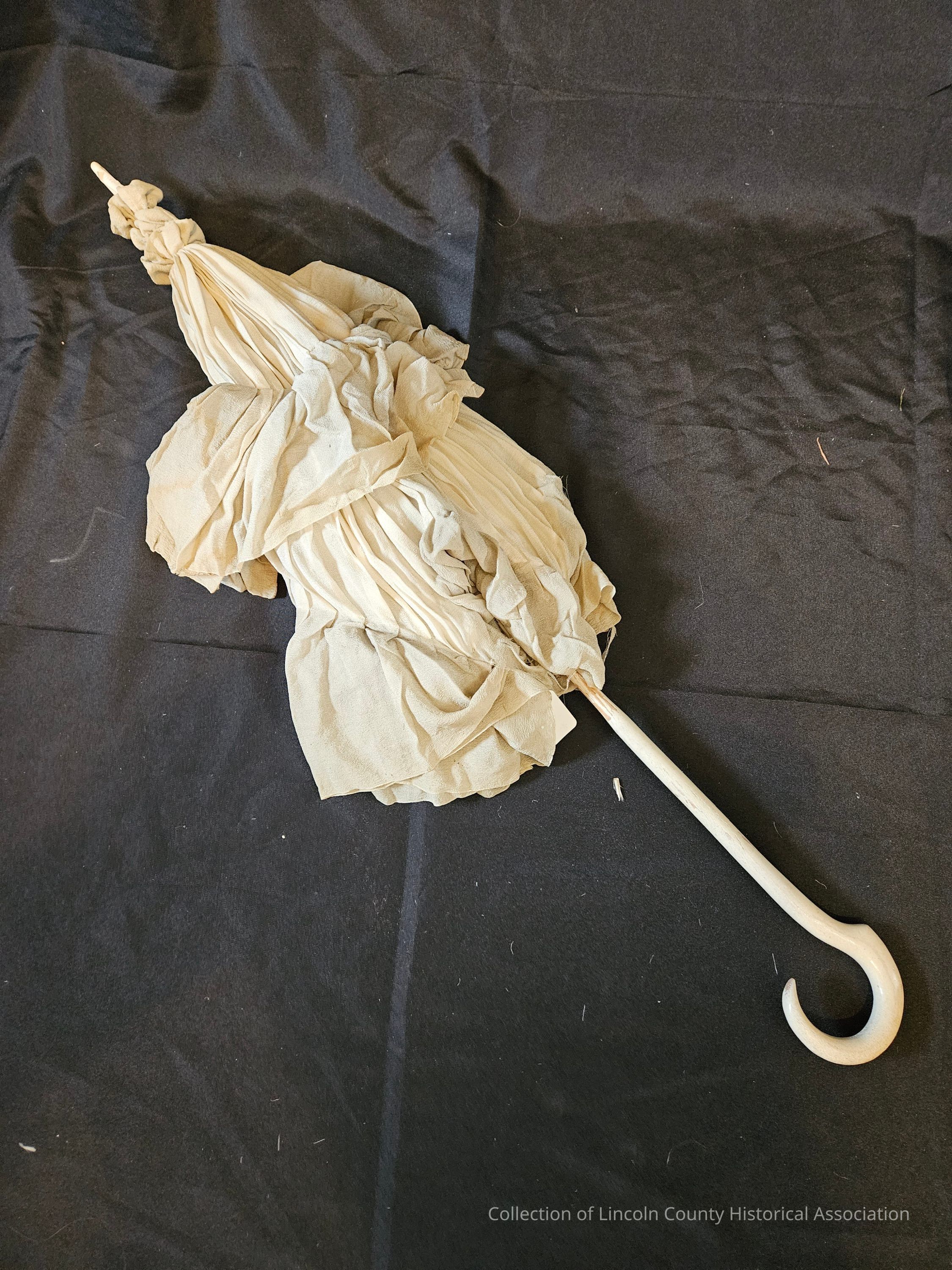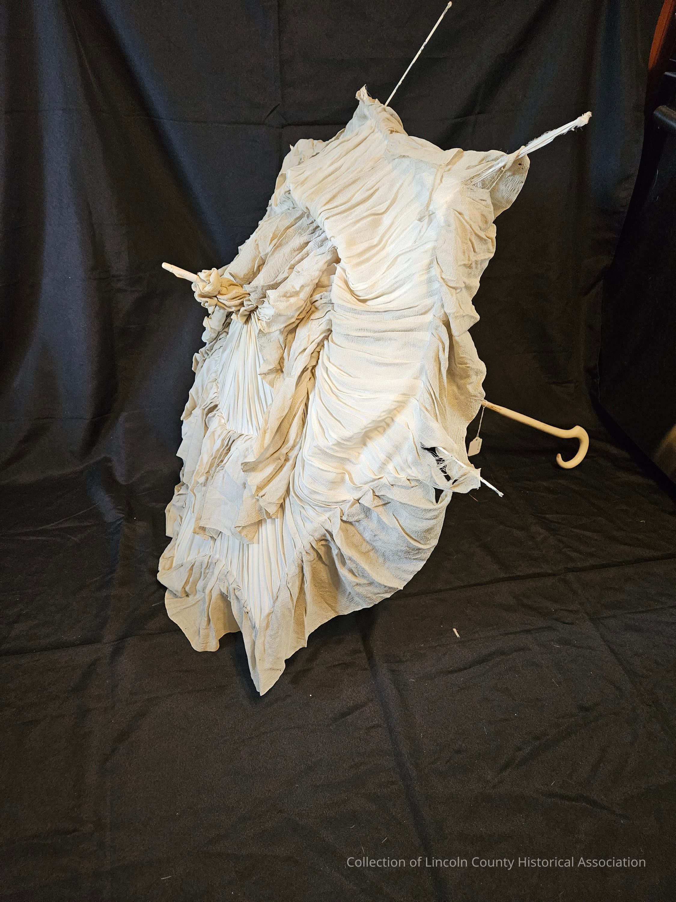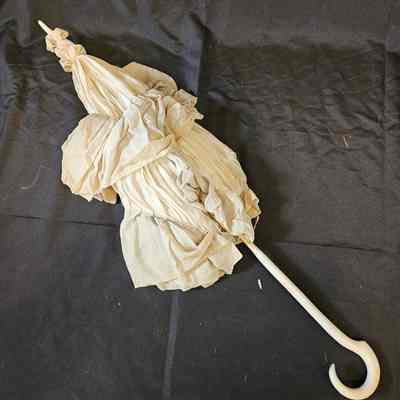 Cream colored pleated silk parasol/umbrella. Ruffles at center, bottom, and top of canopy. Wooden handle painted white, curved at the end. Metal ribs.Made/Created