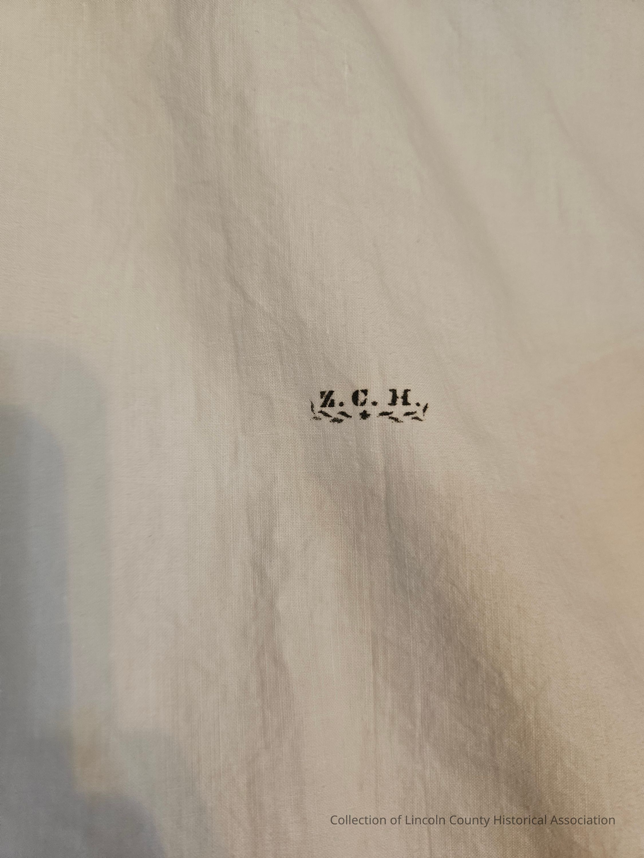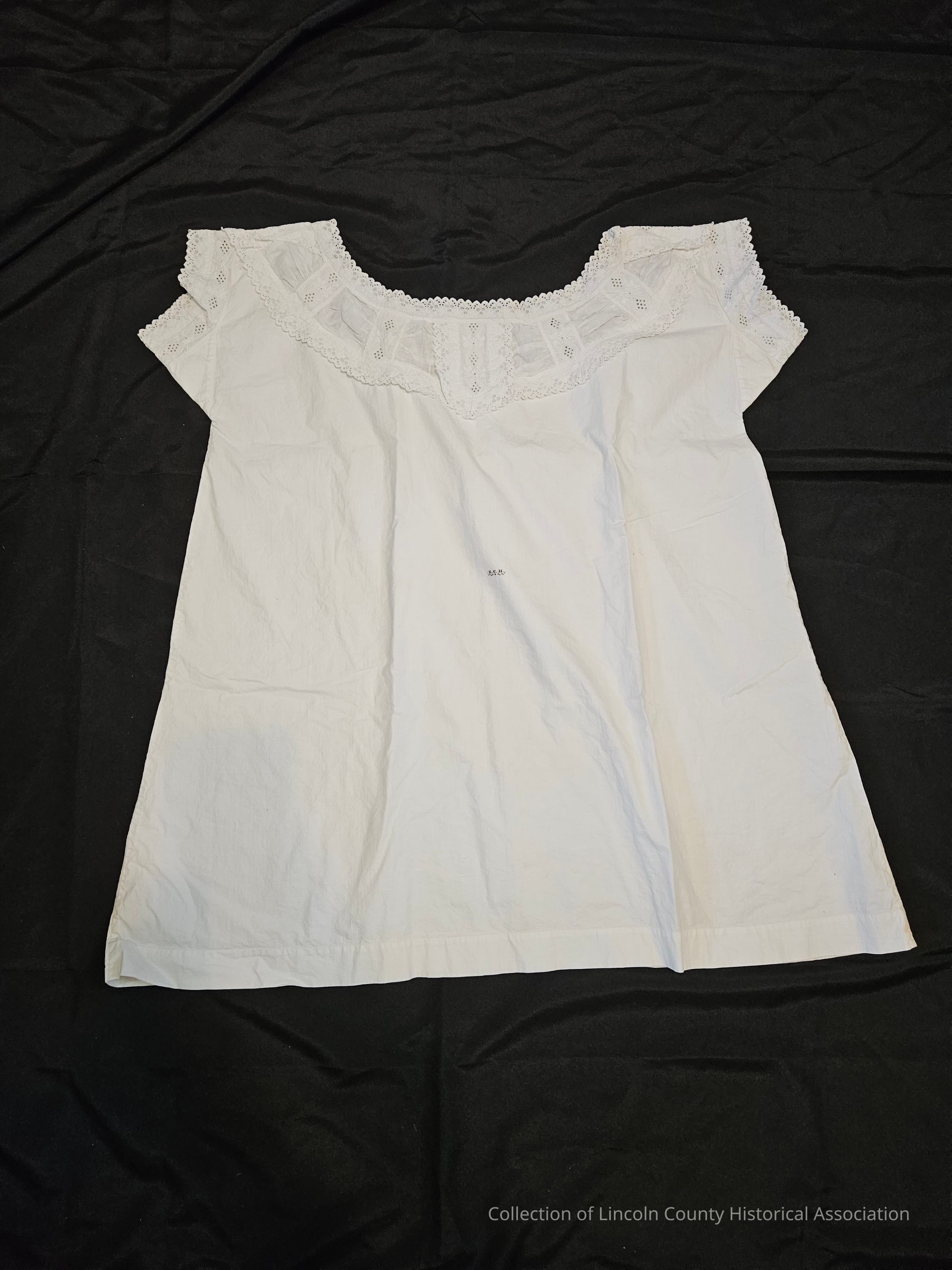 White cotton women's chemise with fancy embroidered collar back and front. Geometric and floral designs. Scalloped edging at end of sleeves and collar. Capped sleeves. Initials "Z.C.H." on the front in the center. Machine stitched. Short length.Clothing/Dress/Costume Details