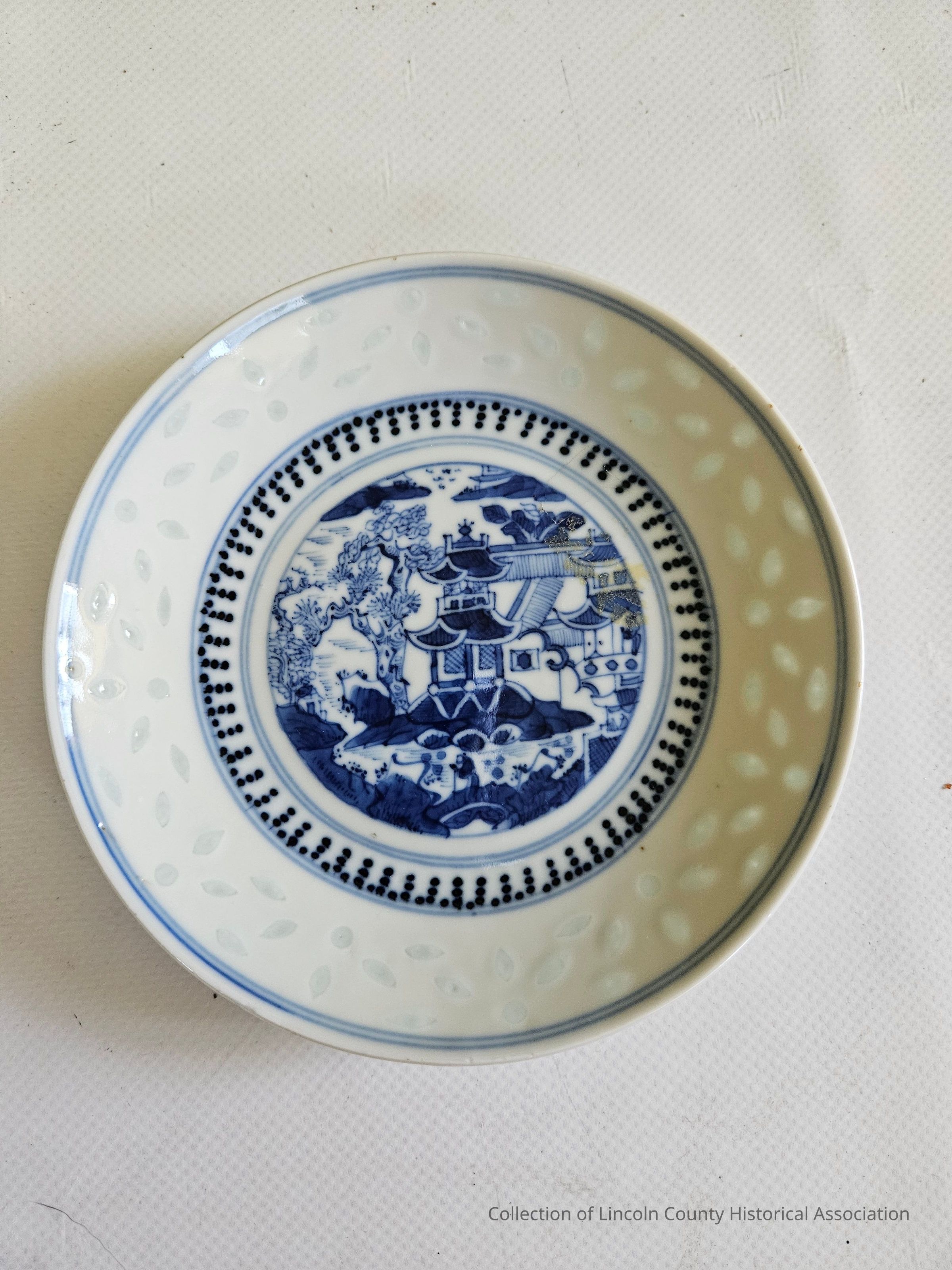 Small blue and white china dish. Two blue stripes around edge. Center image is a village scene. Around edge is a see through rice-like design.Made/Created