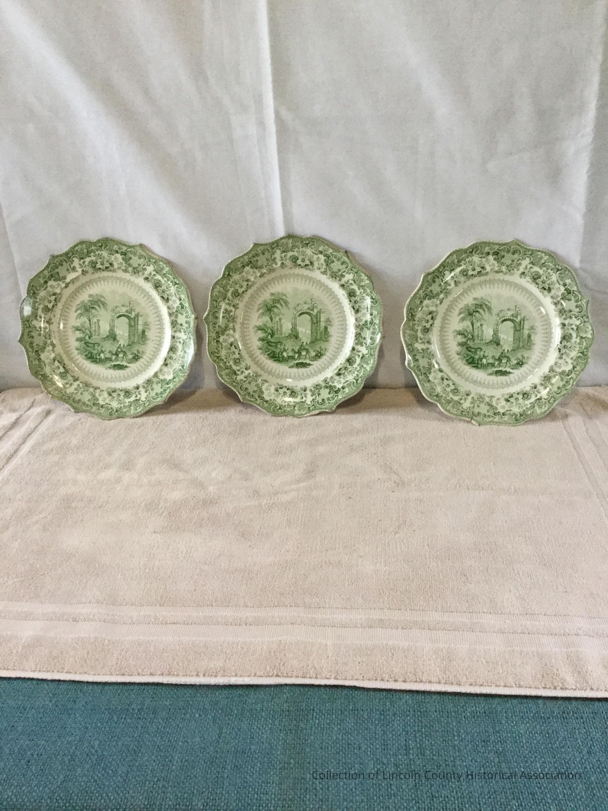 Set of three green transfer pattern Staffordshire plates with scalloped rimsMade/Created