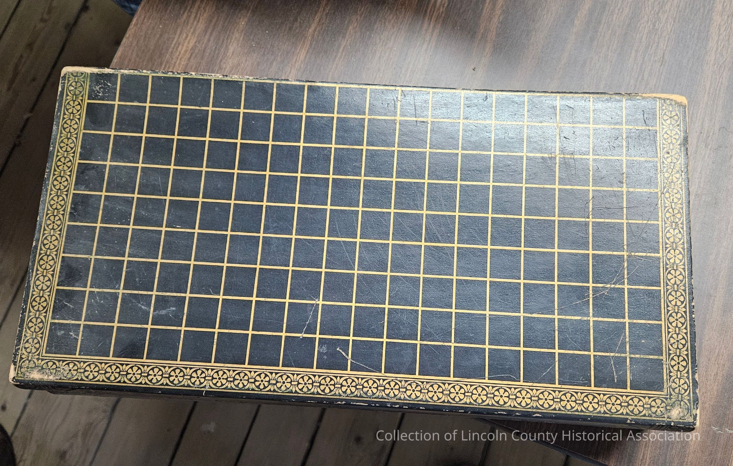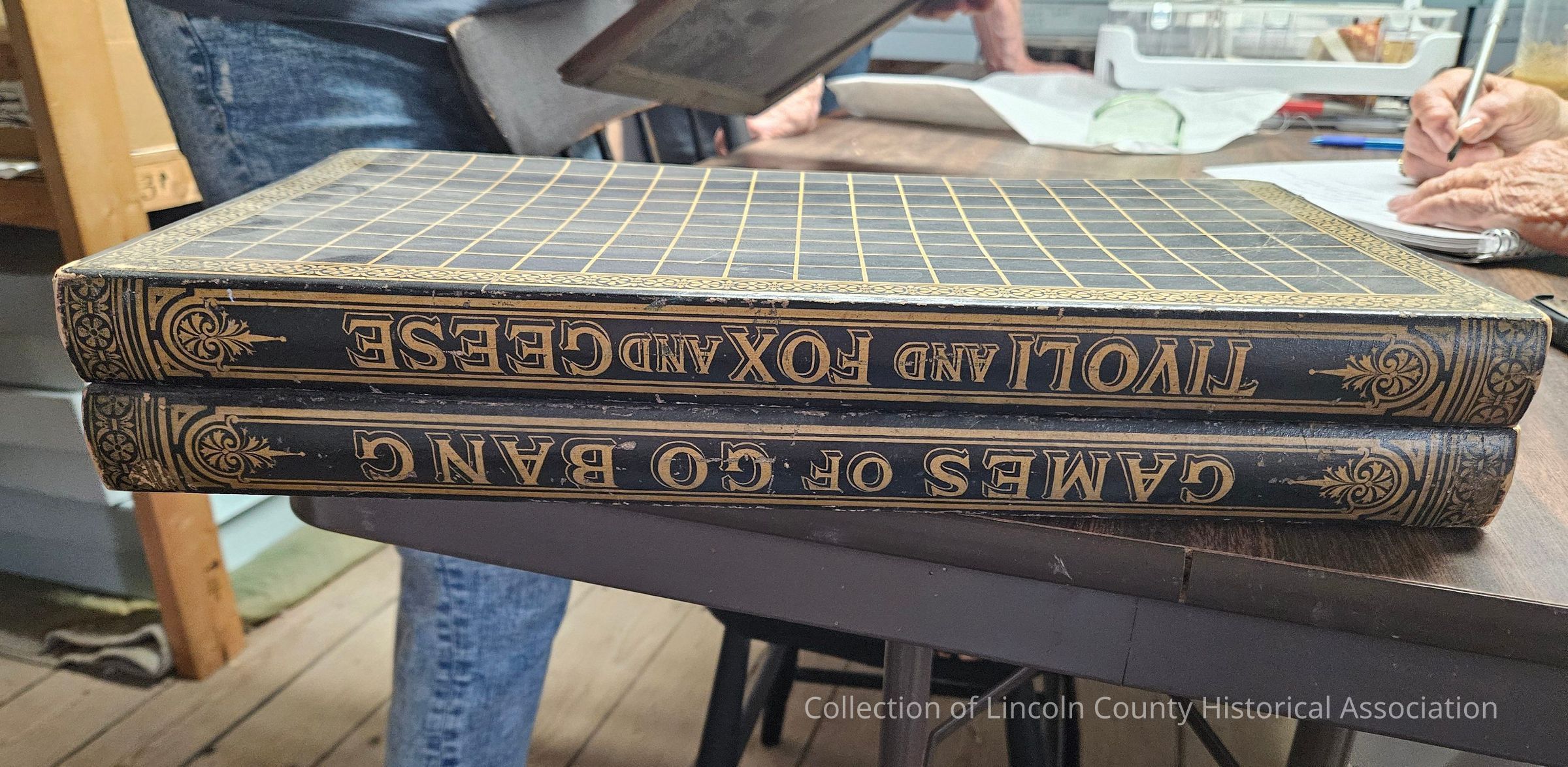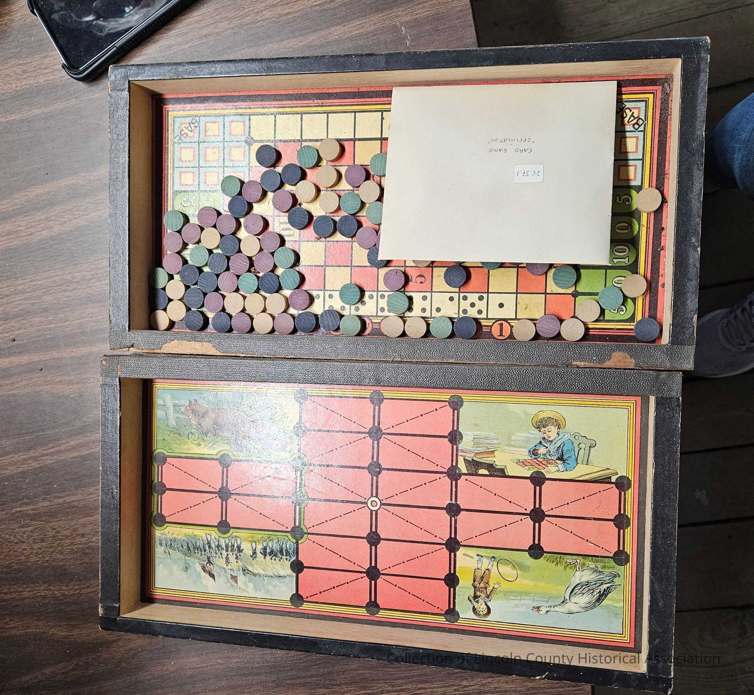 Double wooden playing board that folds up. The hinge or fastening is missing. Labeled for playing games of Go Bang, Tivoli, and Fox and Geese. Wooden frame covered with paper. Top and bottom sides of board is covered in black and yellow squares. Inside has two different games and wooden circular playing pieces. Also included inside is 75.37.1, a pack of instructions for the games.Made/Created