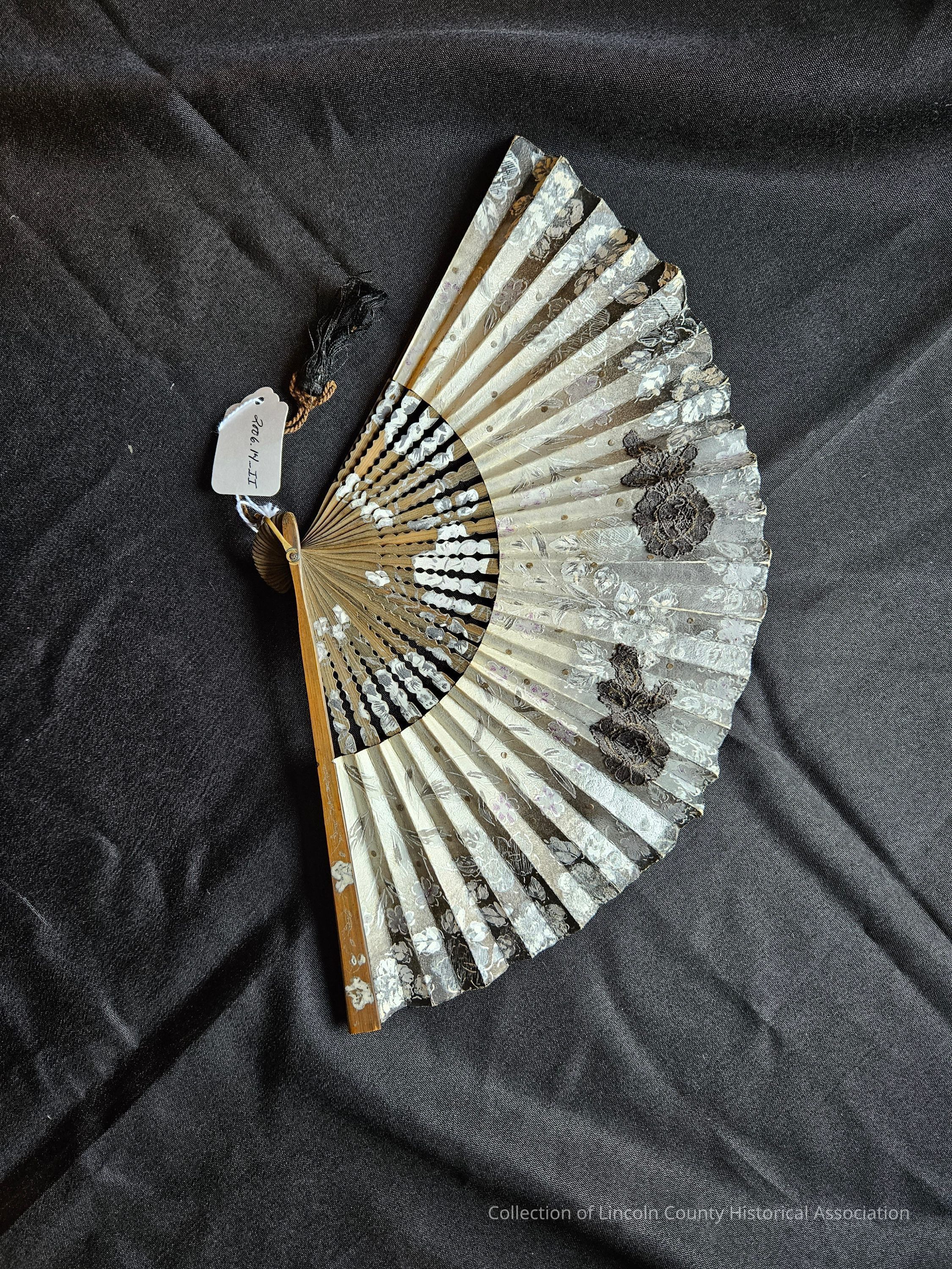 Paper fan with silver, white, and black hand painted floral designs. Two lace flowers in the center. 25 bamboo sticks with white and black painted designs. Metal pivot with black tassel.