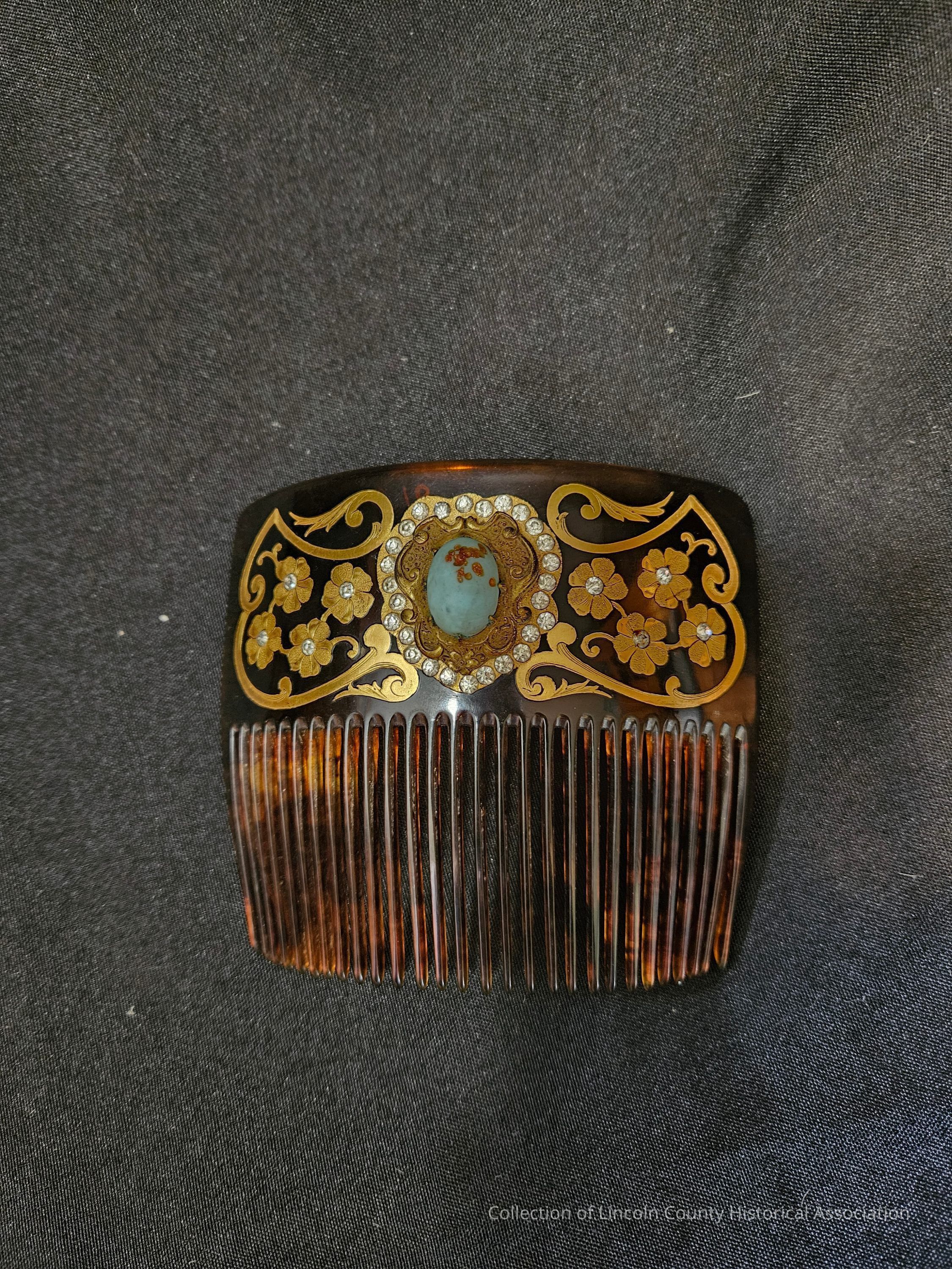 Ornamental tortoiseshell hair comb with gold floral design at top. White gems with robin's egg blue stone in the center. 28 teeth.Made/Created