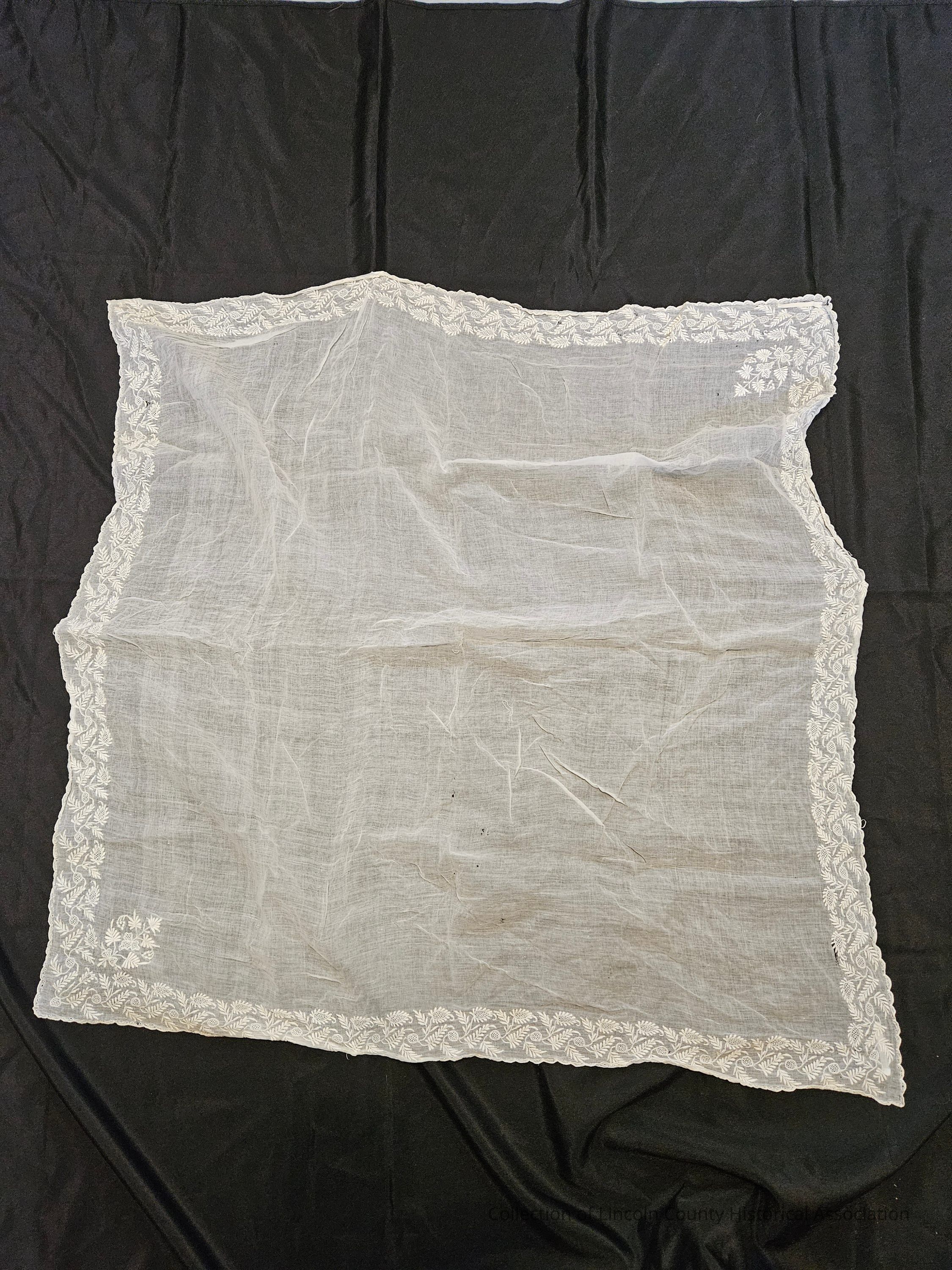 Sheer white cotton scarf/shawl. Embroidered floral pattern around the edges. Scalloped edging. Two corners have more intricate floral design. Rectangular in shape.Clothing/Dress/Costume Details