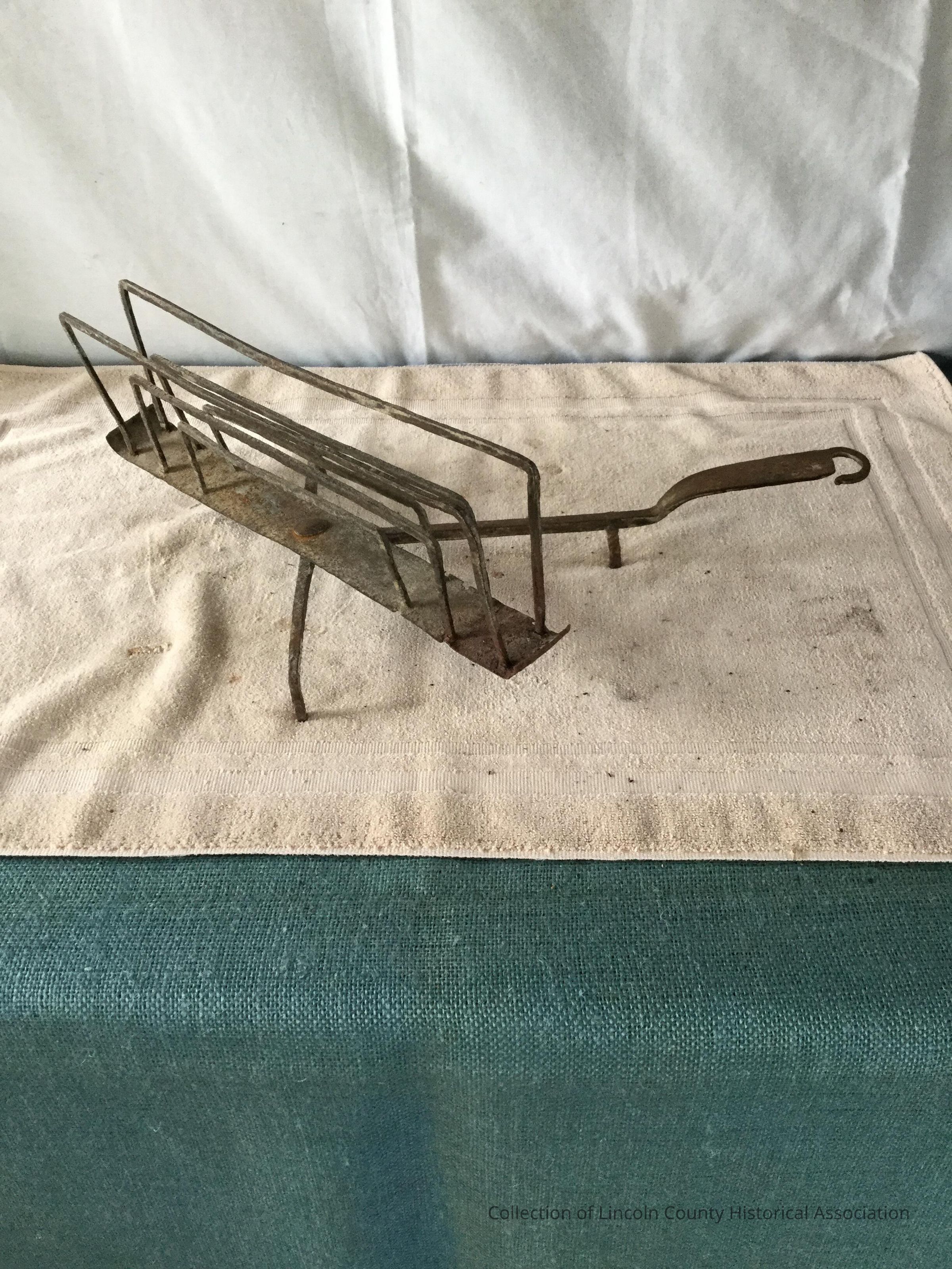 Wrought iron toaster with a long handle with a hook at the end. Handle supported by 3 legsMade/Created