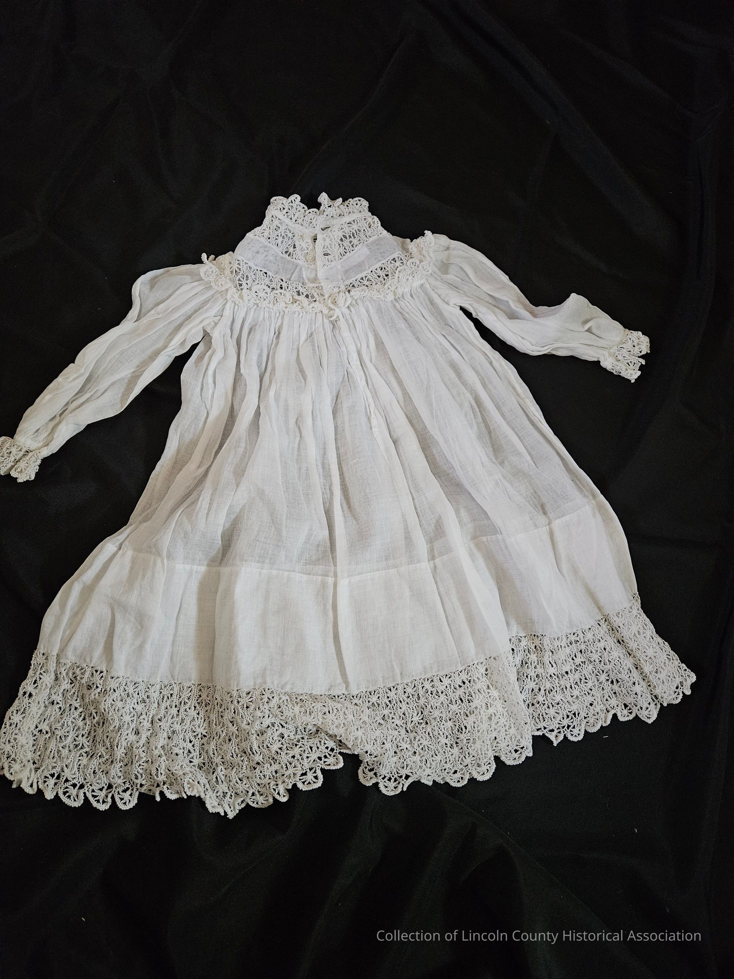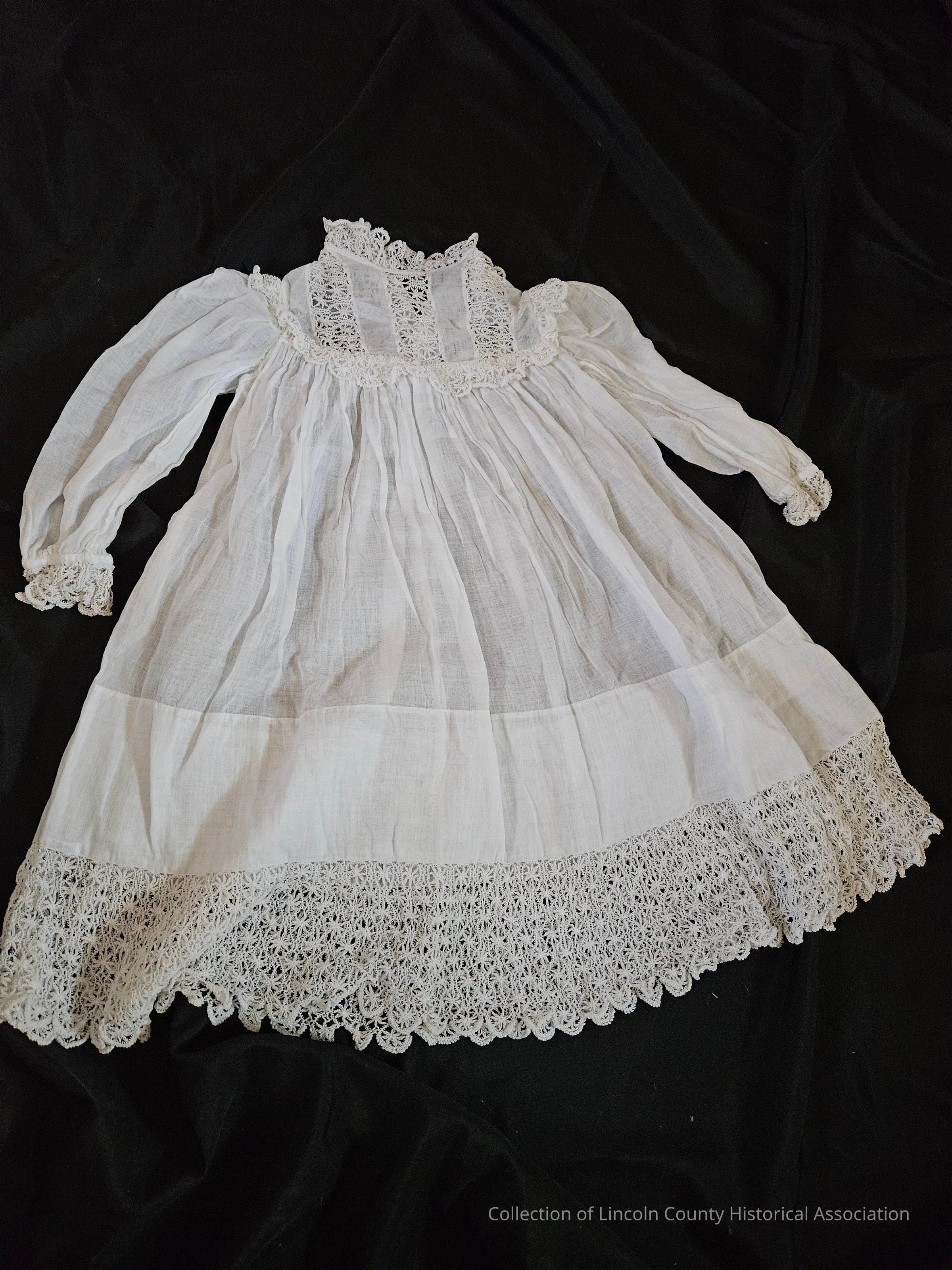 White child's dress. Hand crocheted hemline, collar, and sleeve edges. Also crocheting on front of chest. Three button closure on back of neck.Clothing/Dress/Costume Details