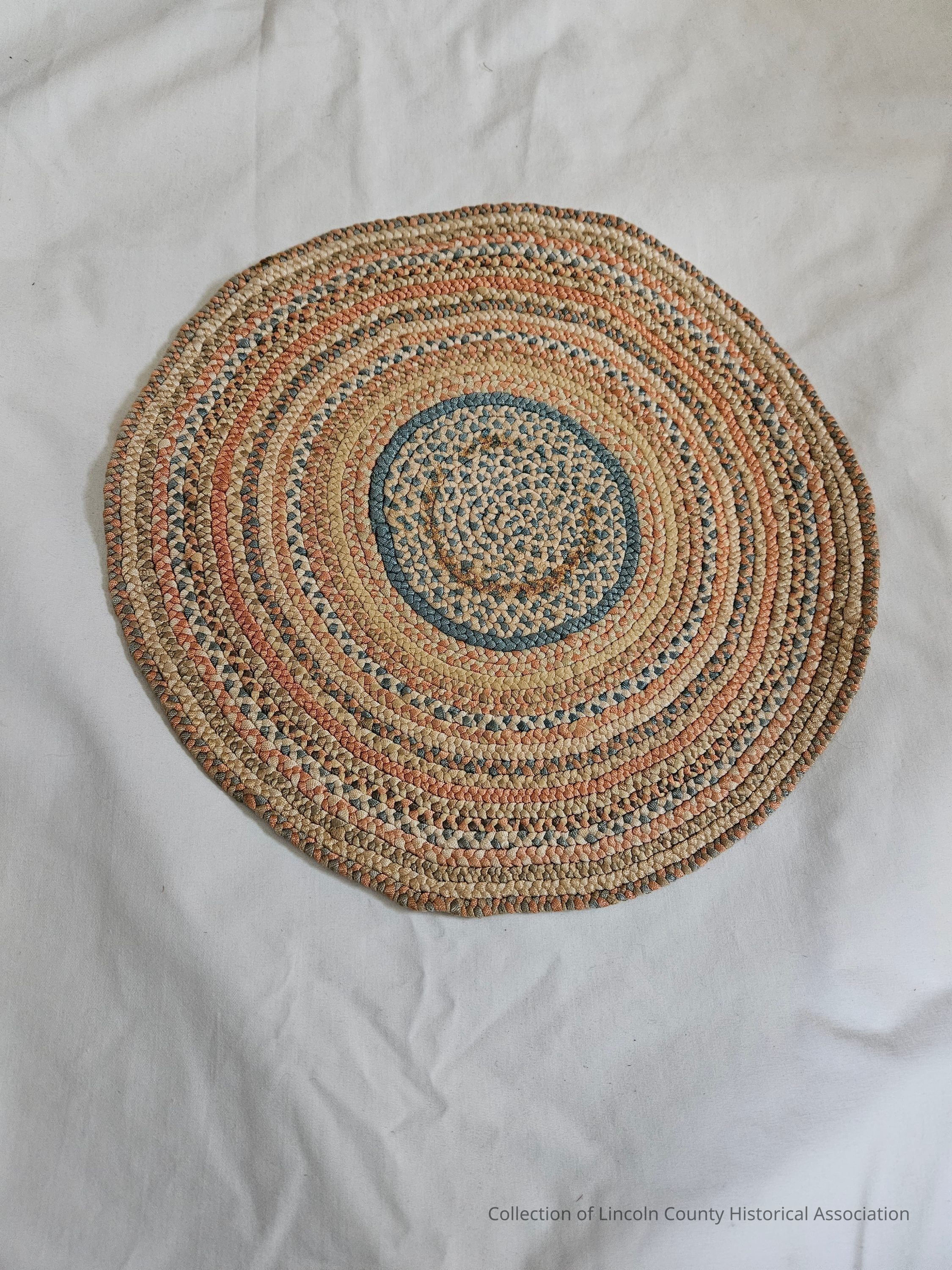 Small decorative braided rug. Circular in shape. Mostly pink, tan, and blue in color. Blue and white center.Made/Created