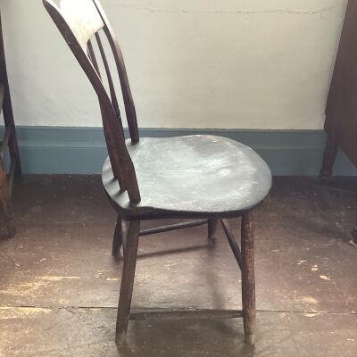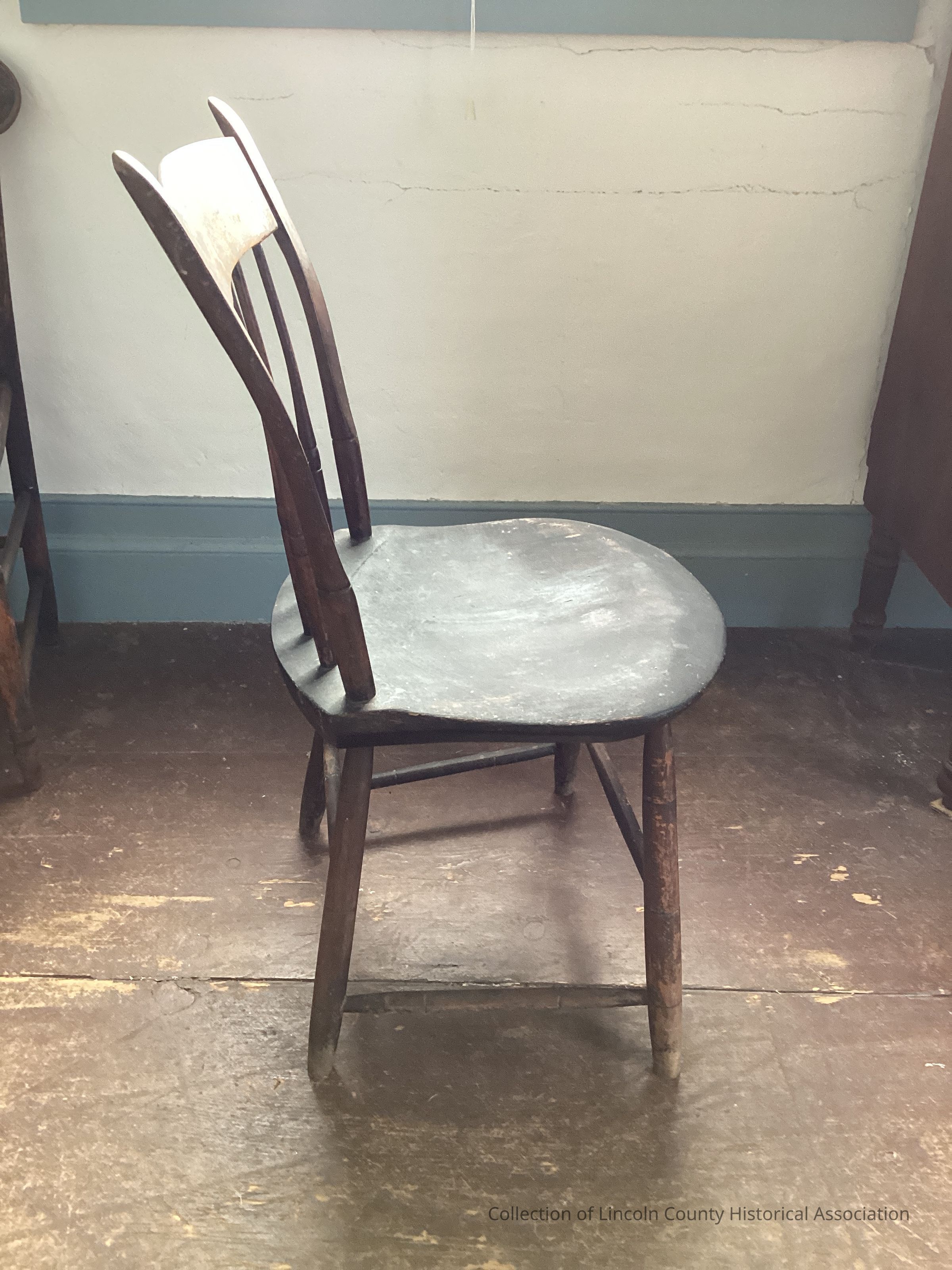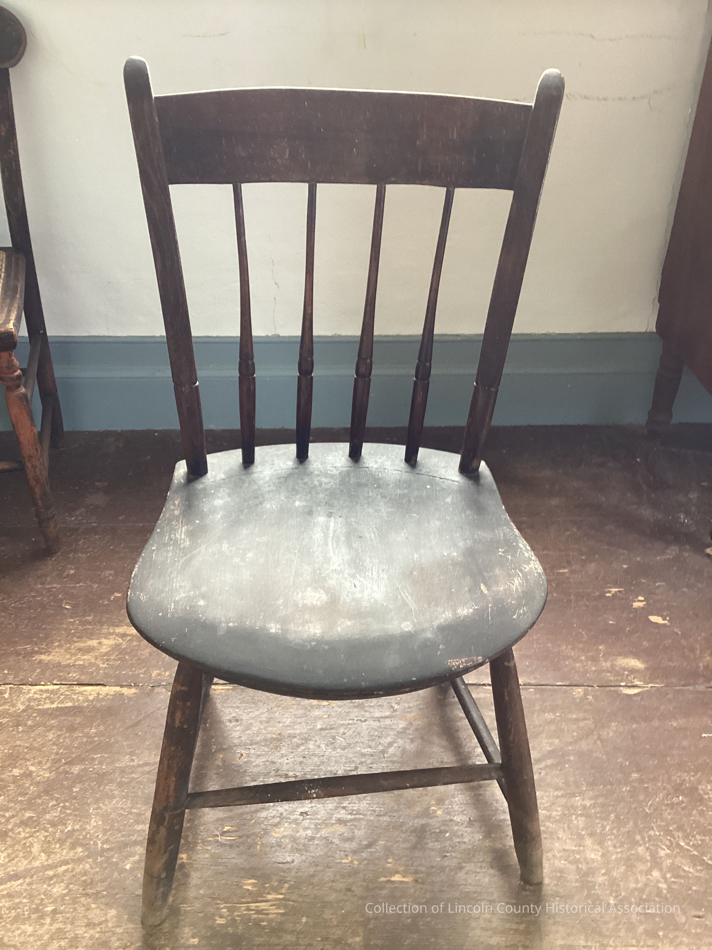 Brown, spindle back chair with turned and splayed legs, no arms. Stiles capped by so-called "Rabbit Ears".Made/Created