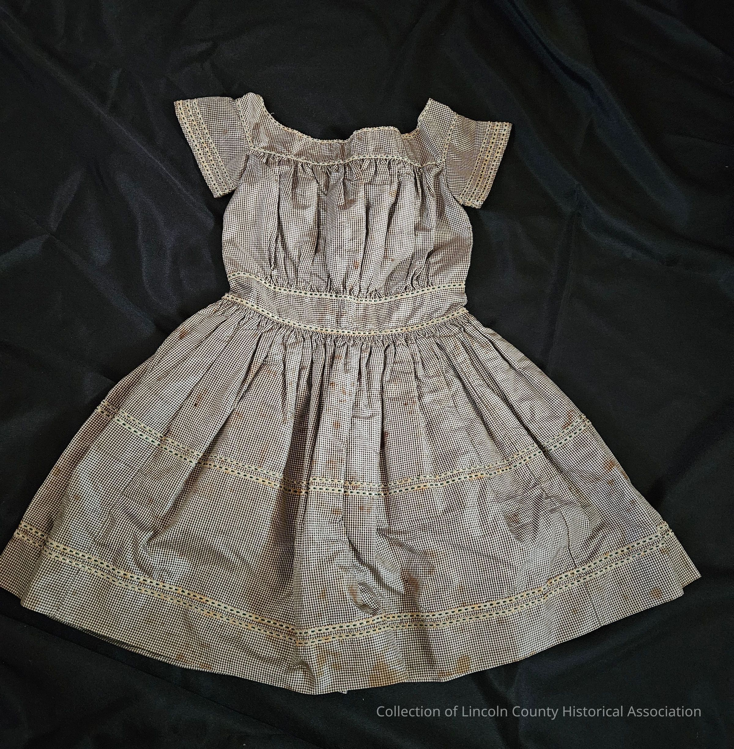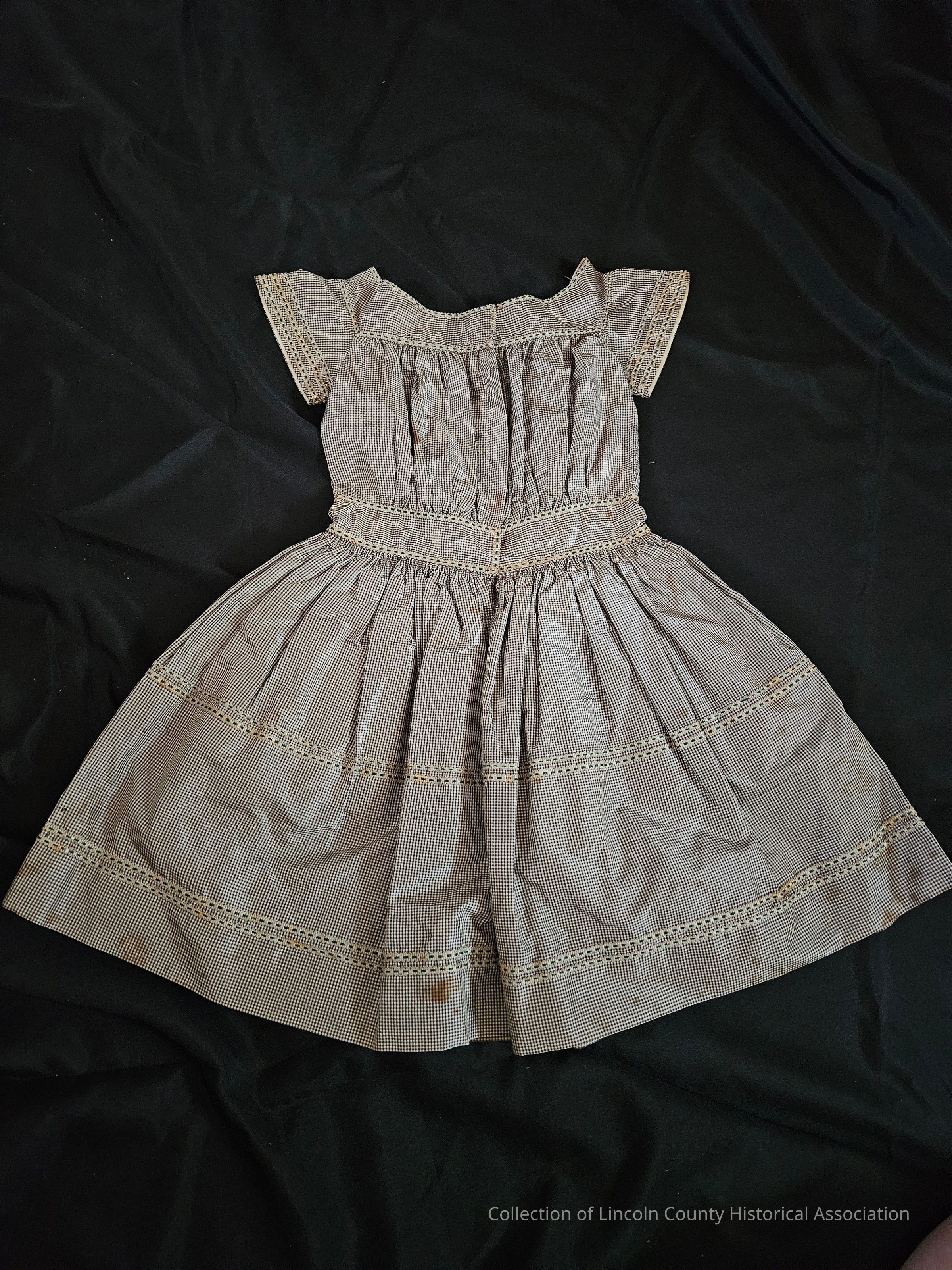 Brown checked child's dress. Raised ribbon bands around neck, arms, waist, and bottom of skirt. Pleated skirt. White cotton lining underneath skirt. Two hook closures at back of neck and two at waist.Clothing/Dress/Costume Details