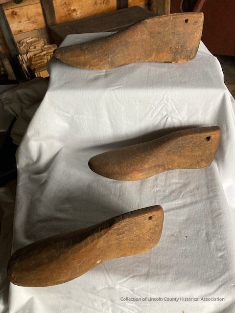 Group of three maple shoe lasts of various sizes. A is designed for a left foot shoe whereas B and C are for a right foot shoe.