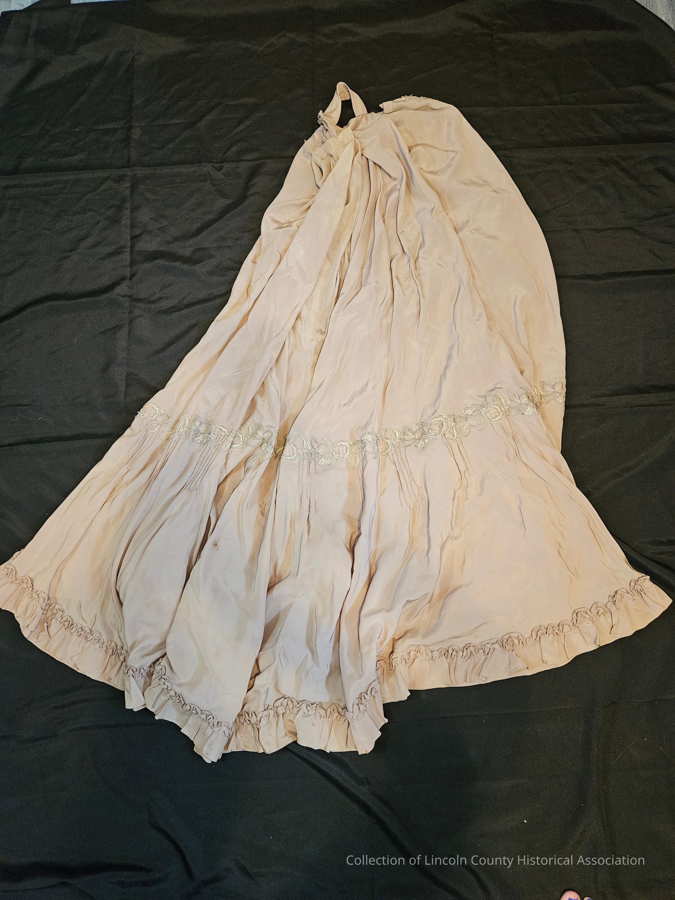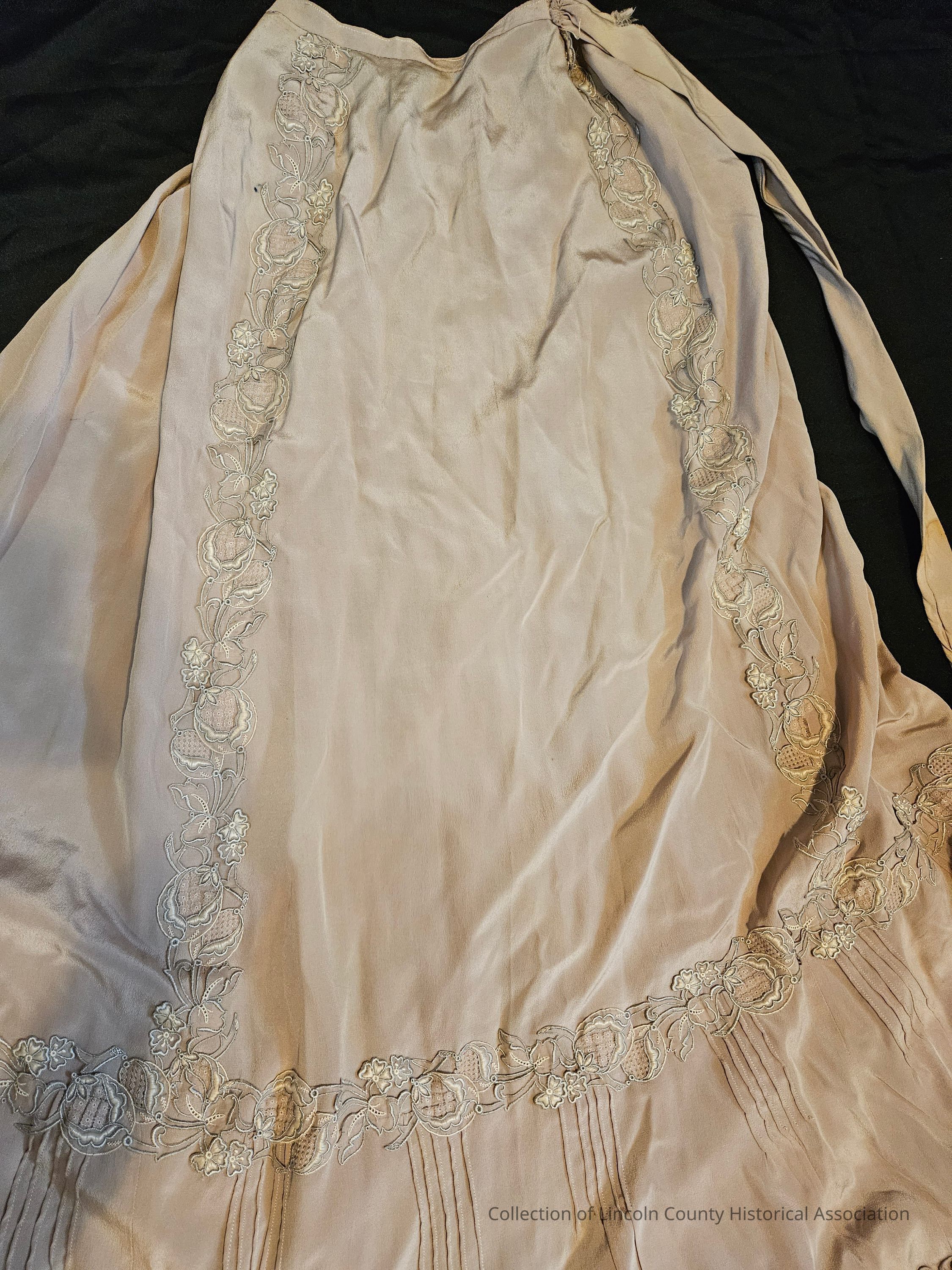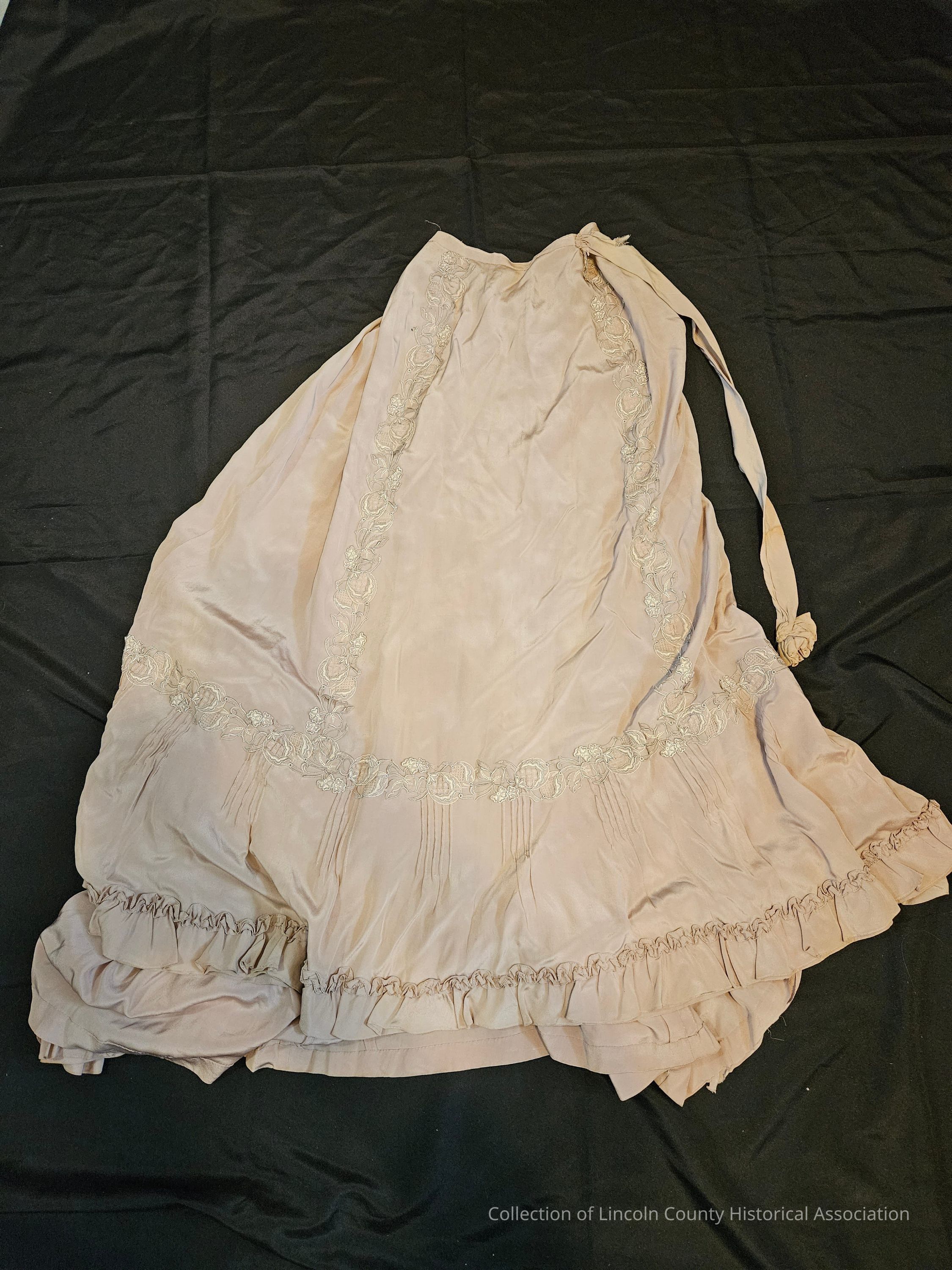 Beige silk skirt with floral embroidery down the front and around the bottom. Ruffled hemline. Two layers of fabric at the bottom of the skirt. Ribbon tie around the waist and two metal button closures at one side of waist. Mostly handstitched with some machine stitching at waist and hem.Clothing/Dress/Costume Details