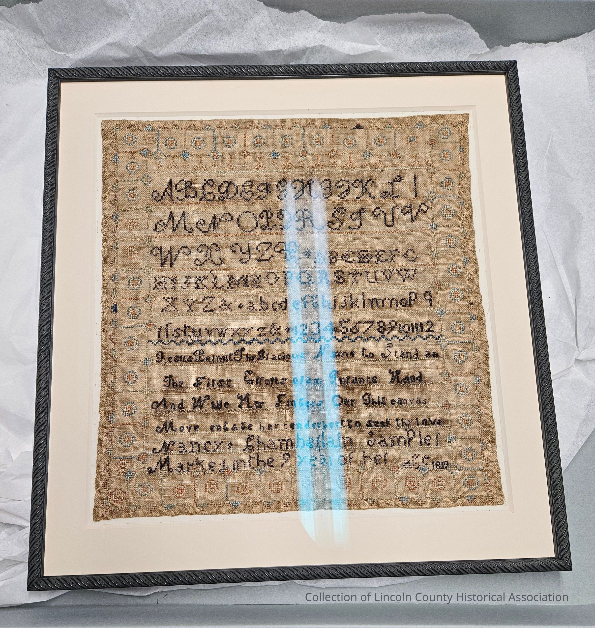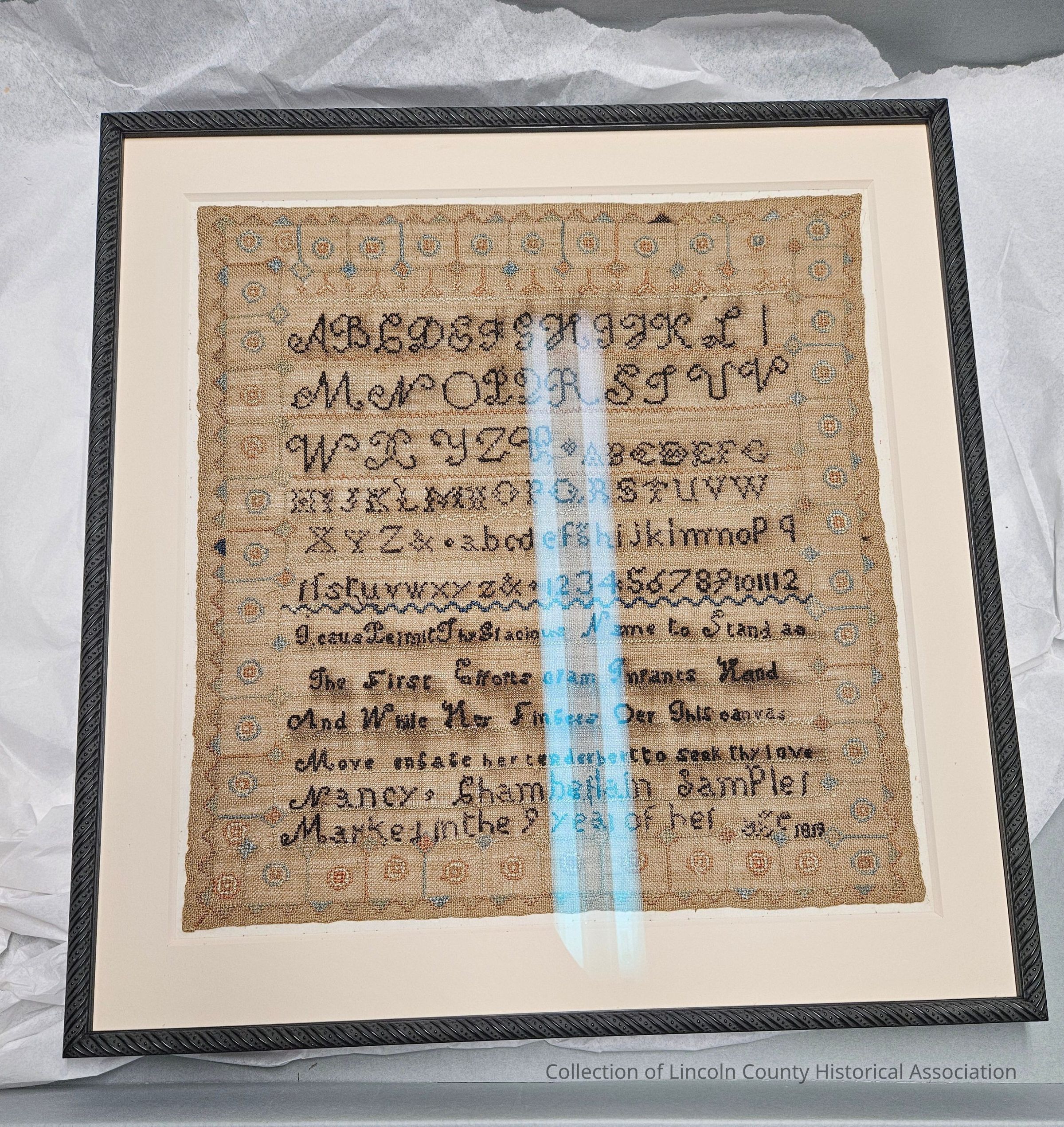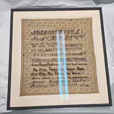 "Jesus Permit Thy Gracious Name to Stand as The First Efforts of an Infants Hand and While her Fingers on Oer This canvas Move engage her tender hert to seek thy love Nancy, Chamberlain Sampler Marked in the 9 Year of her age 1819"Notes