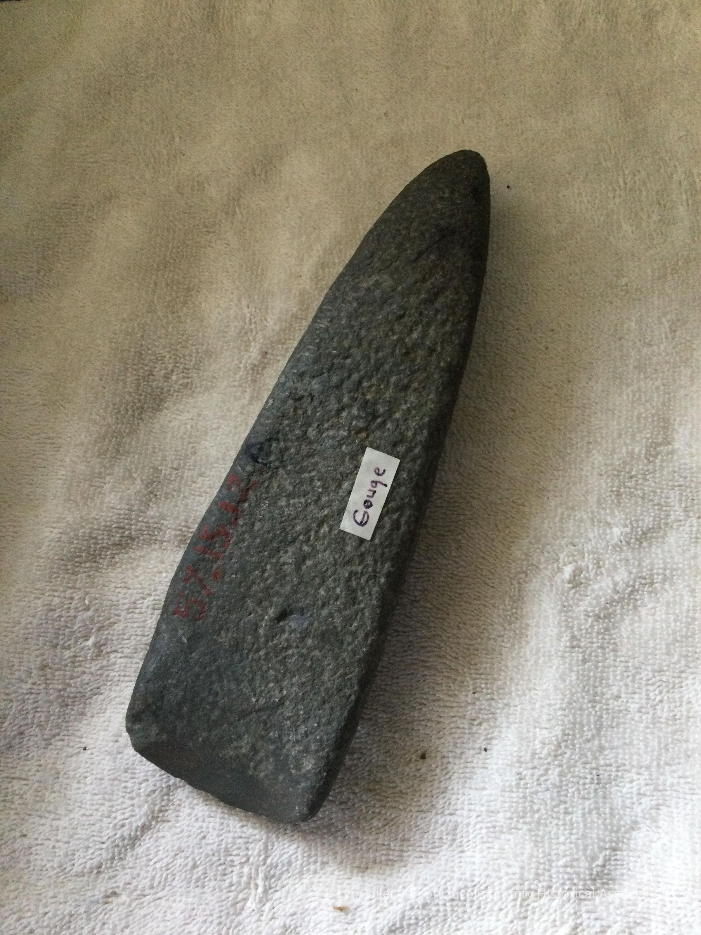 Finely shaped Native American stone celt (gouge/chisel) with hand-held end coming to a smooth point.Made/Created